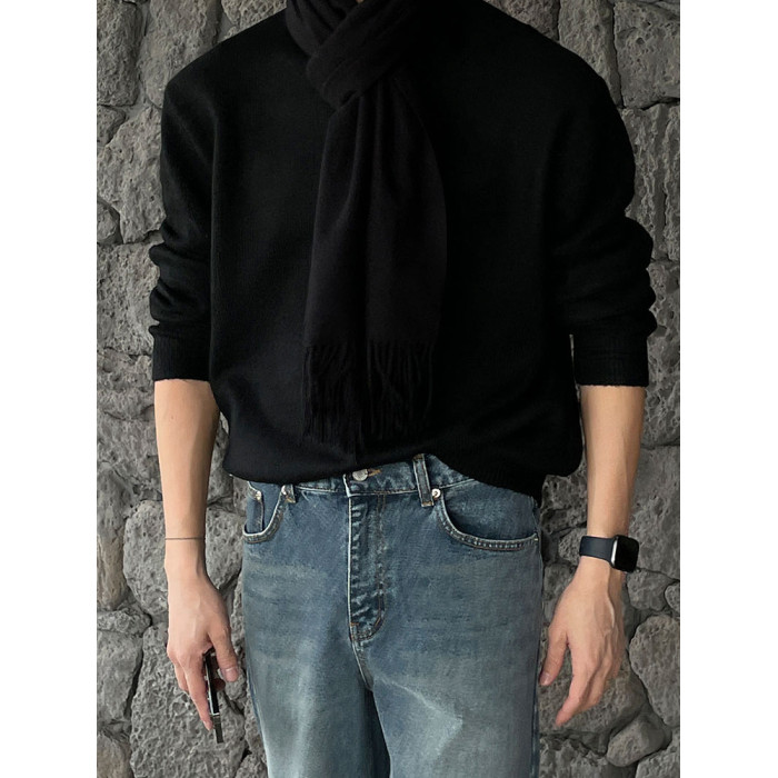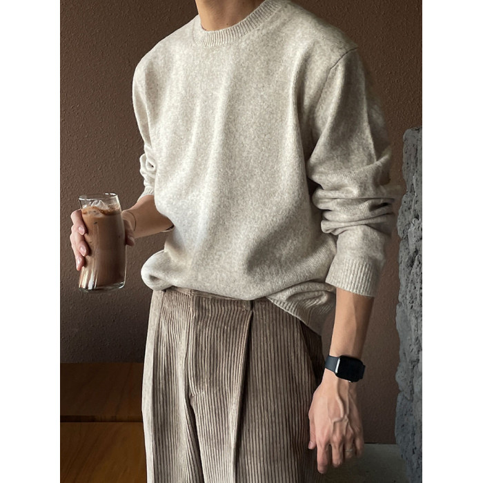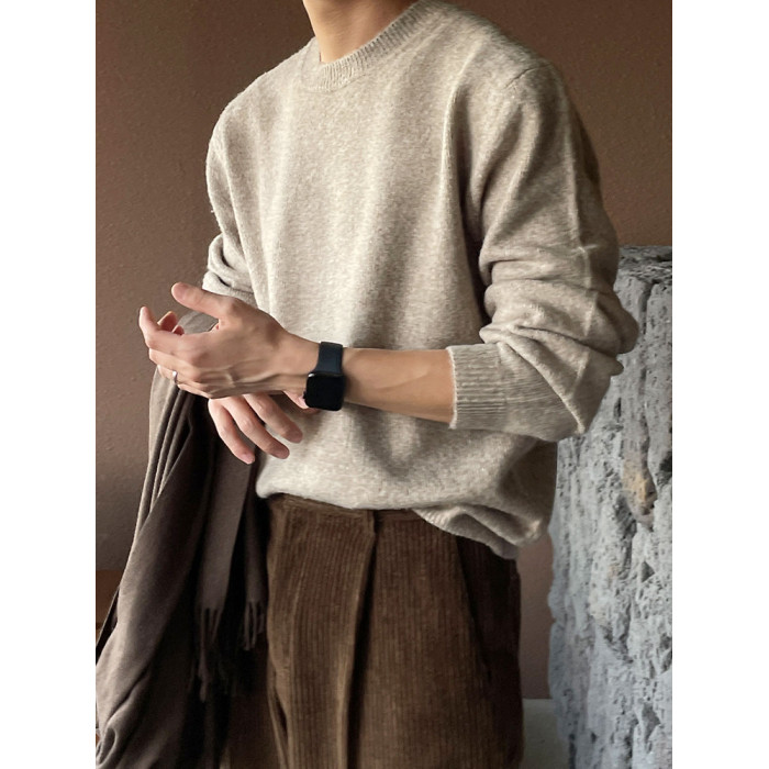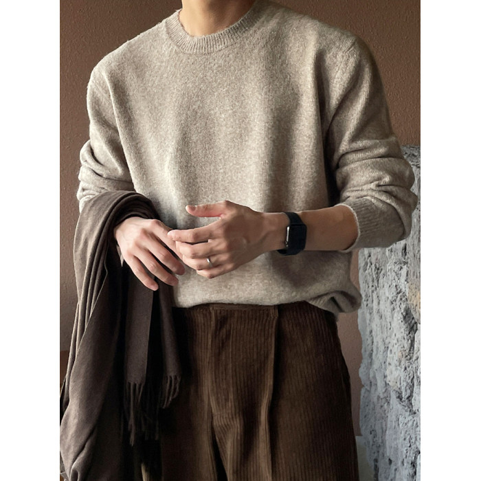 卡其色毛衣男士秋冬內搭圓領針織長袖打底衫復古寬松慵懶加厚上衣