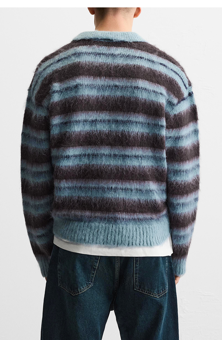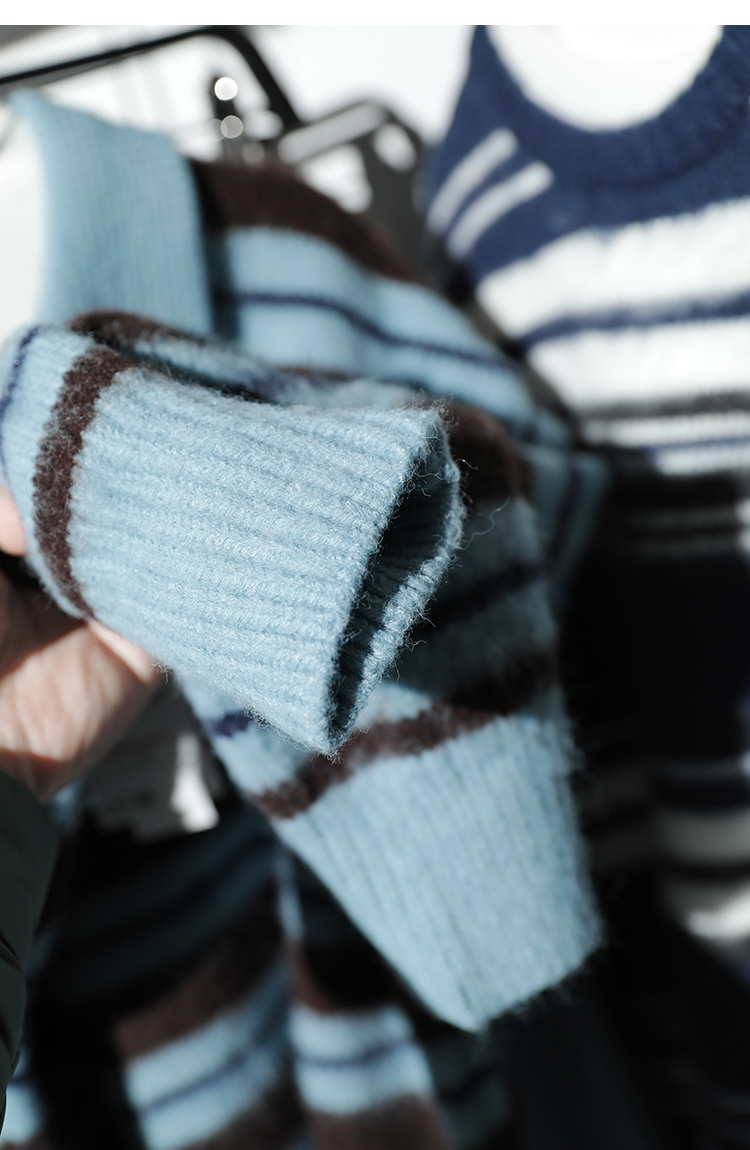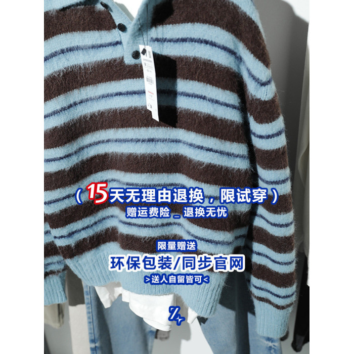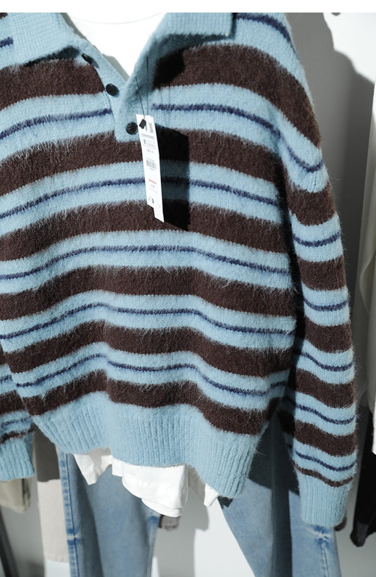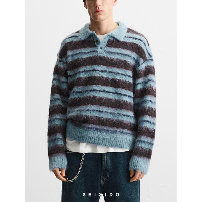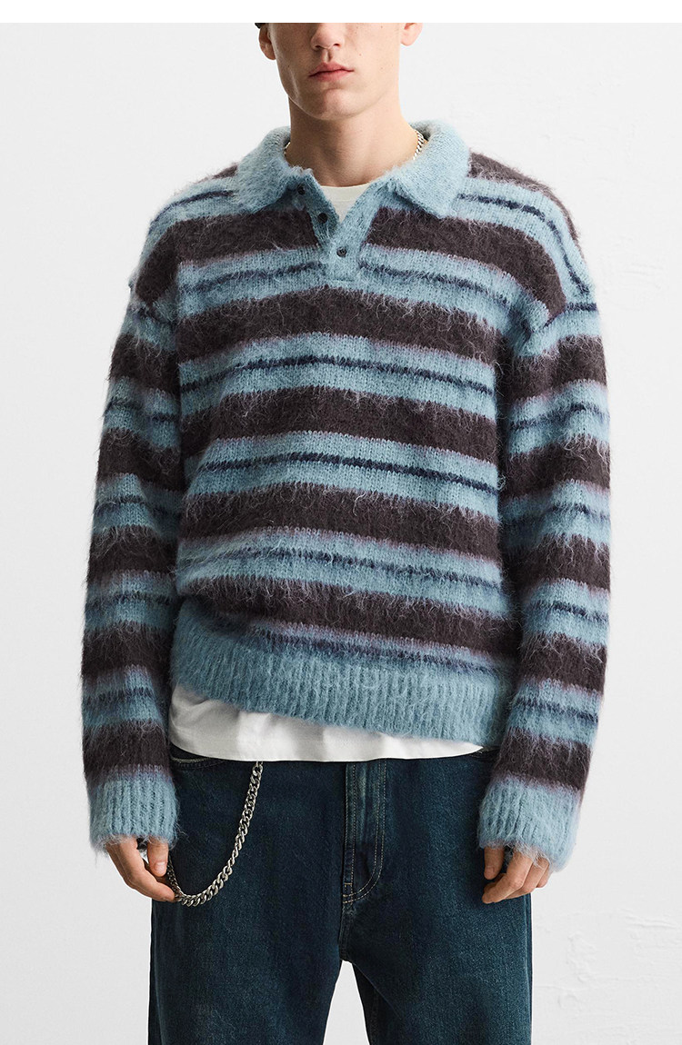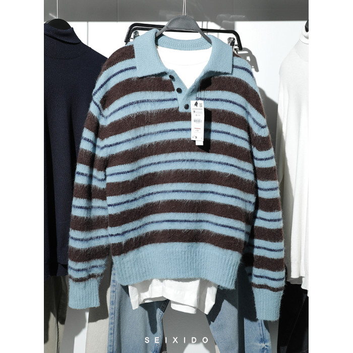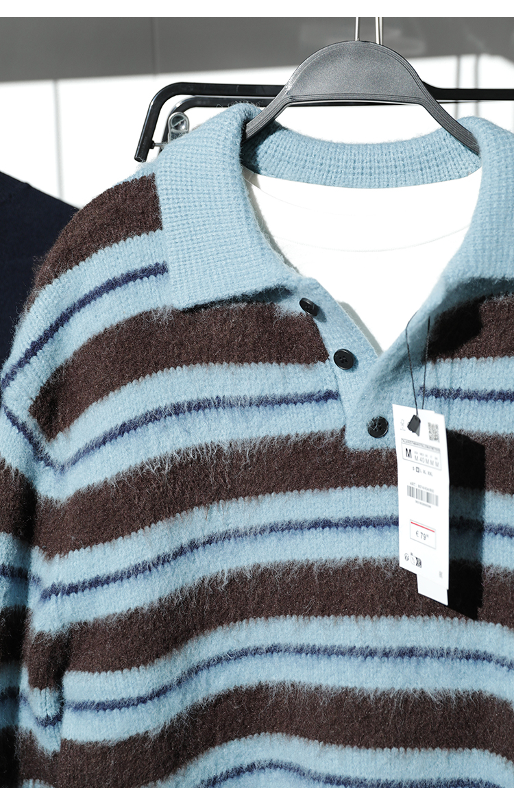 櫃319!秋冬新品男裝歐美簡約拉絨條紋翻領休閒針織衫毛衣9598395