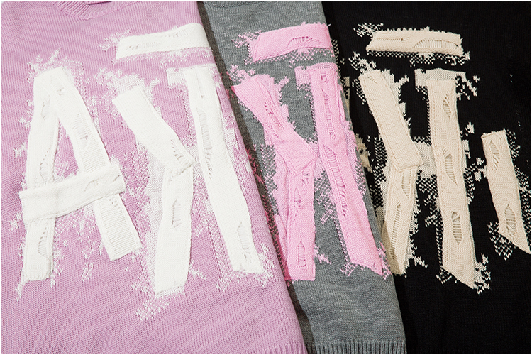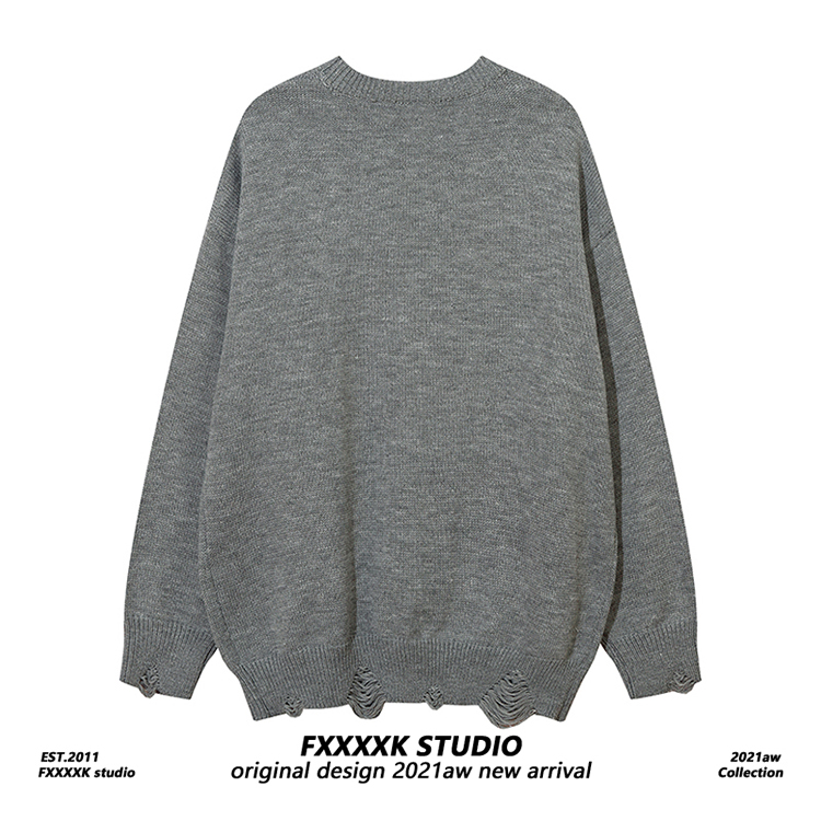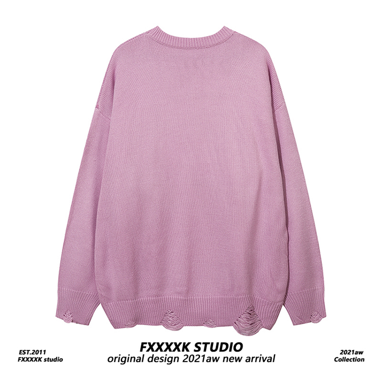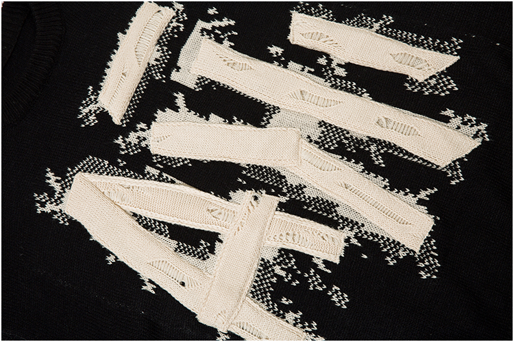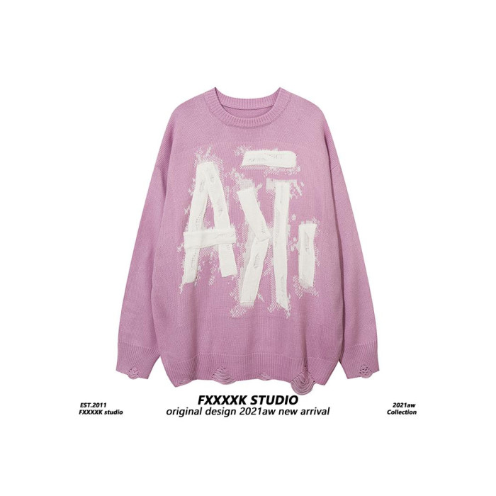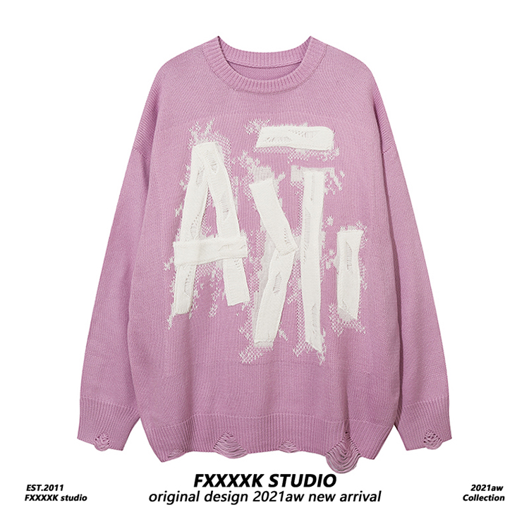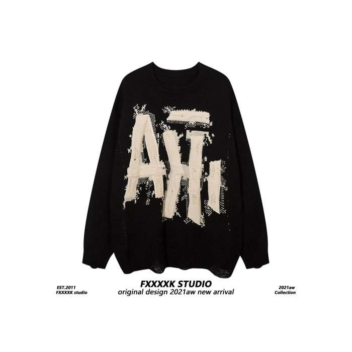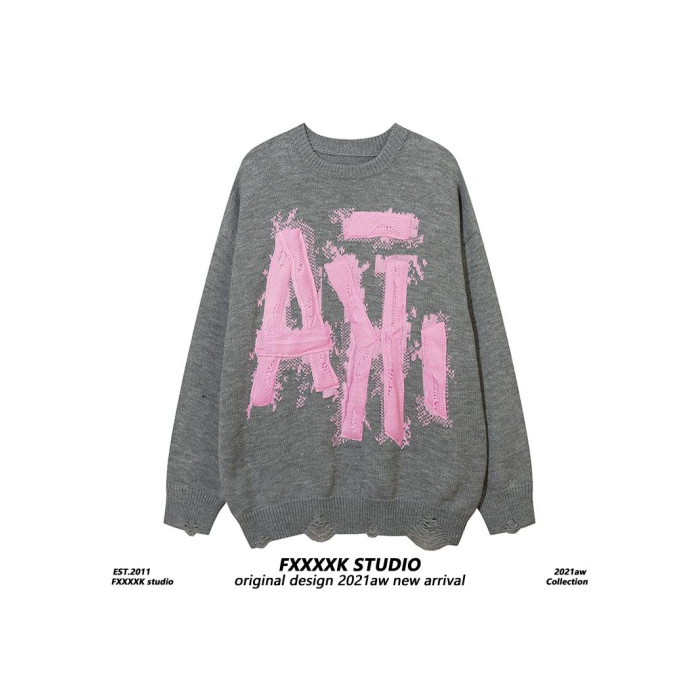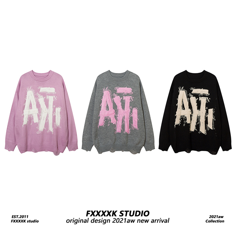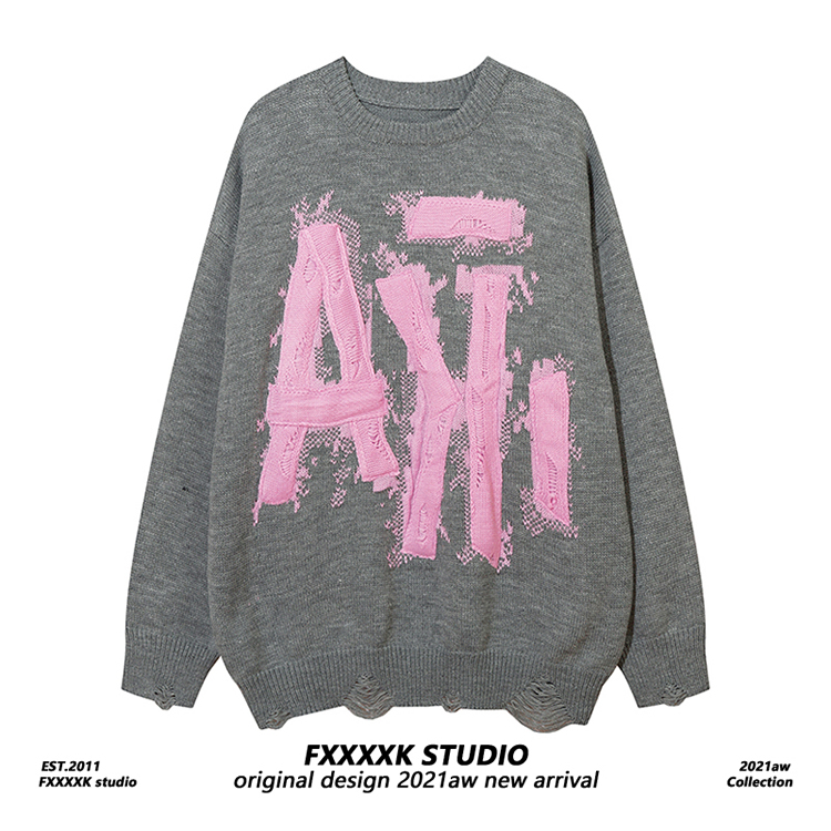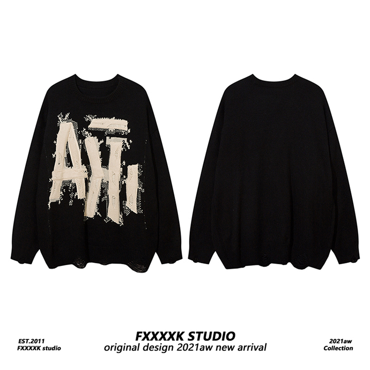 FXK原創 秋冬美式高街潮牌寬松貼布刺綉小衆設計情侶裝針織衫毛衣