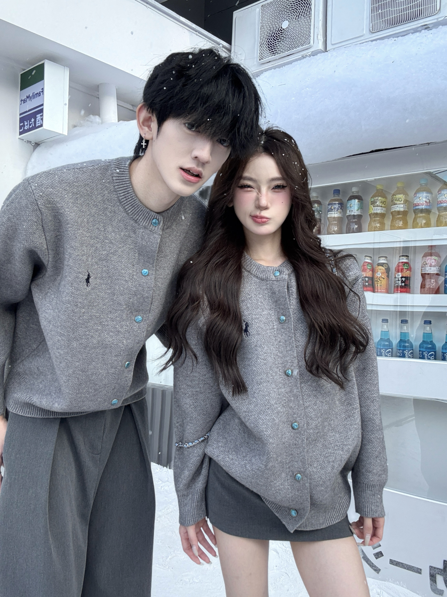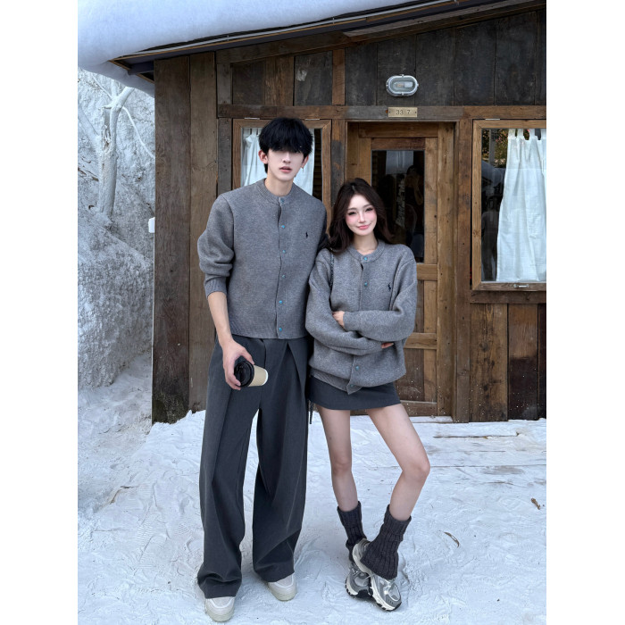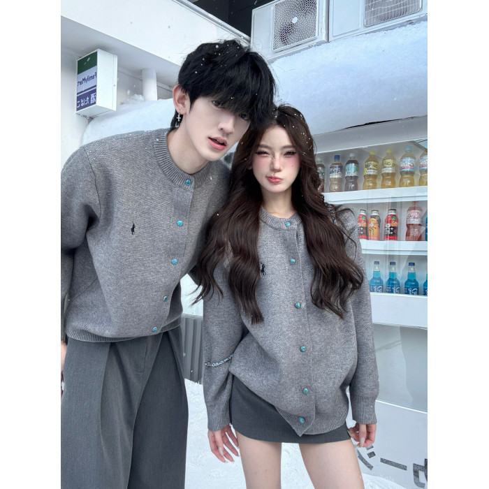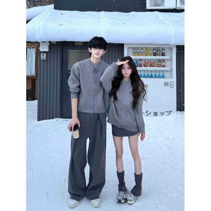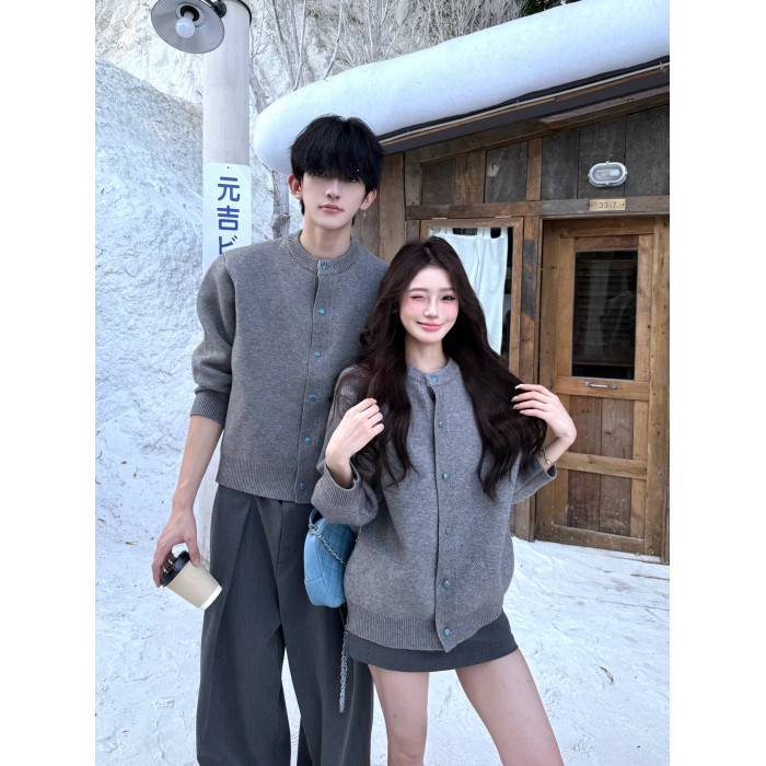 韓系灰色針織開衫男女秋冬季寬松顯瘦百搭cleanfit情侶裝毛衣外套