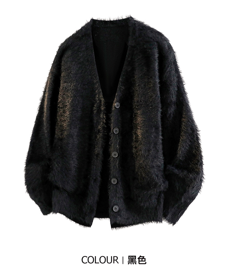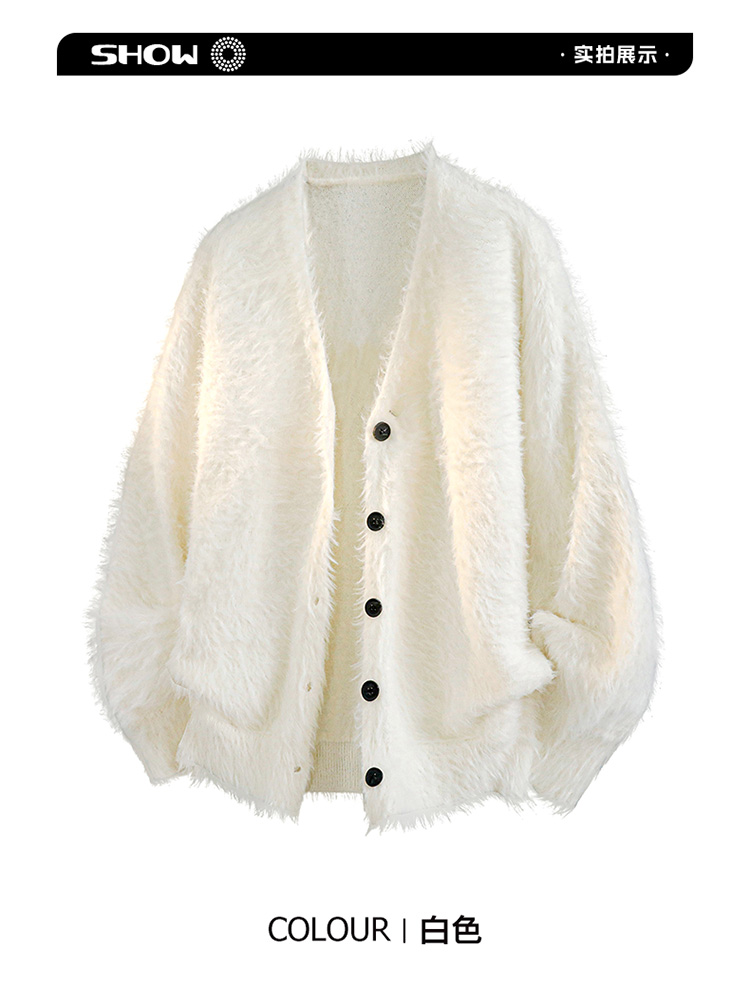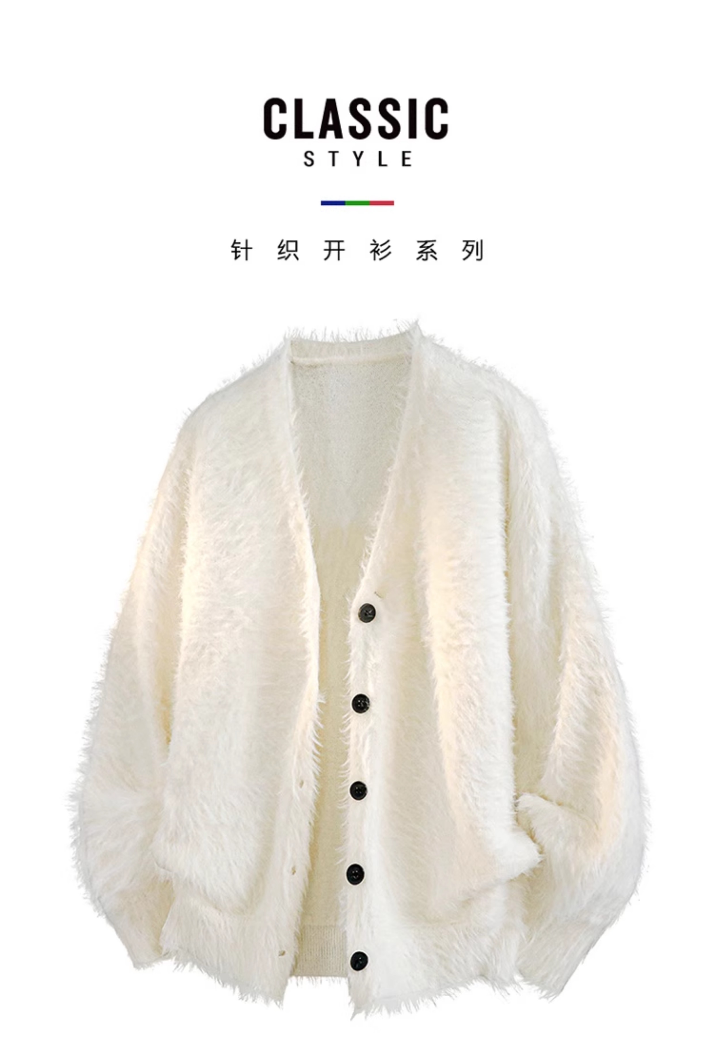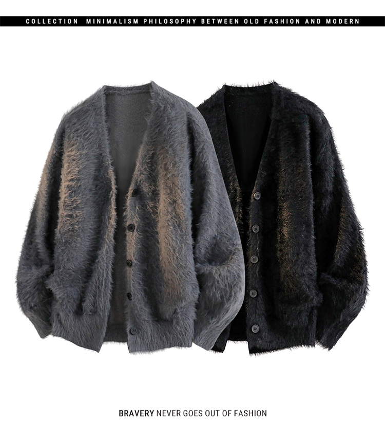 WASSUP ISSUE美式潮牌仿貂絨針織開衫男春秋寬松加絨加厚毛衣外套