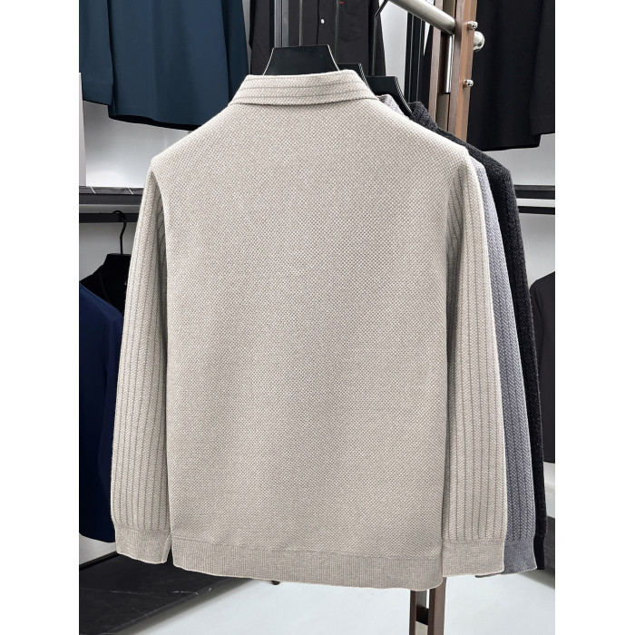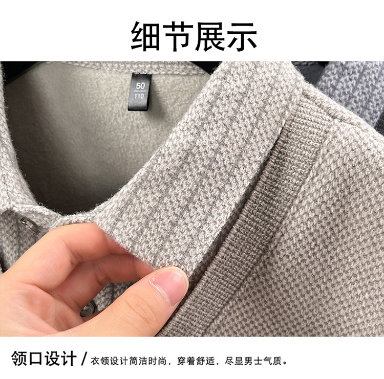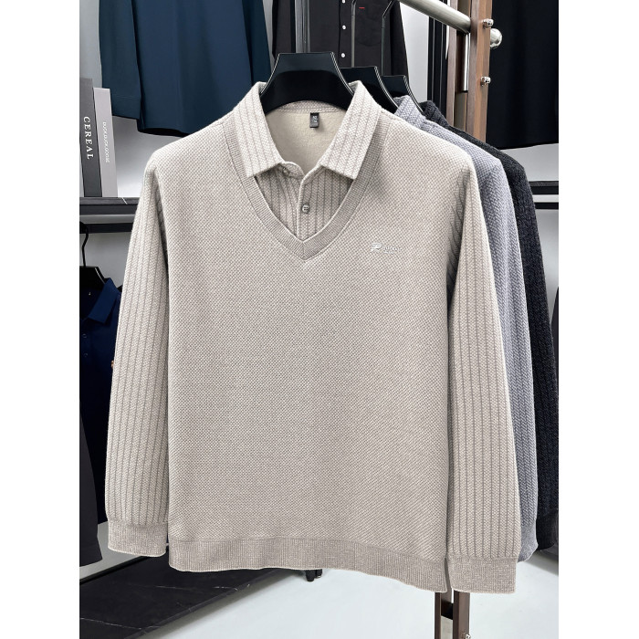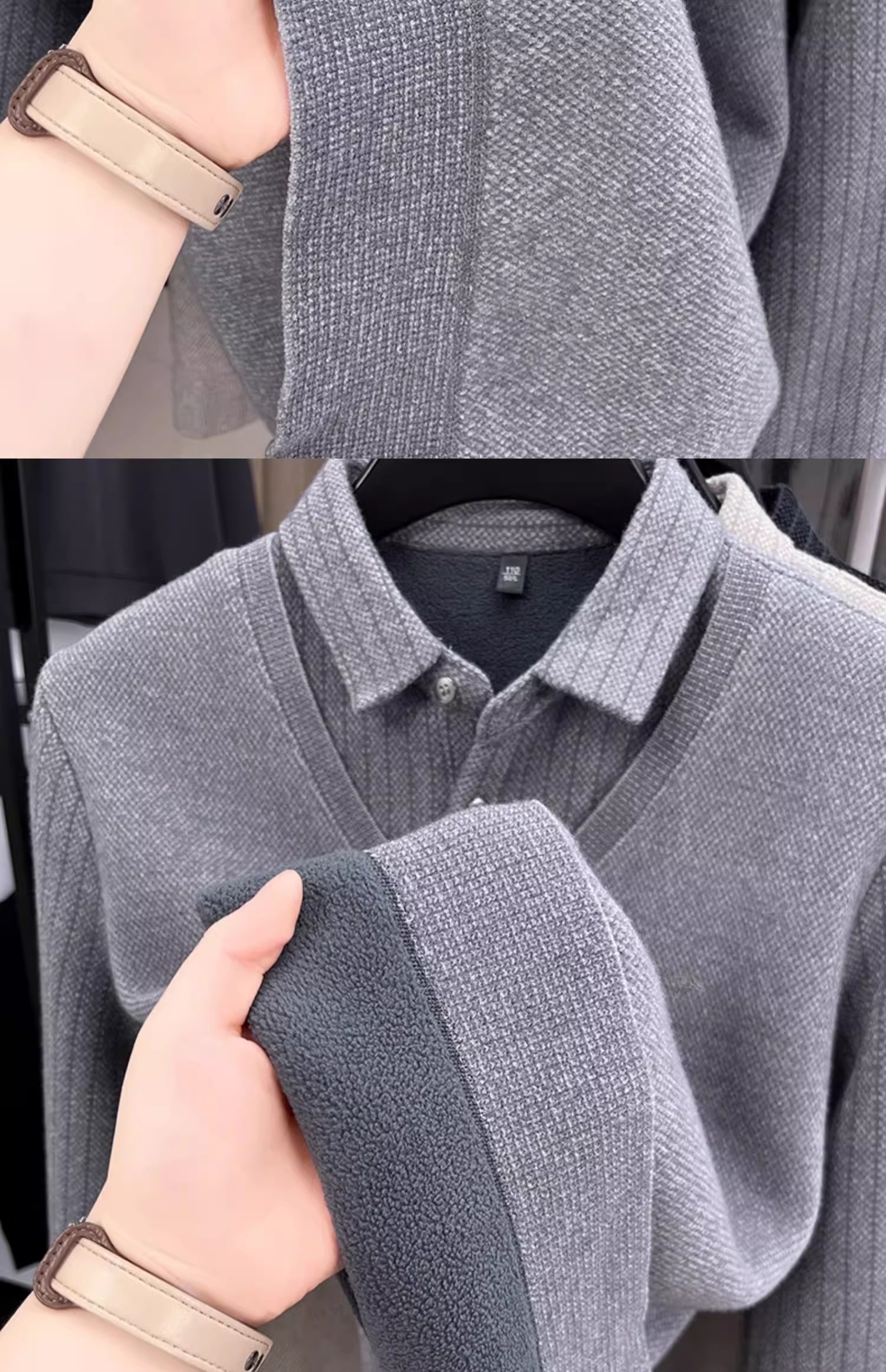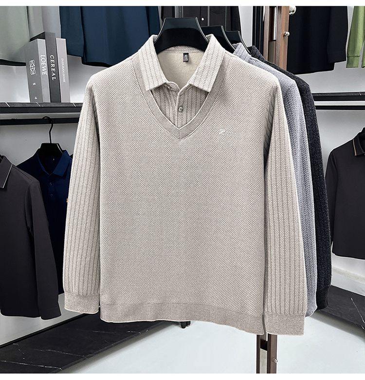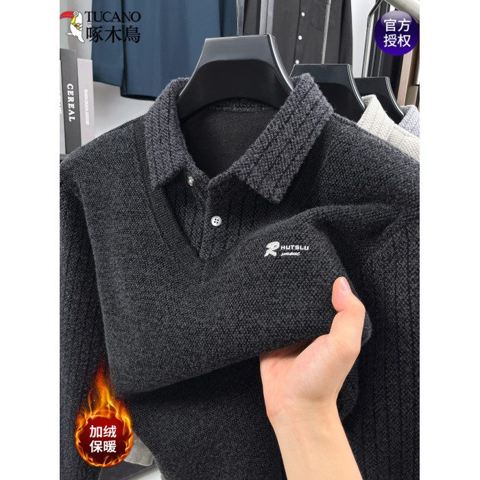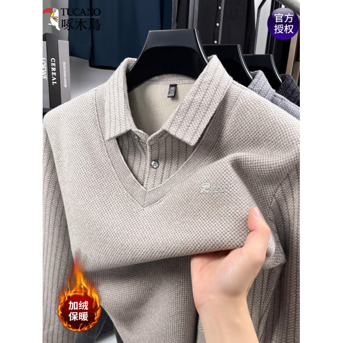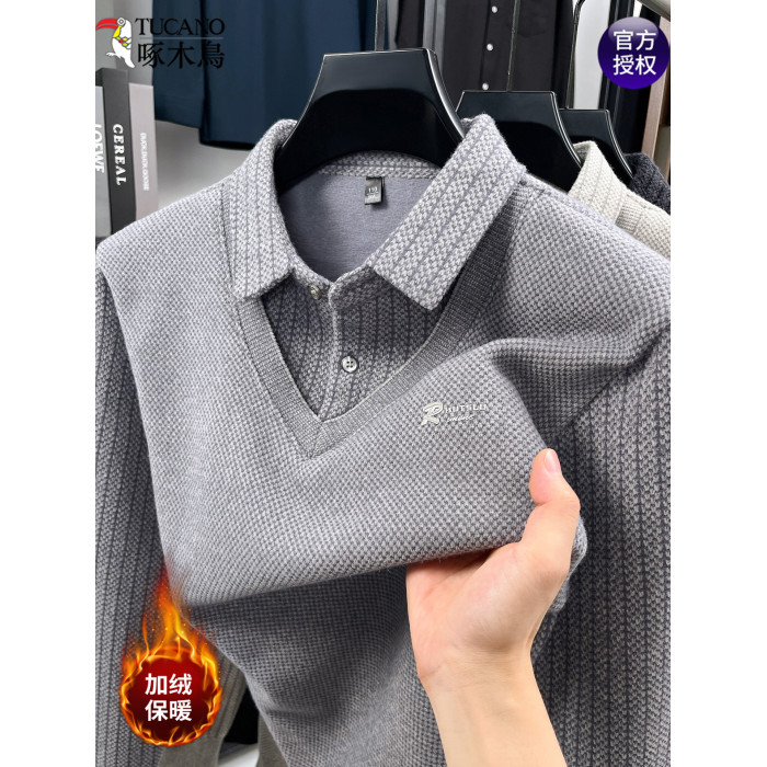 啄木鳥冬季男士中老年假兩件雪貂絨毛衣翻領加絨加厚保暖打底衫潮