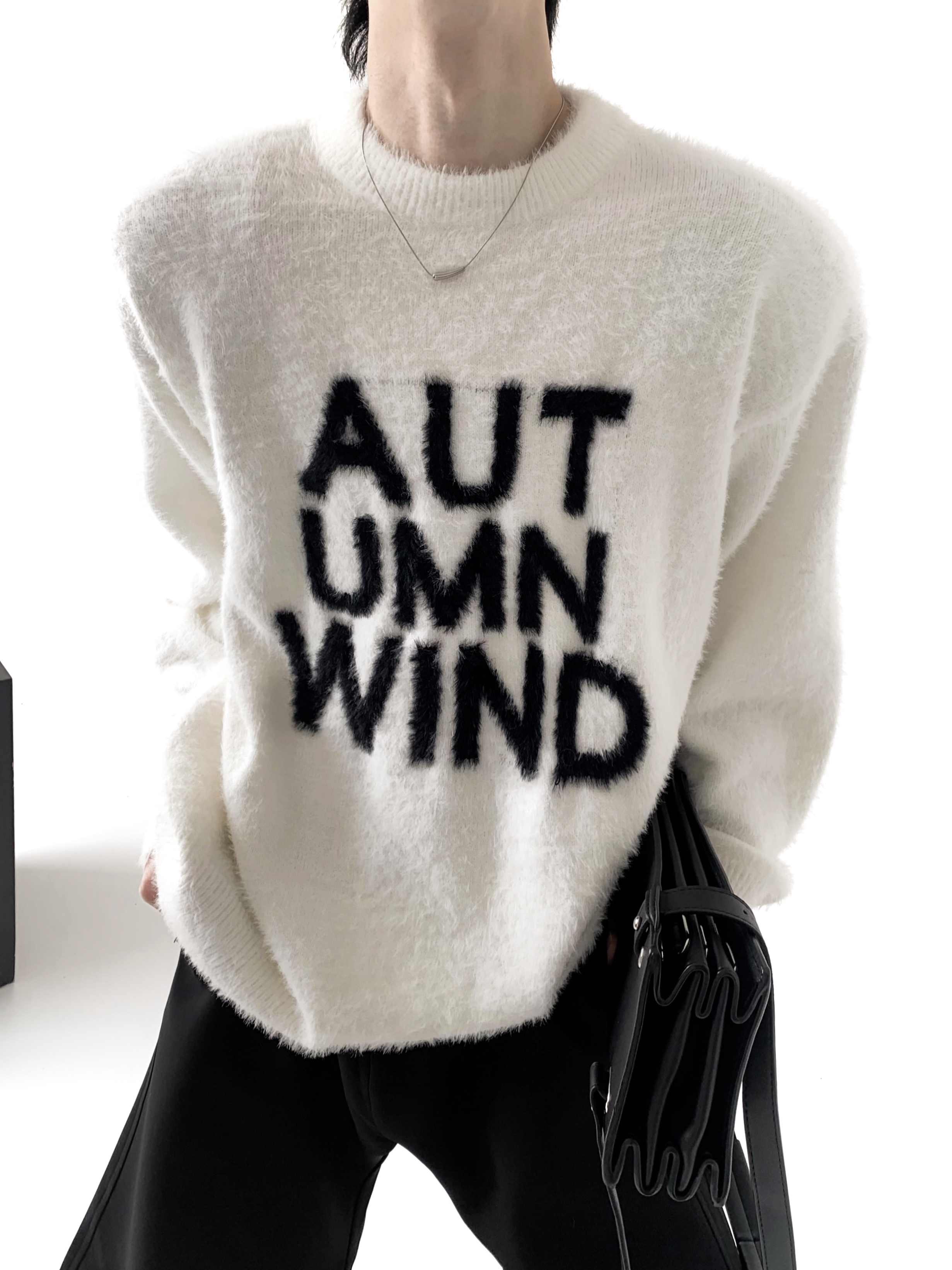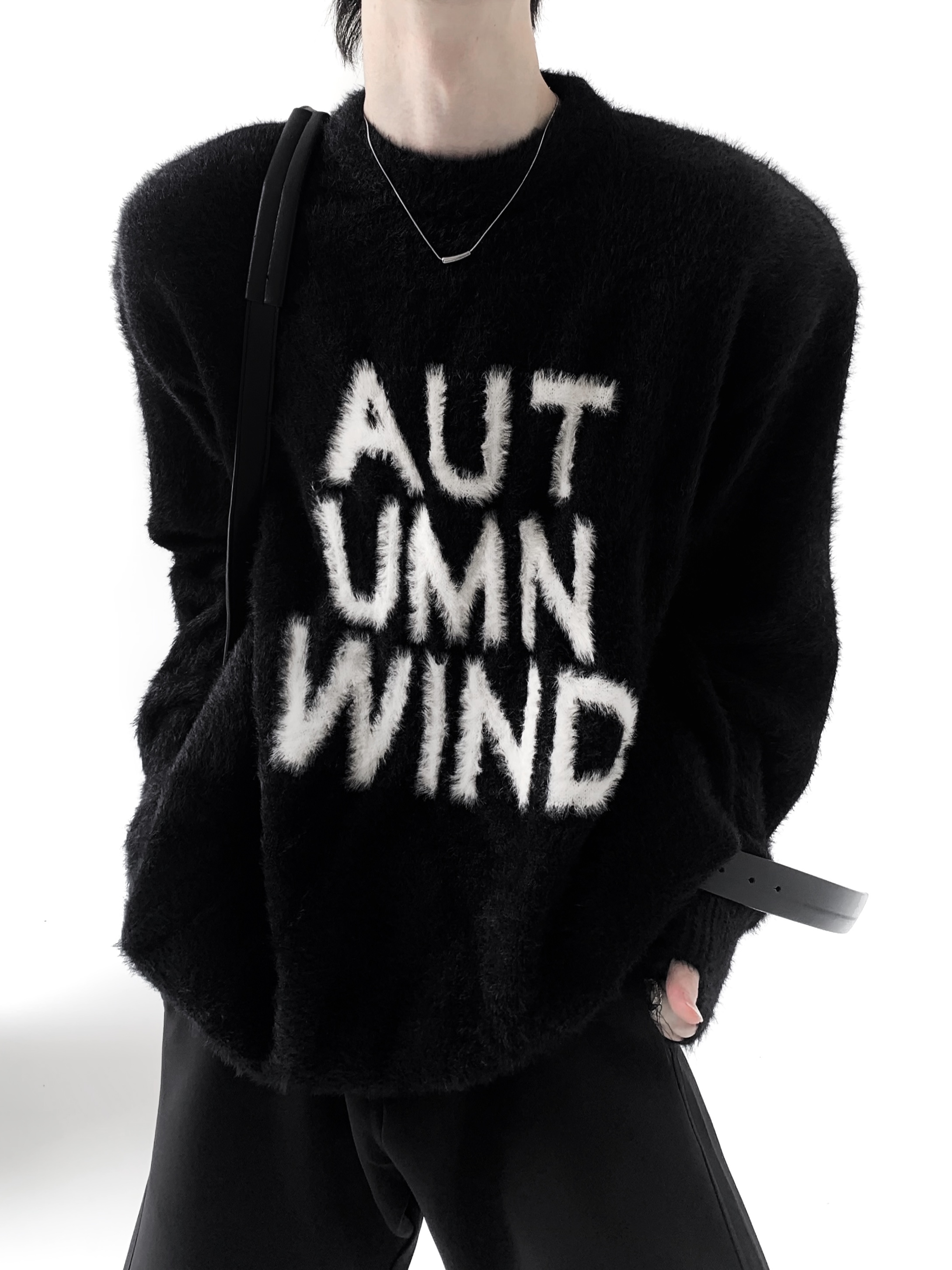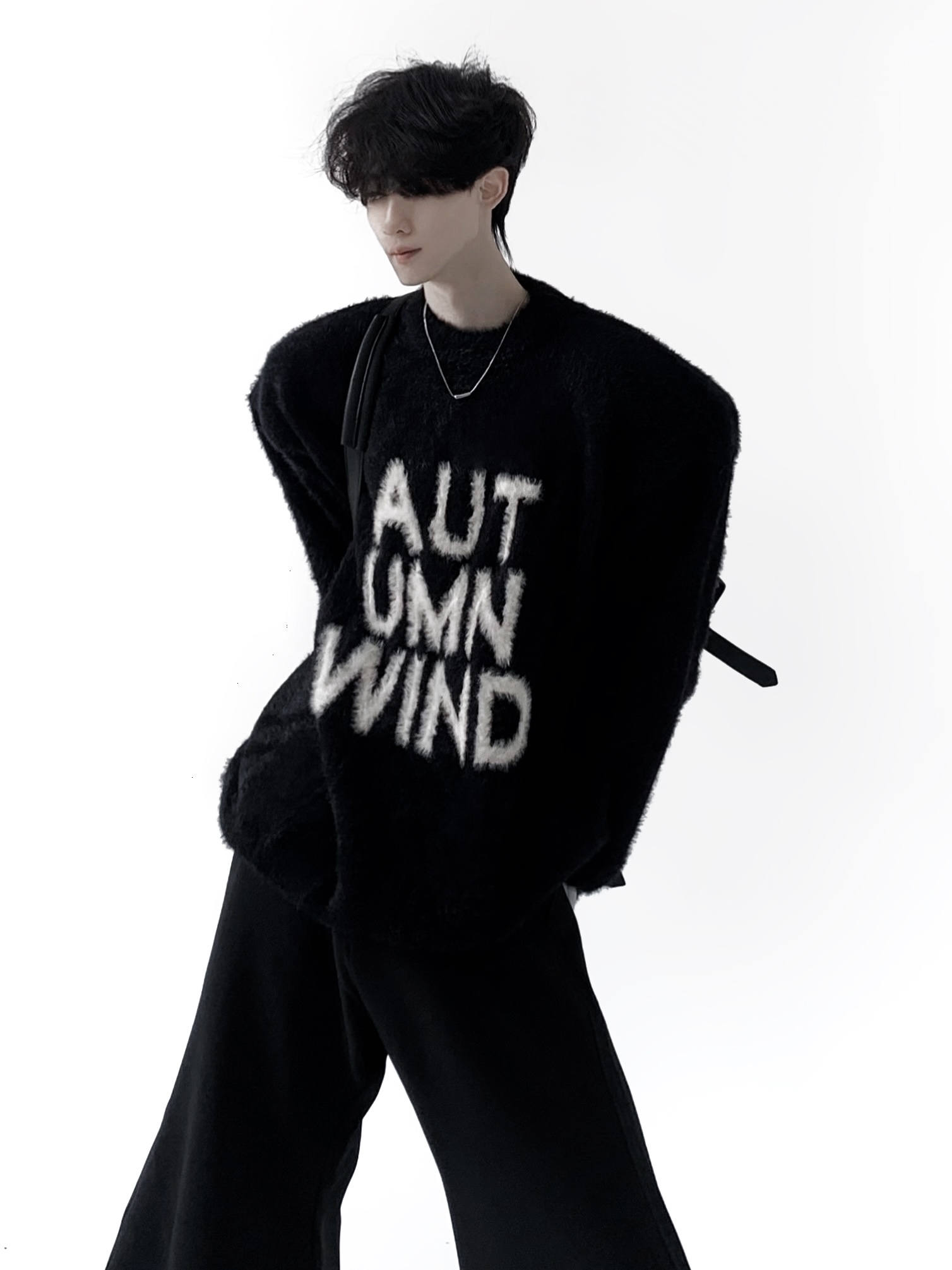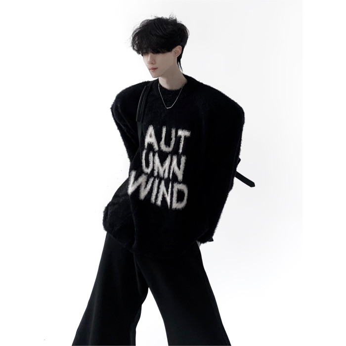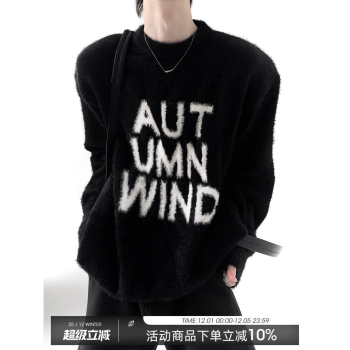 秋山風/黑白氛圍感字母仿貂毛毛衣男慵懶風高級設計感圓領針織衫