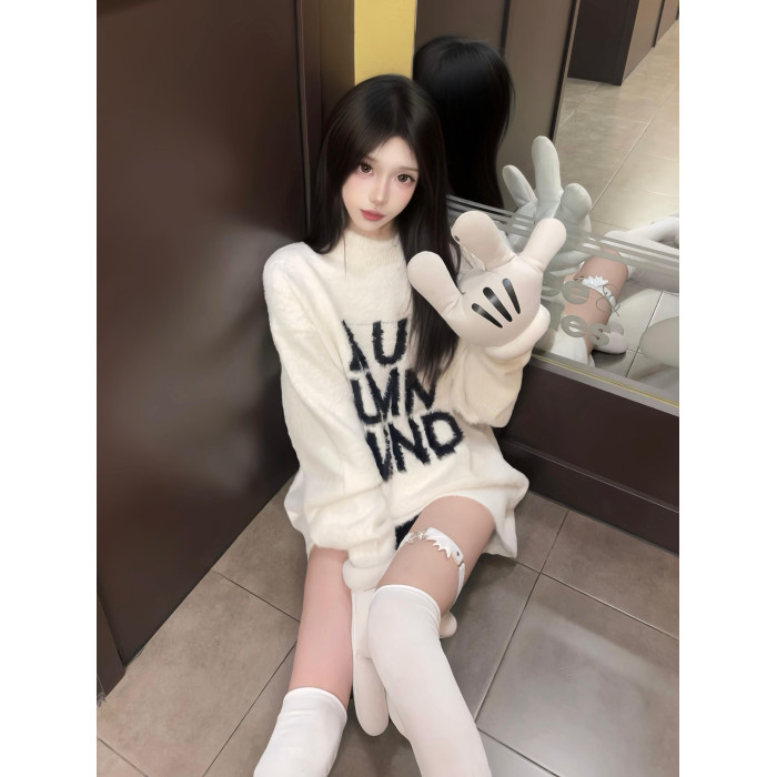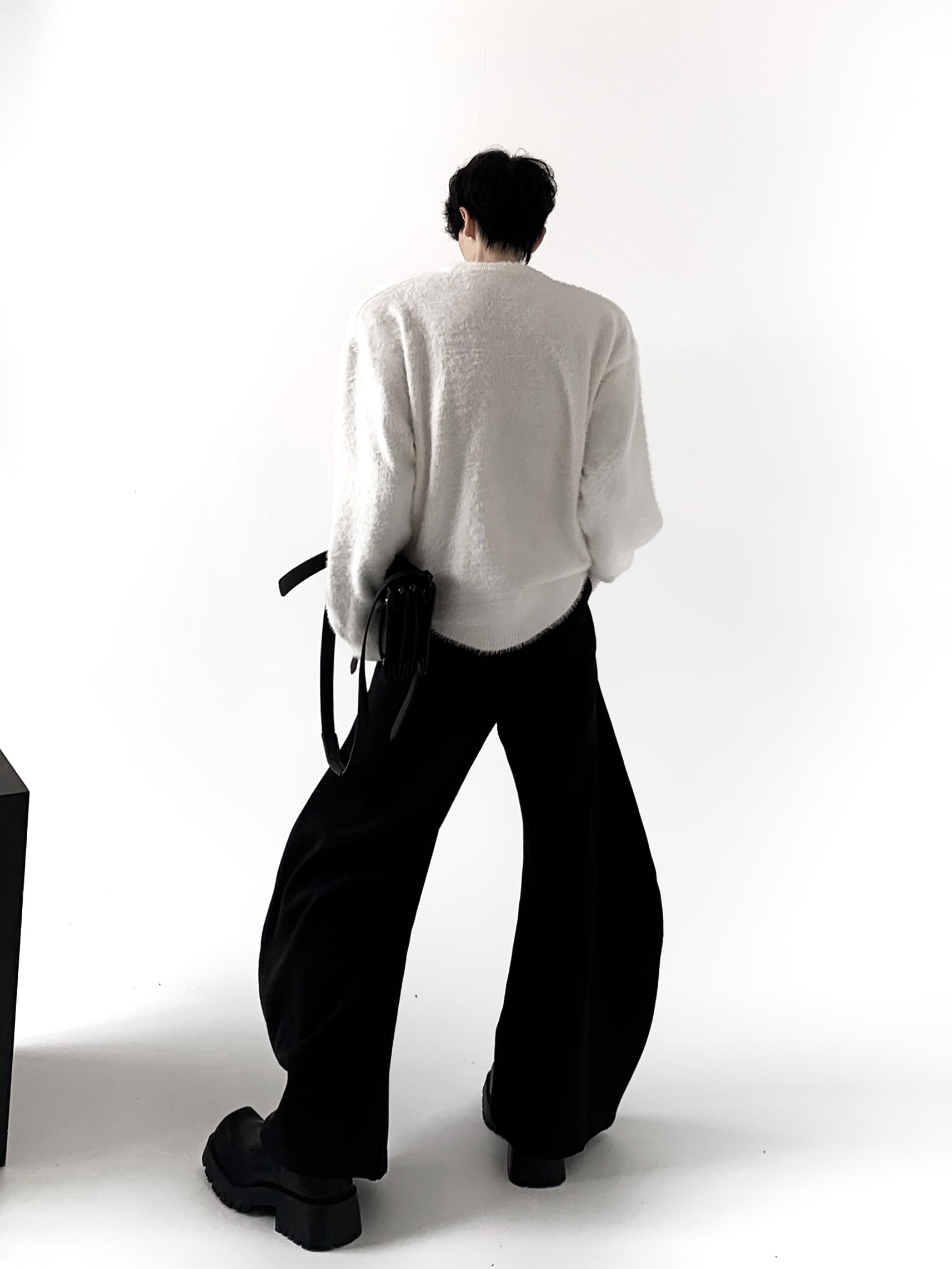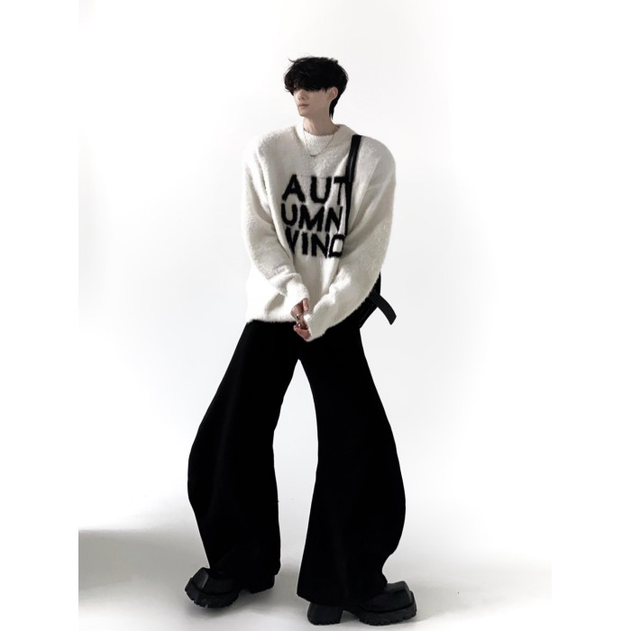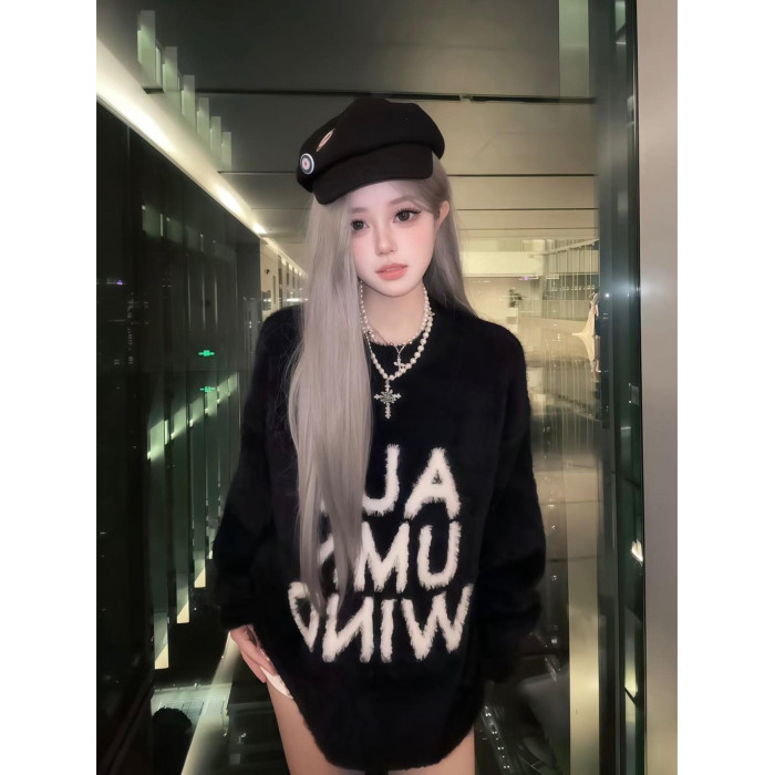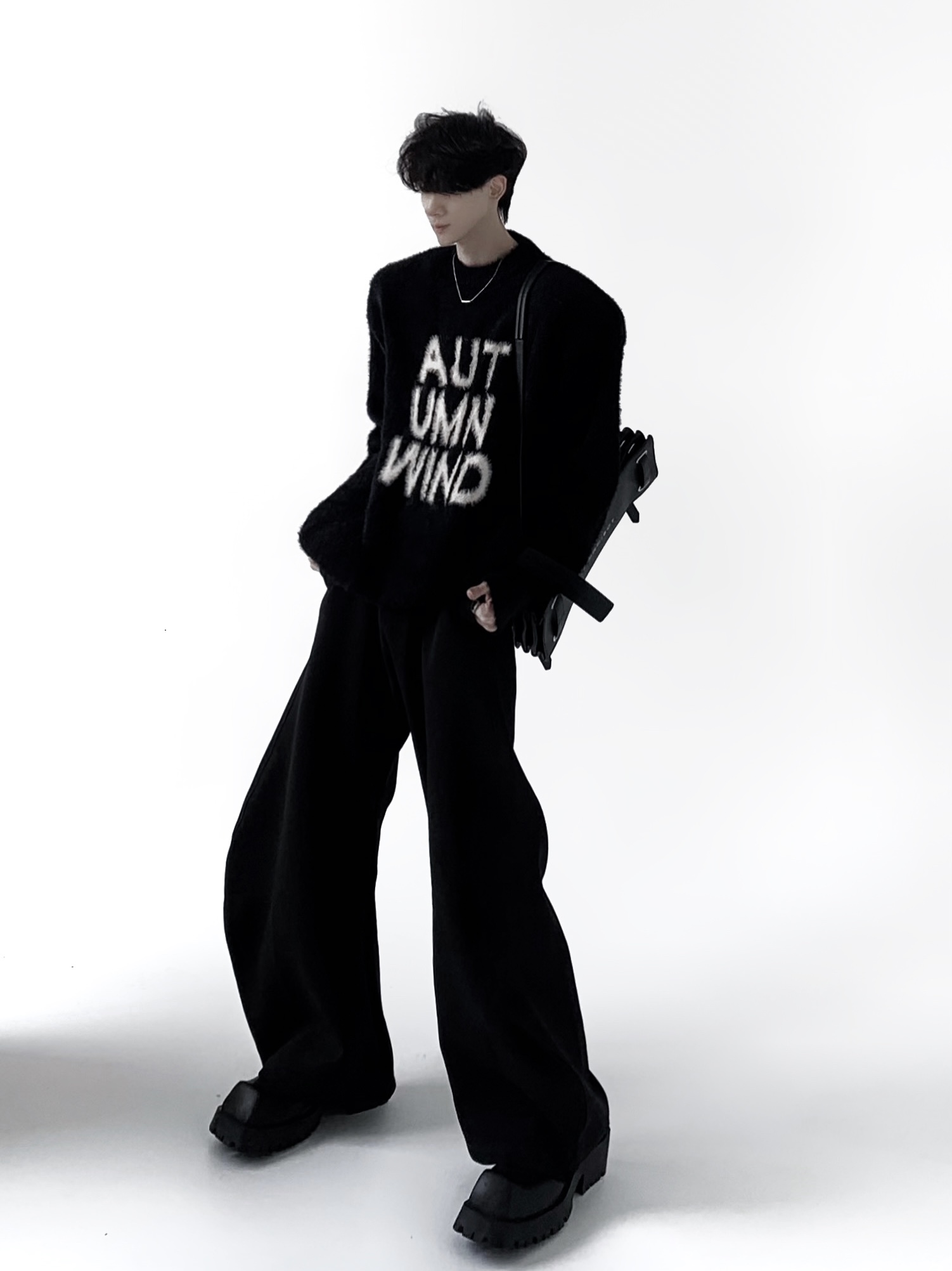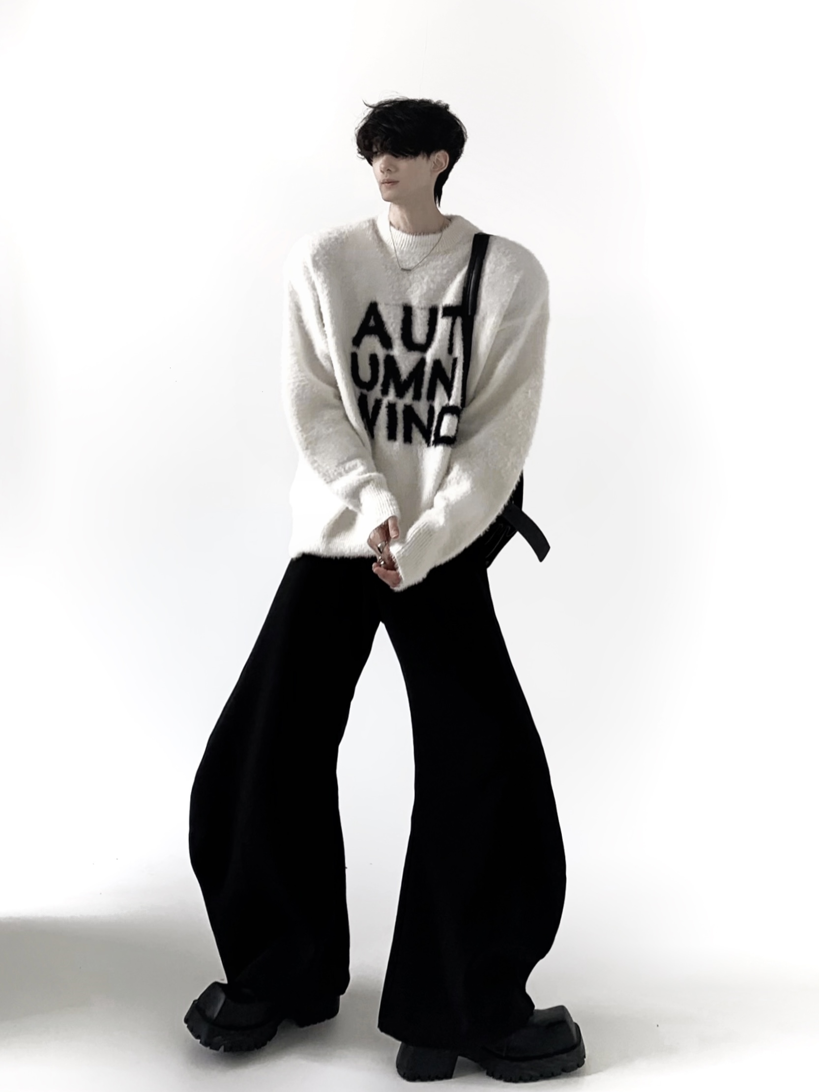 秋山風/黑白氛圍感字母仿貂毛毛衣男慵懶風高級設計感圓領針織衫