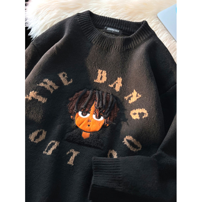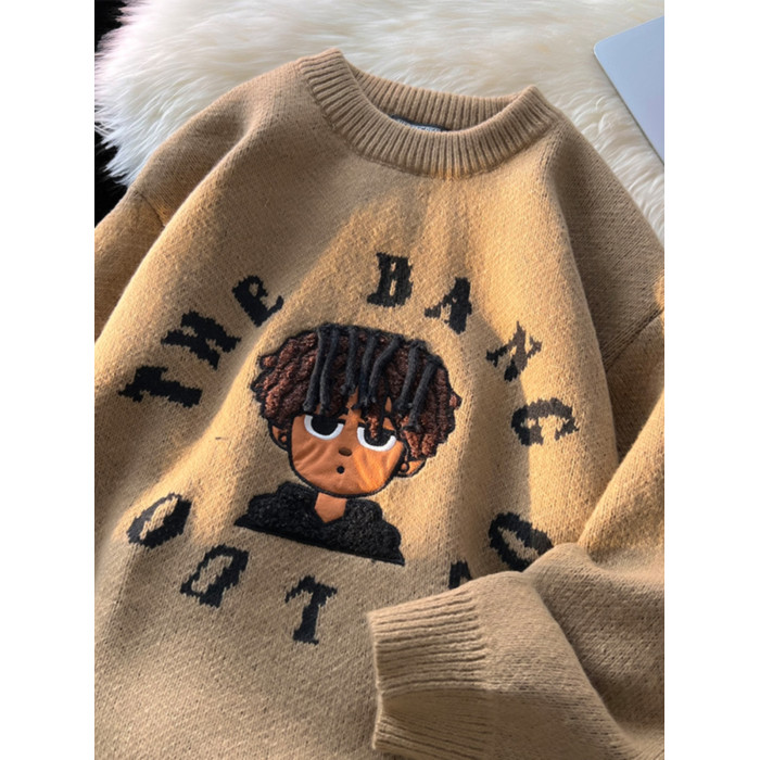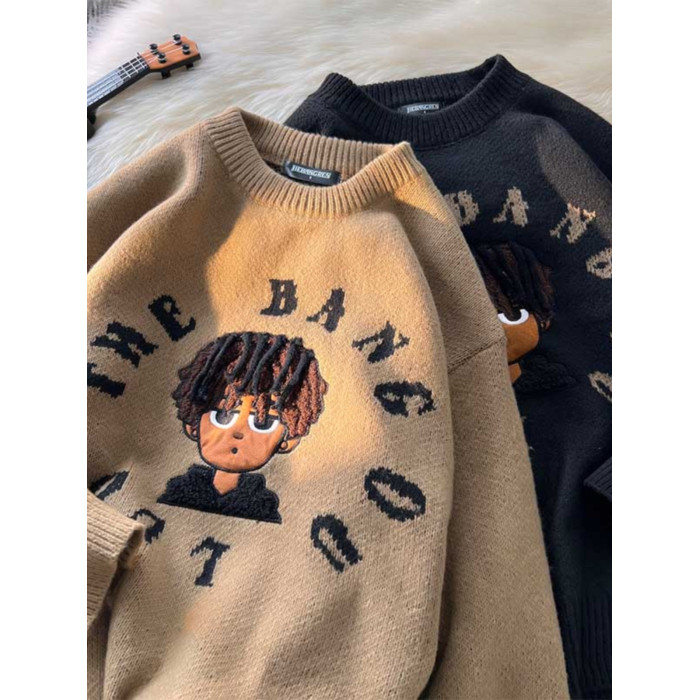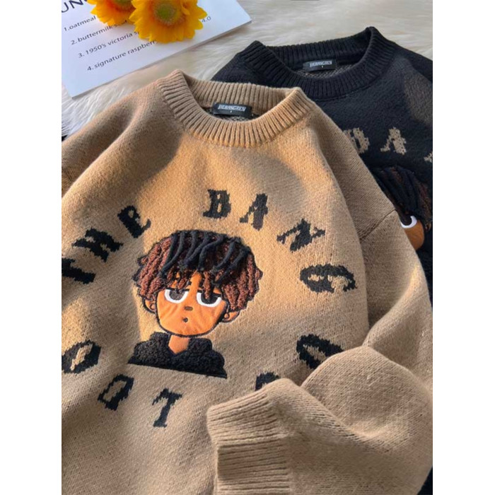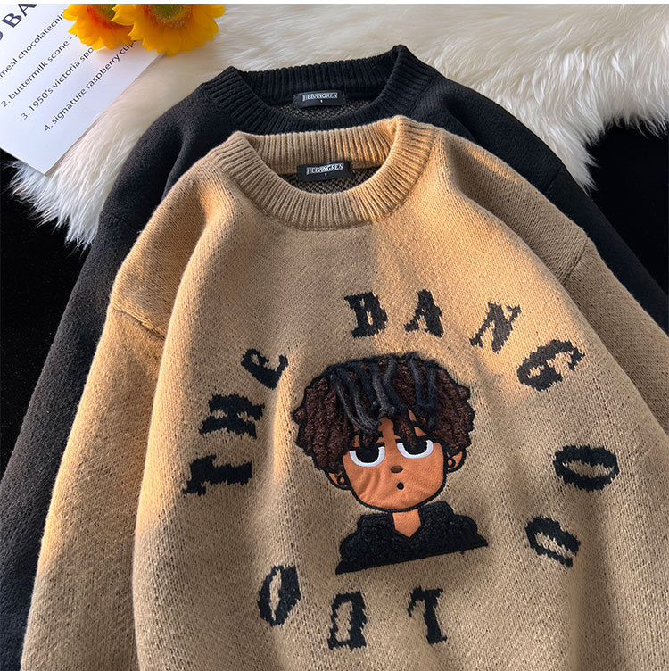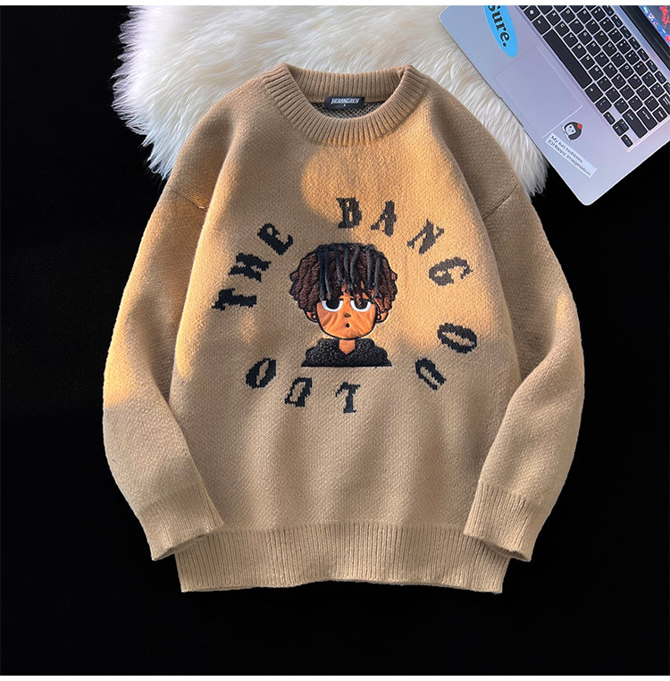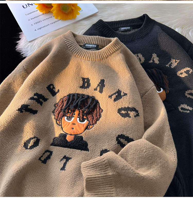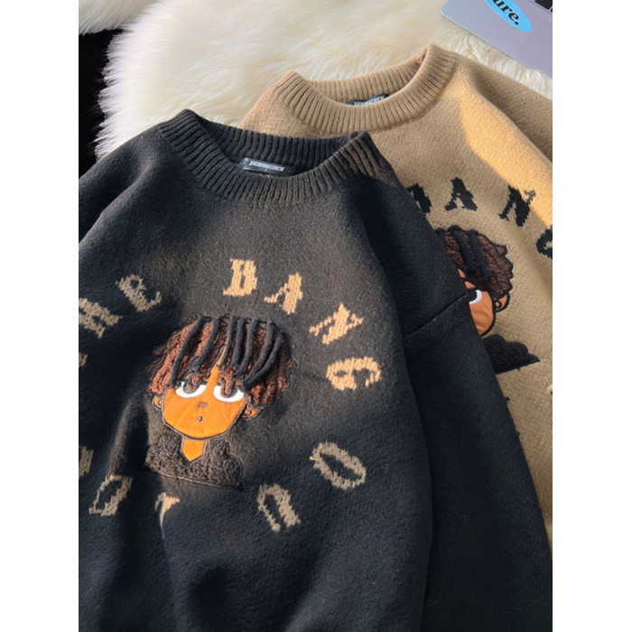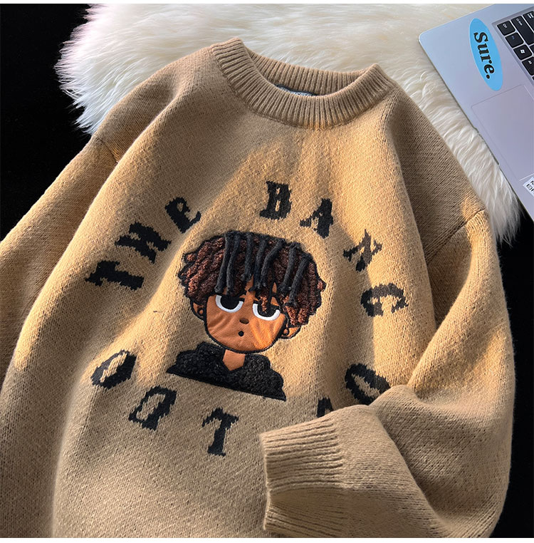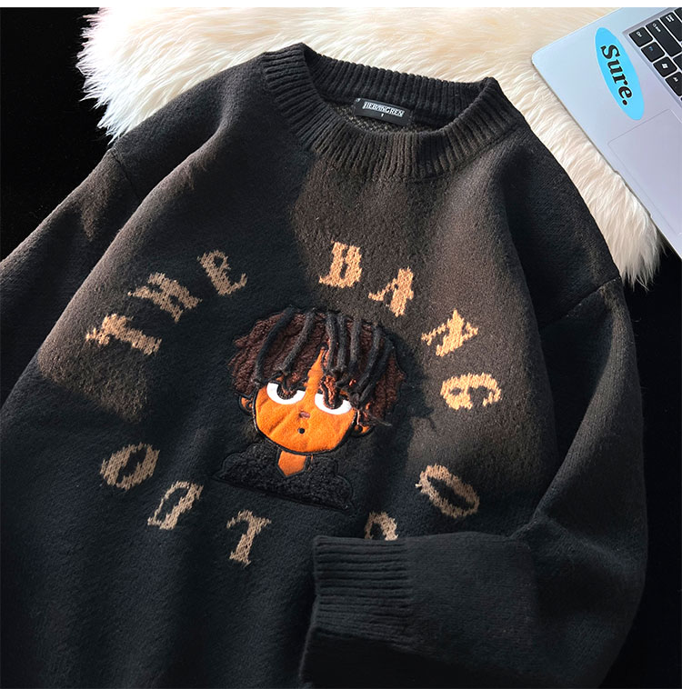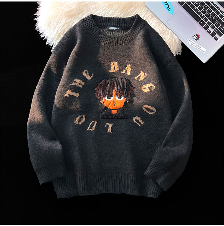 秋冬加厚毛衣男圓領套頭潮牌青少年日系復古百搭設計感小衆針織衫