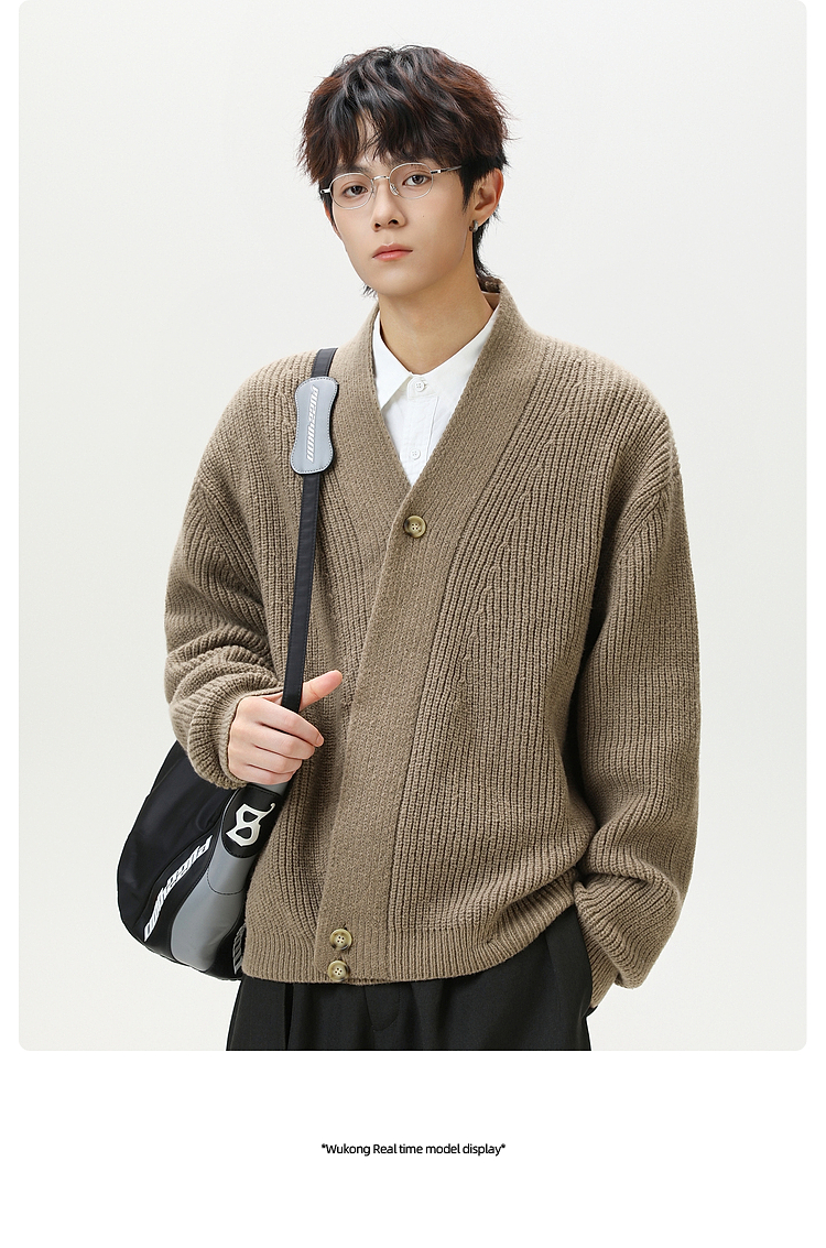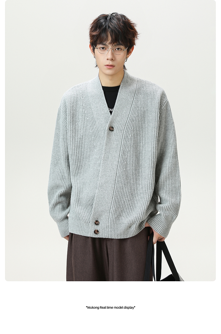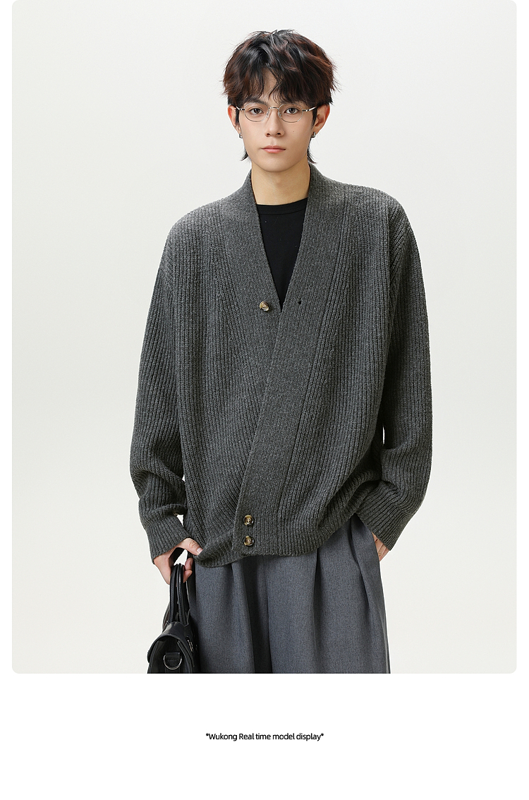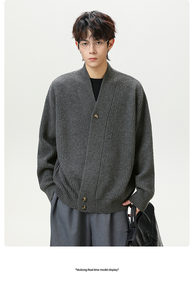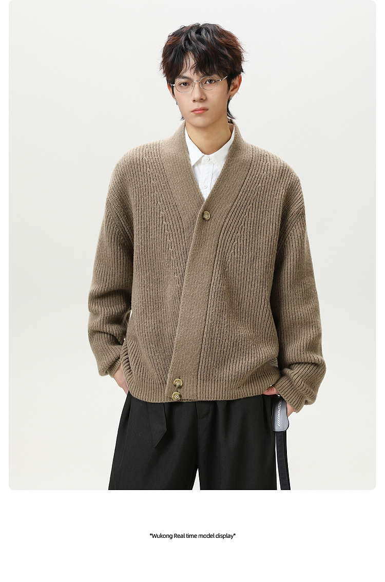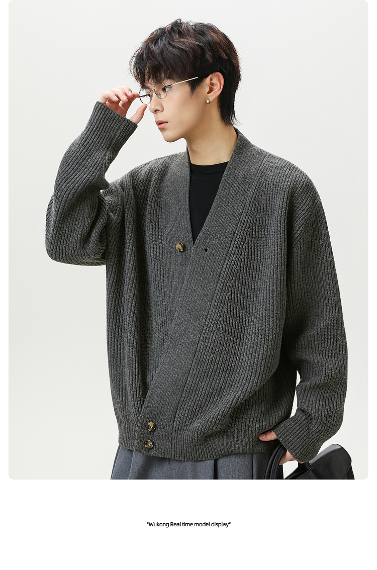悟空有貨不規則斜紐釦開衫V領毛衣男女復古慵懶風情侶道袍針織衫