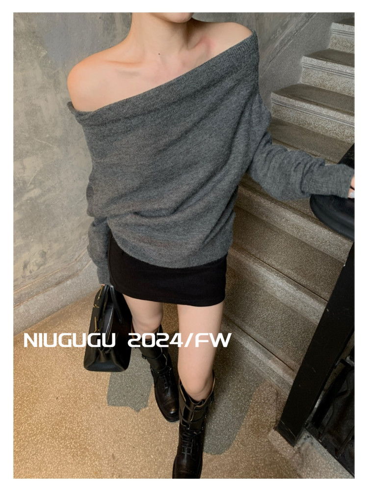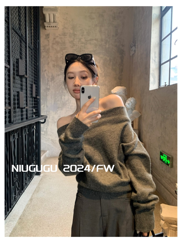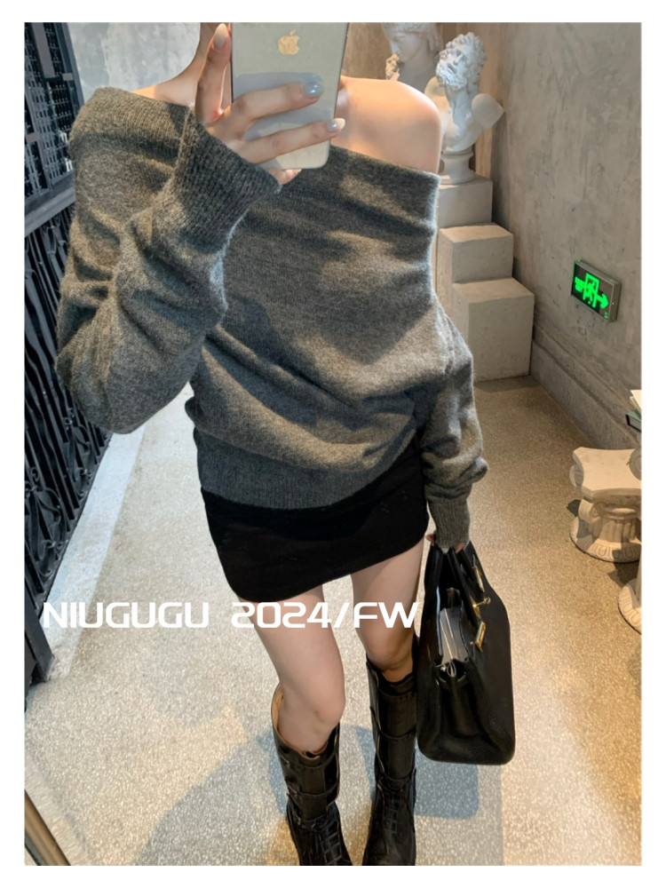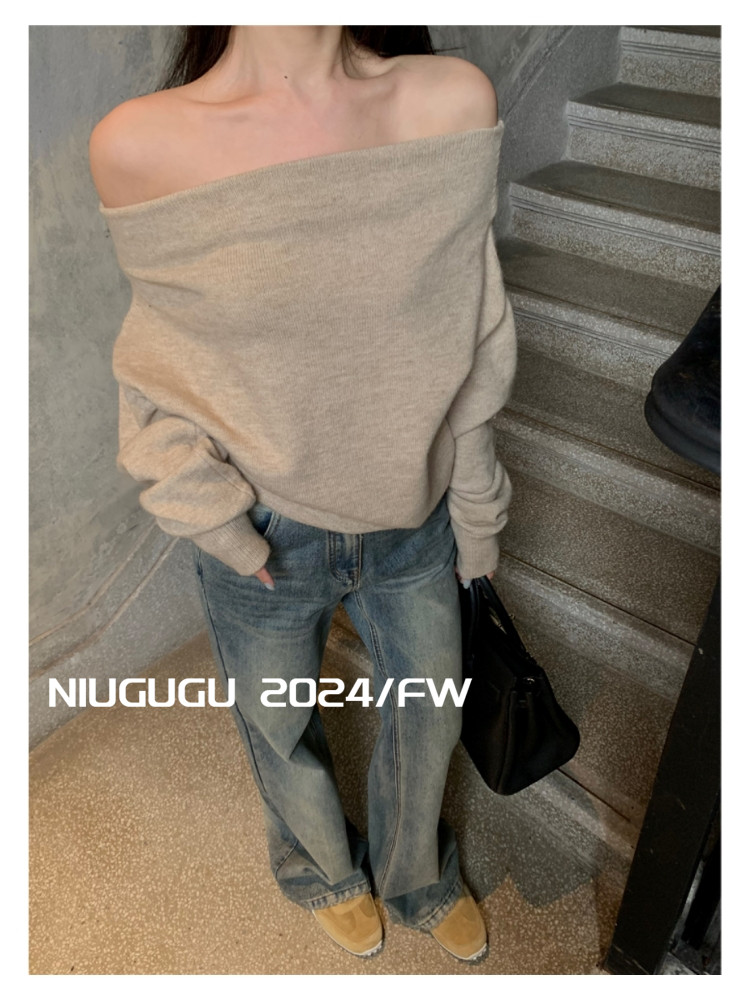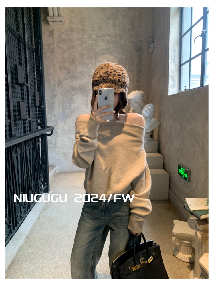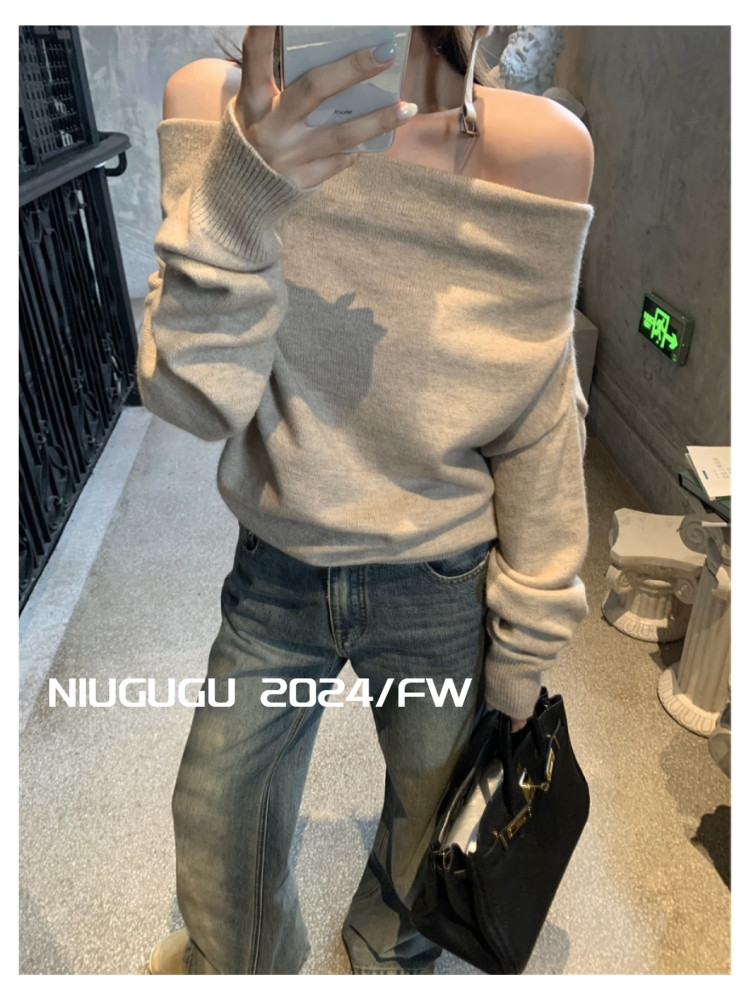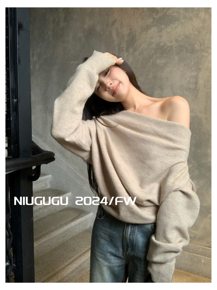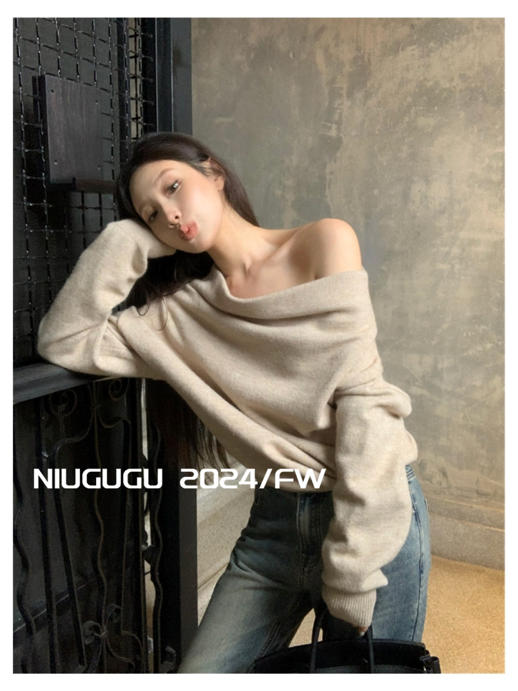 NIUGUGU 法式斜領露肩長袖針織衫女2025秋氣質軟糯簡約套頭毛衣