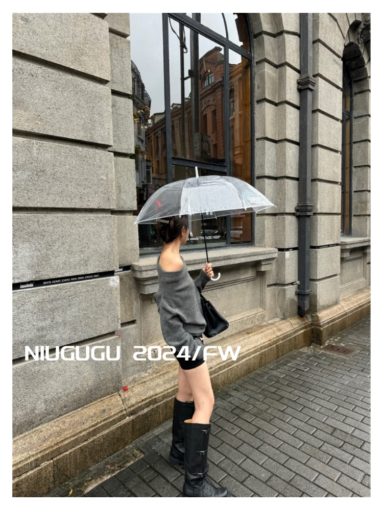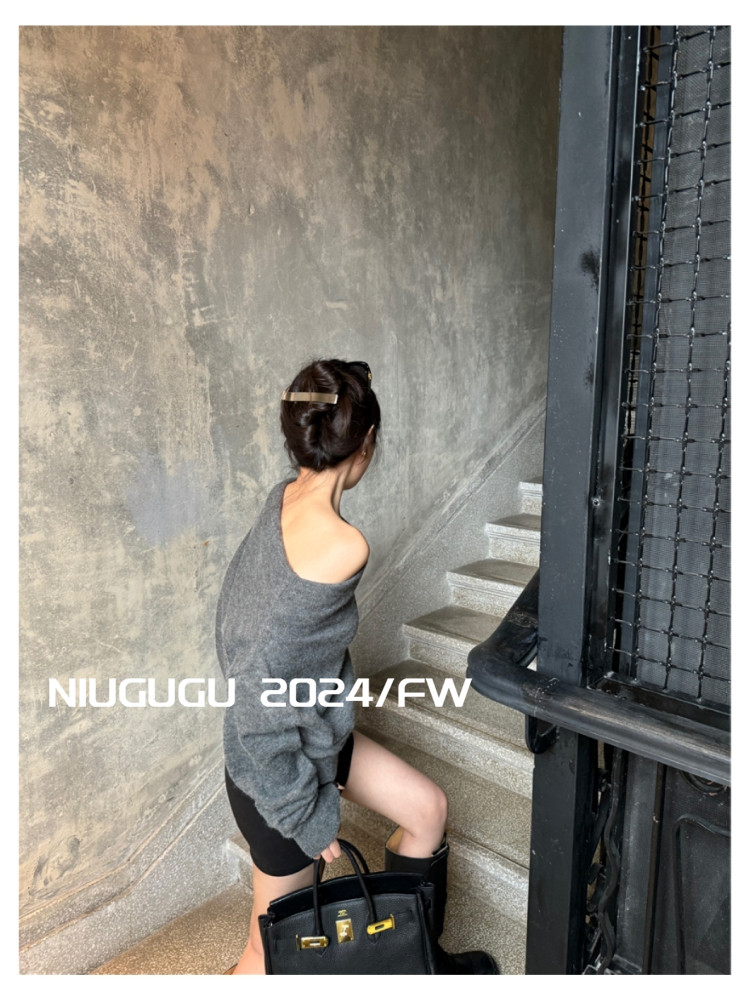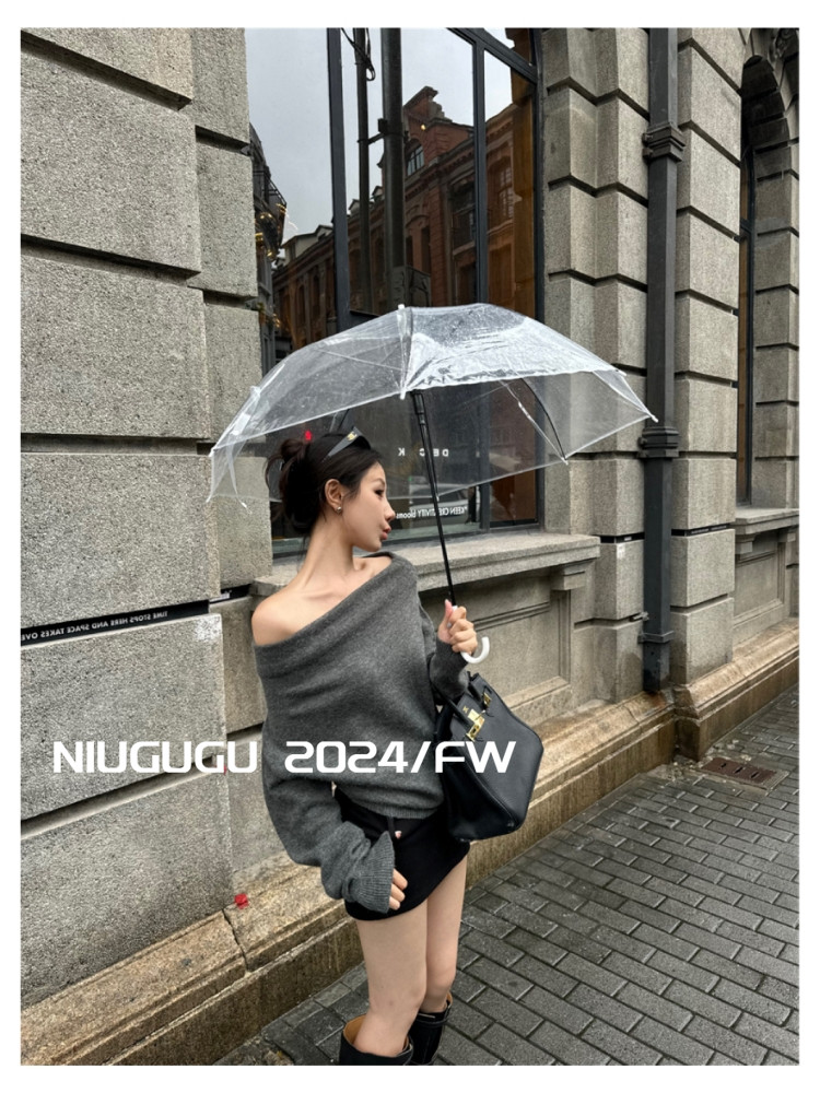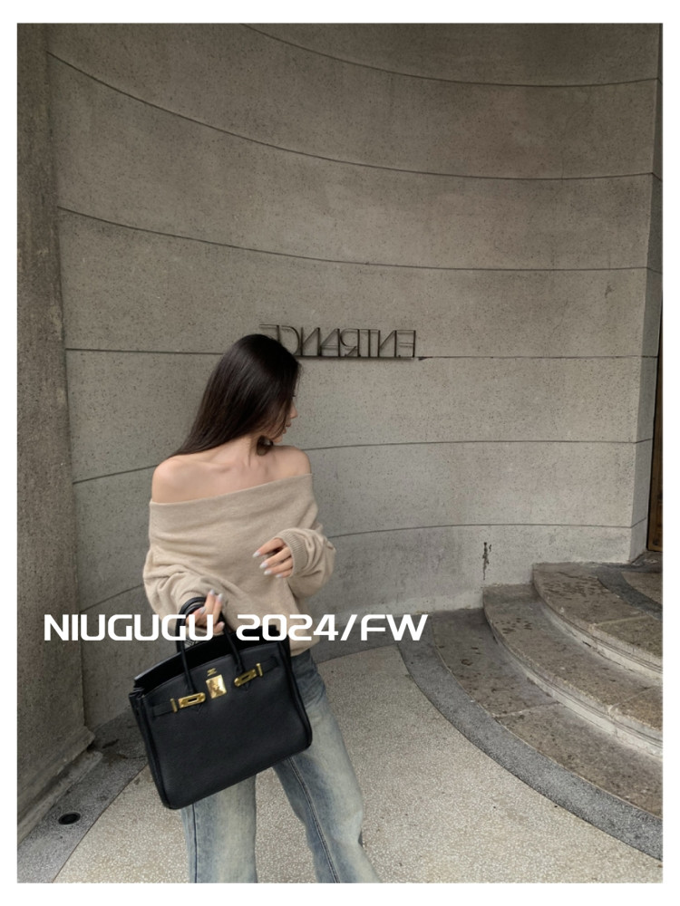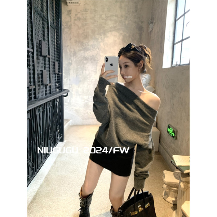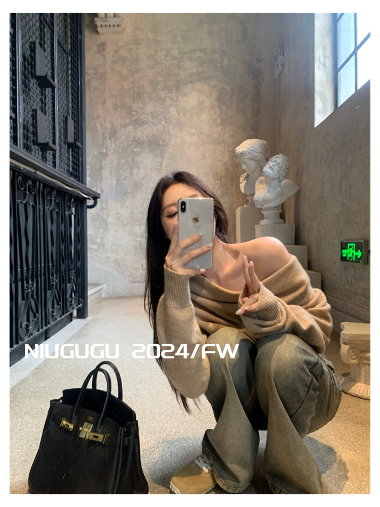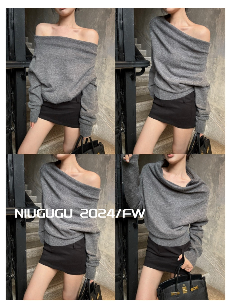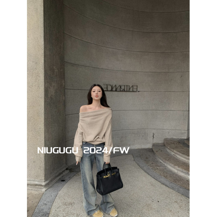 NIUGUGU 法式斜領露肩長袖針織衫女2025秋氣質軟糯簡約套頭毛衣