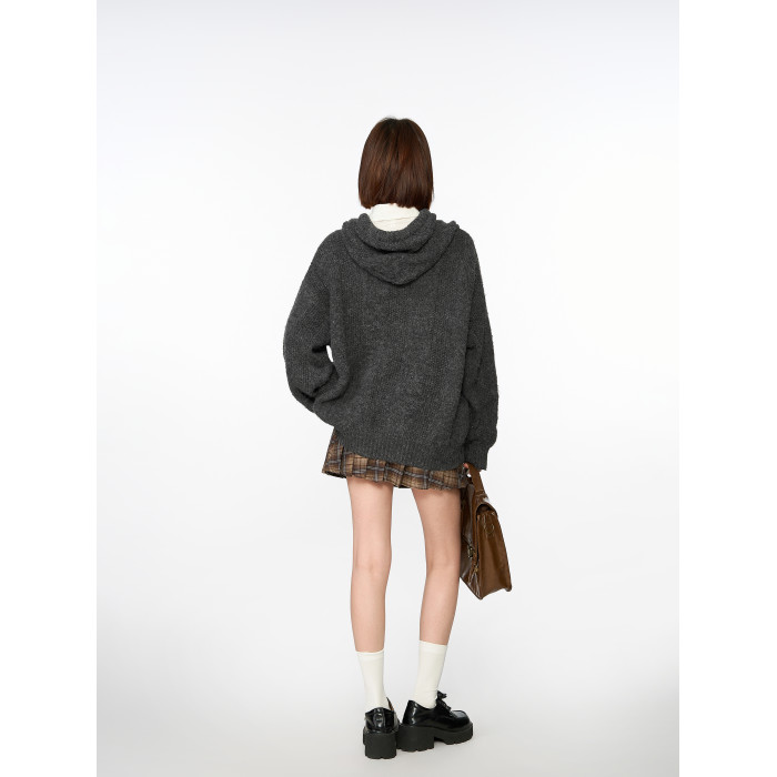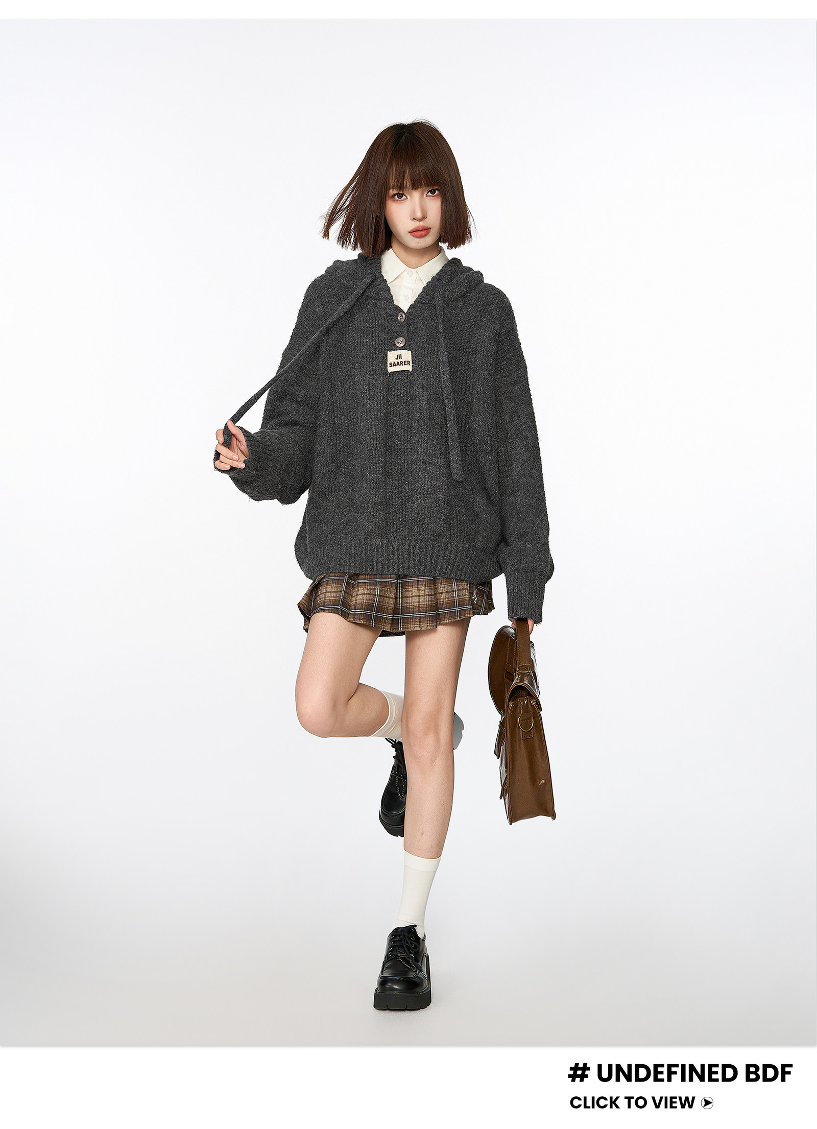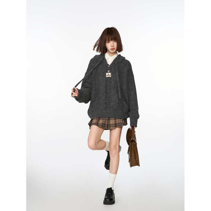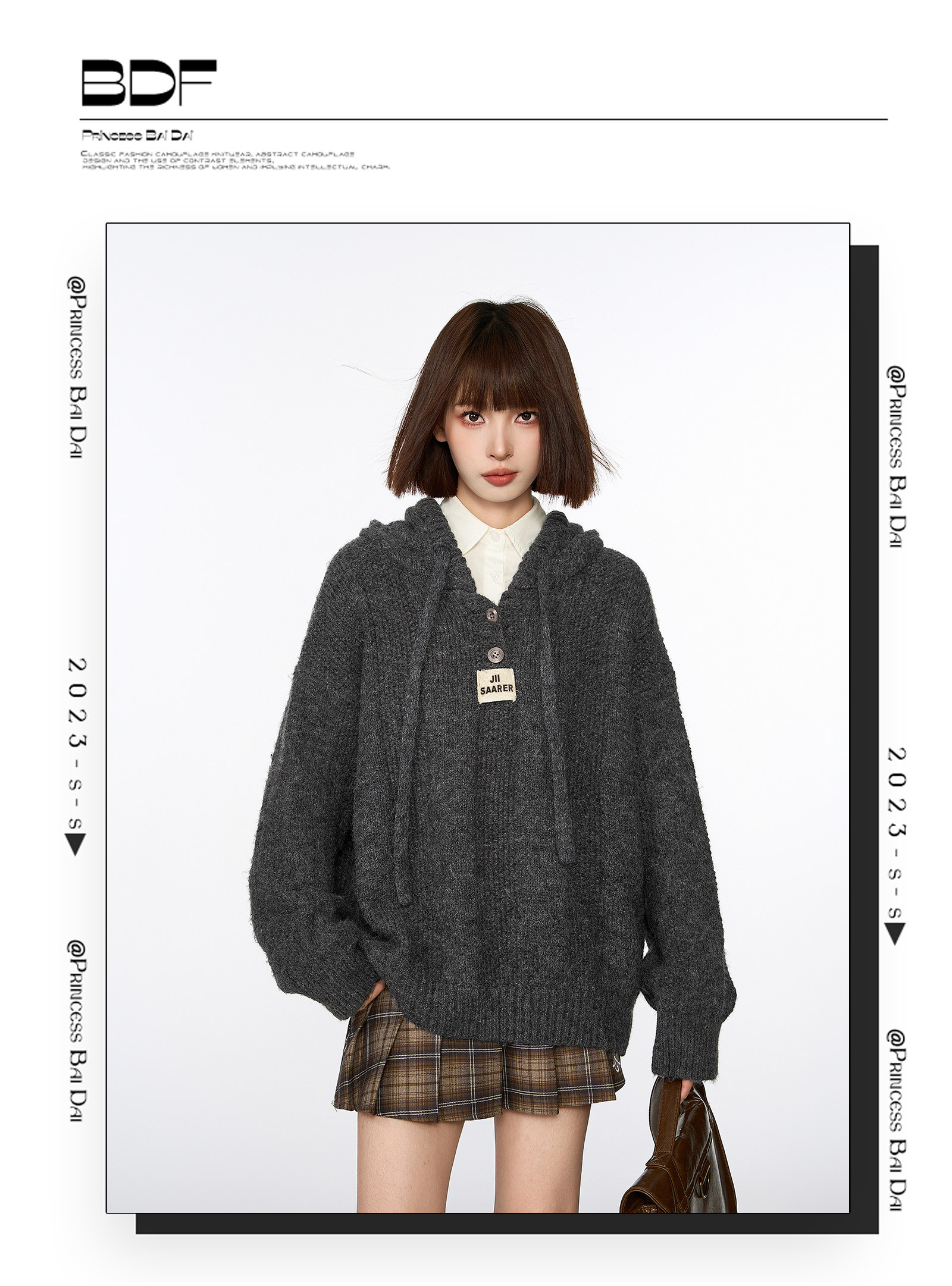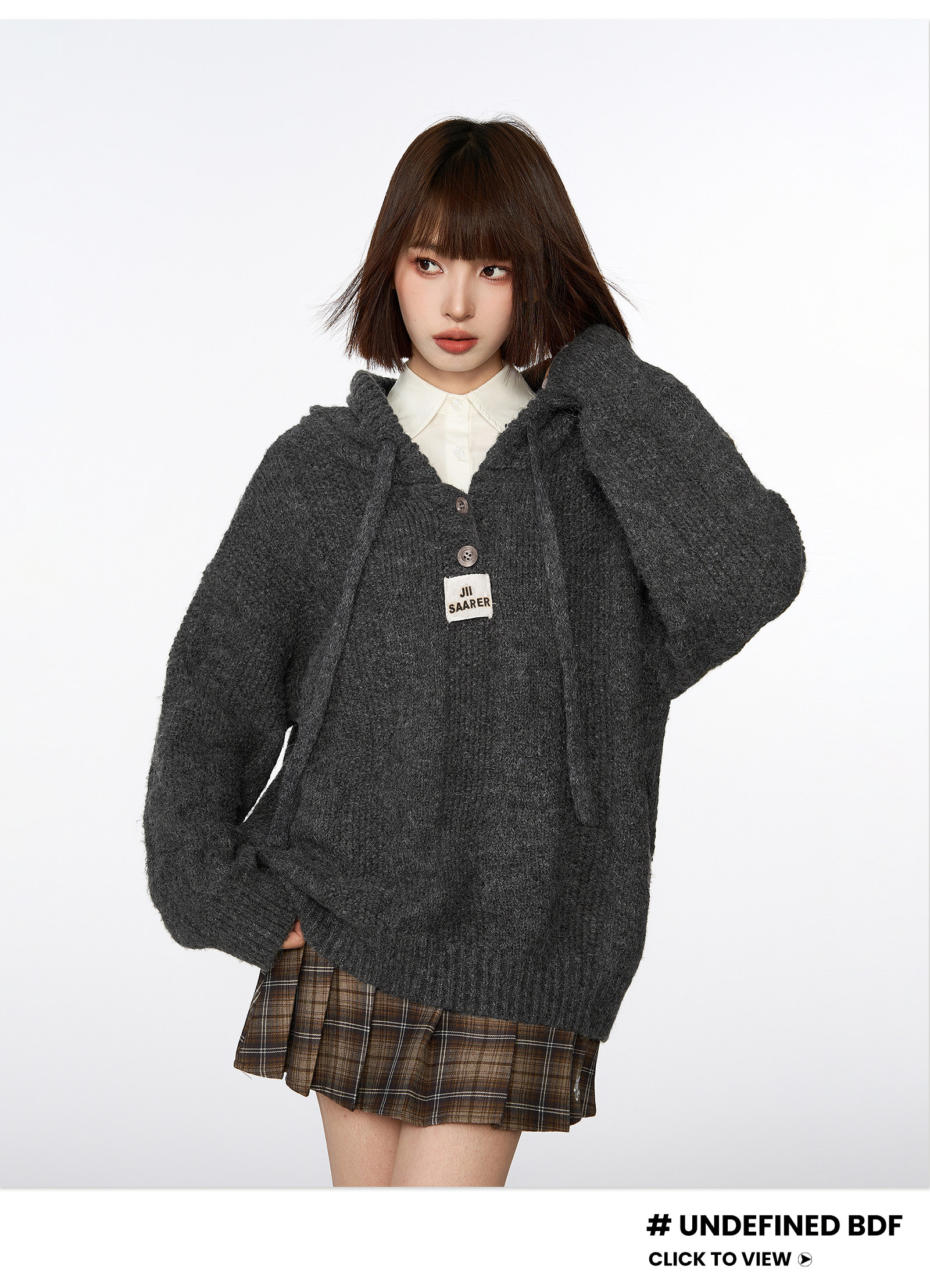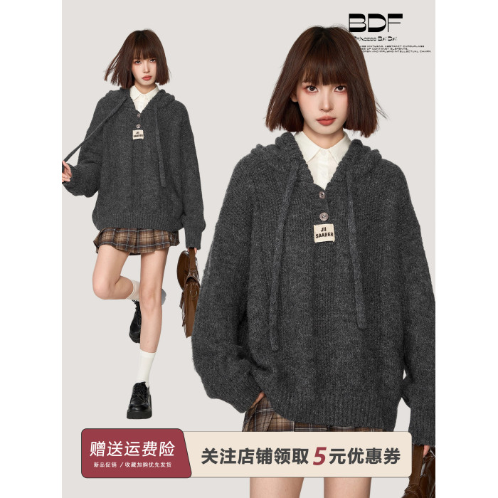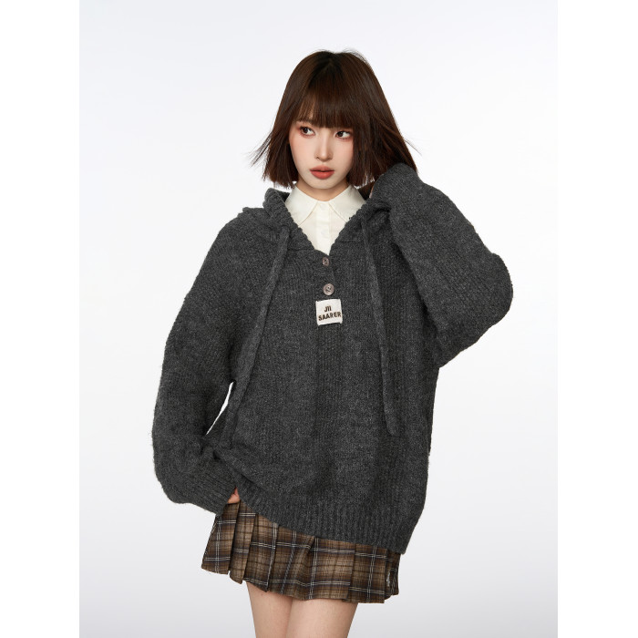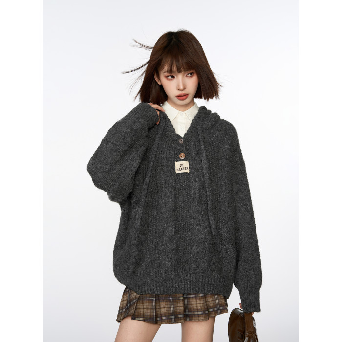 灰色連帽套頭針織毛衣女秋冬冬季寬鬆韓系慵嬾風加厚上衣衛衣外套