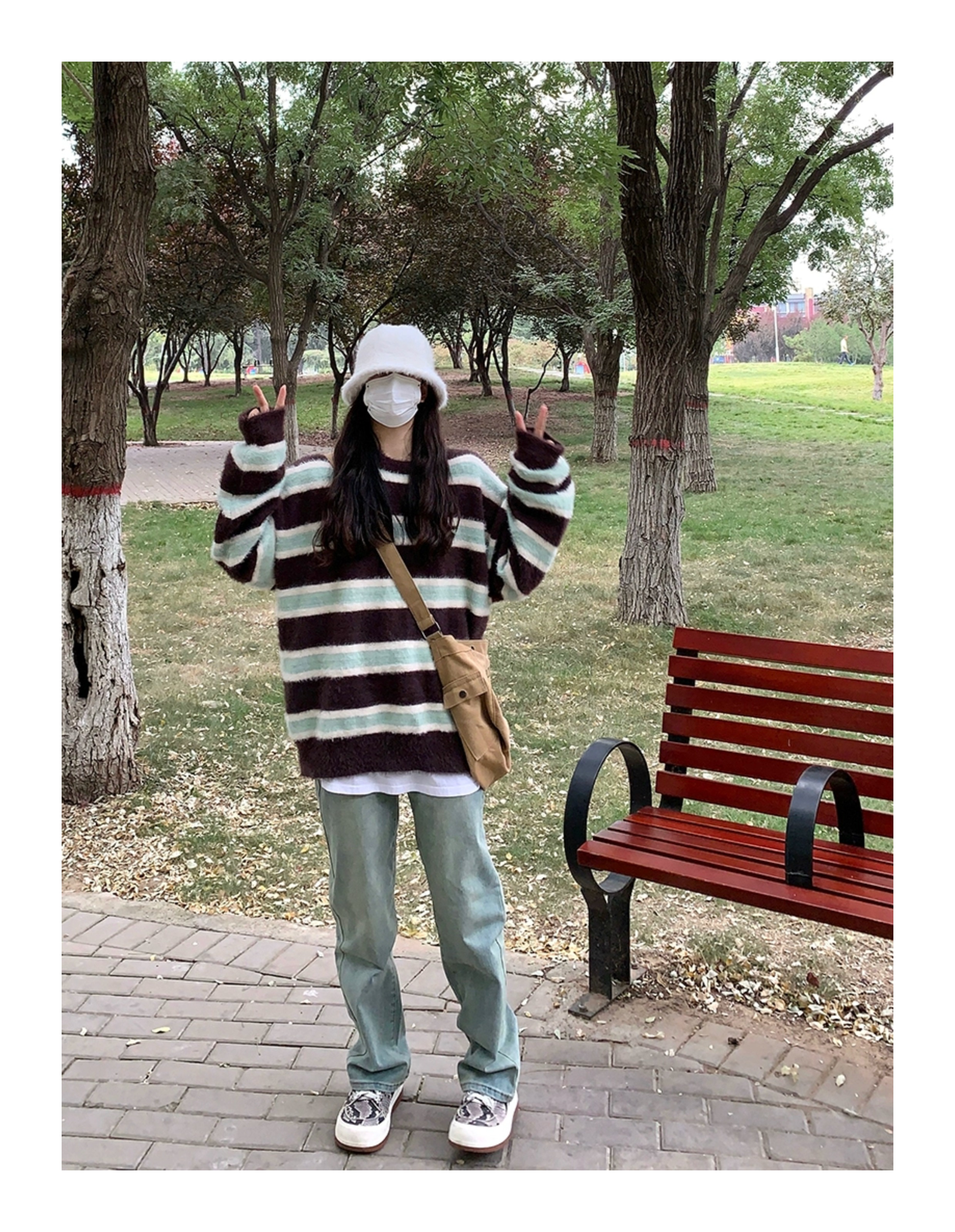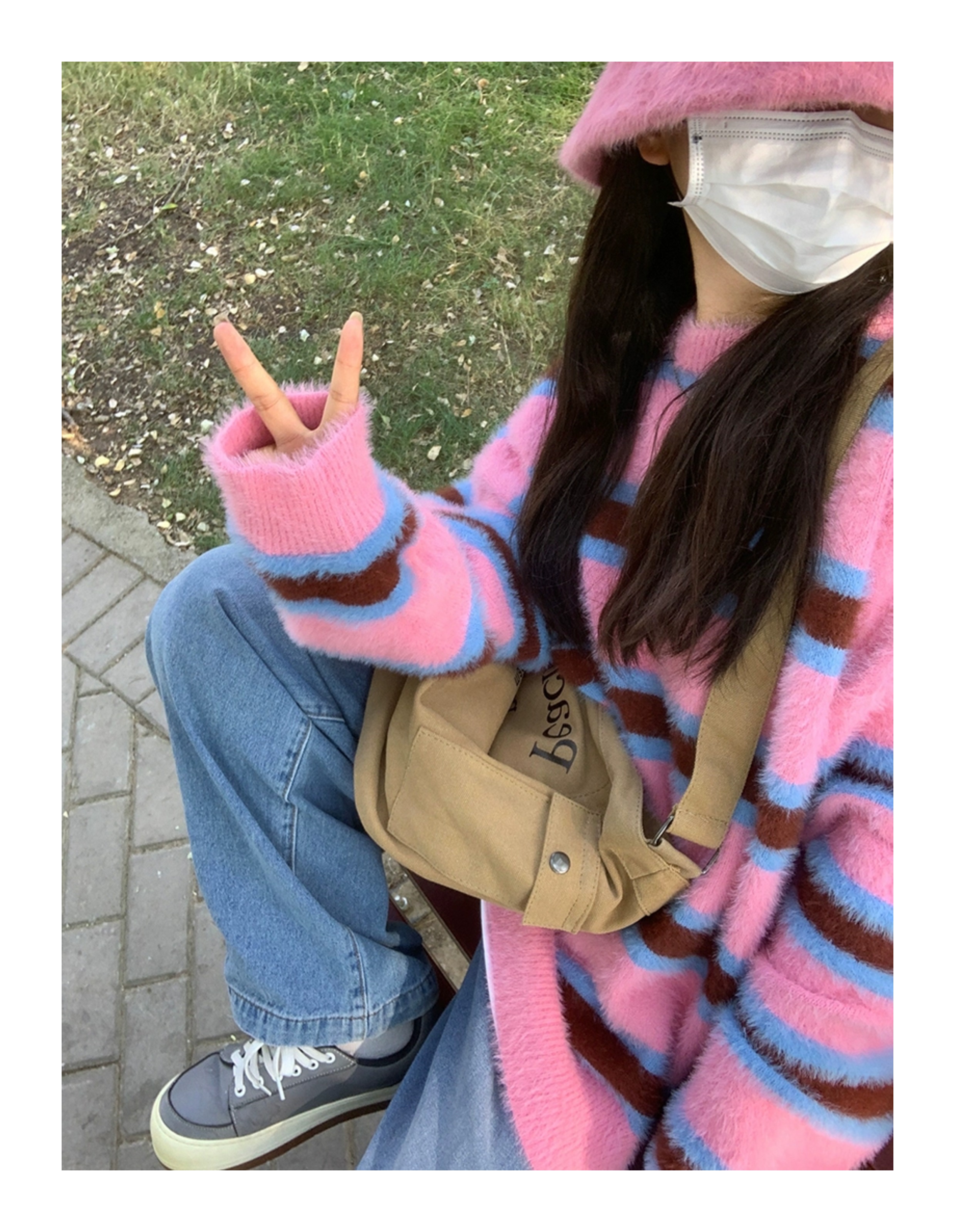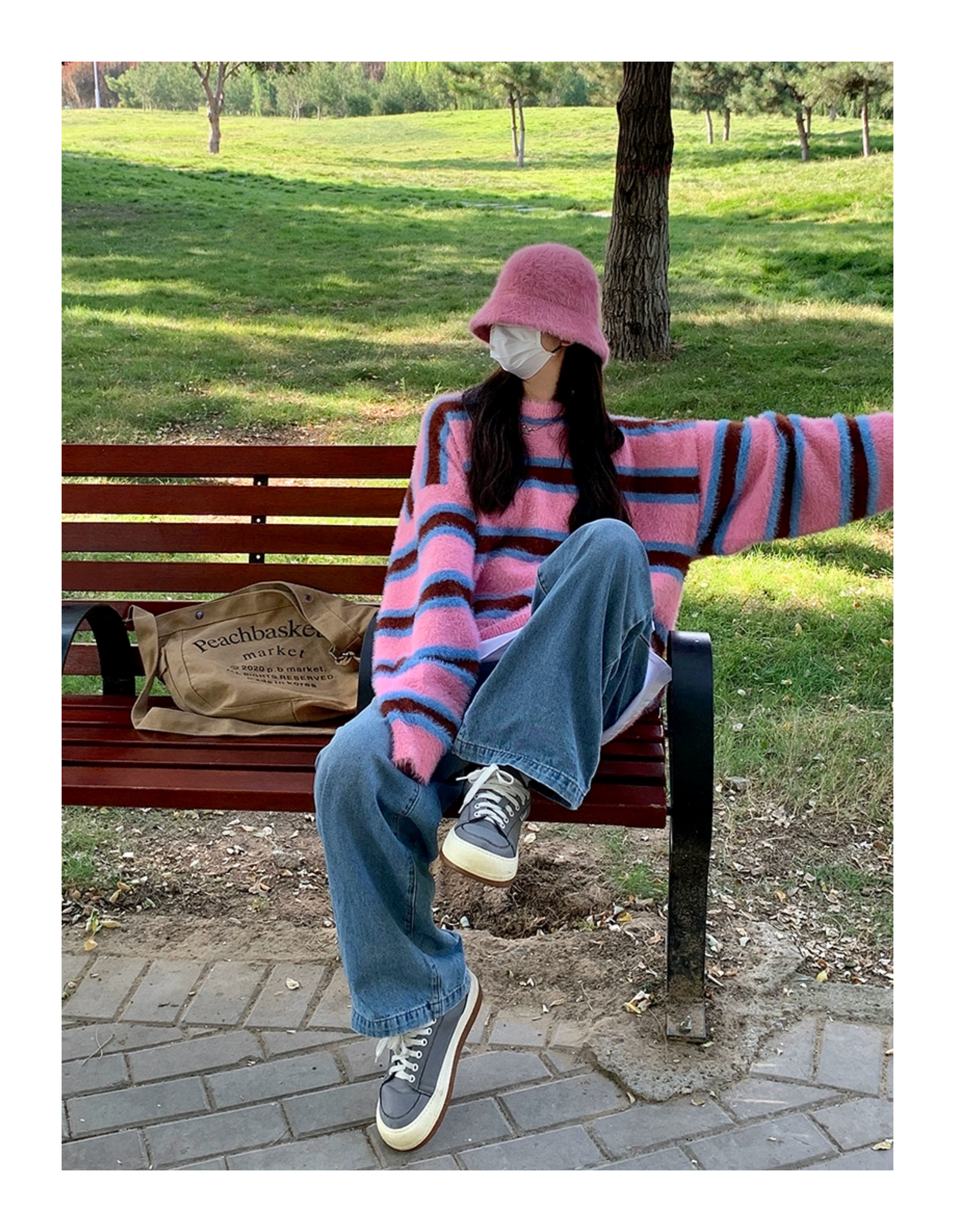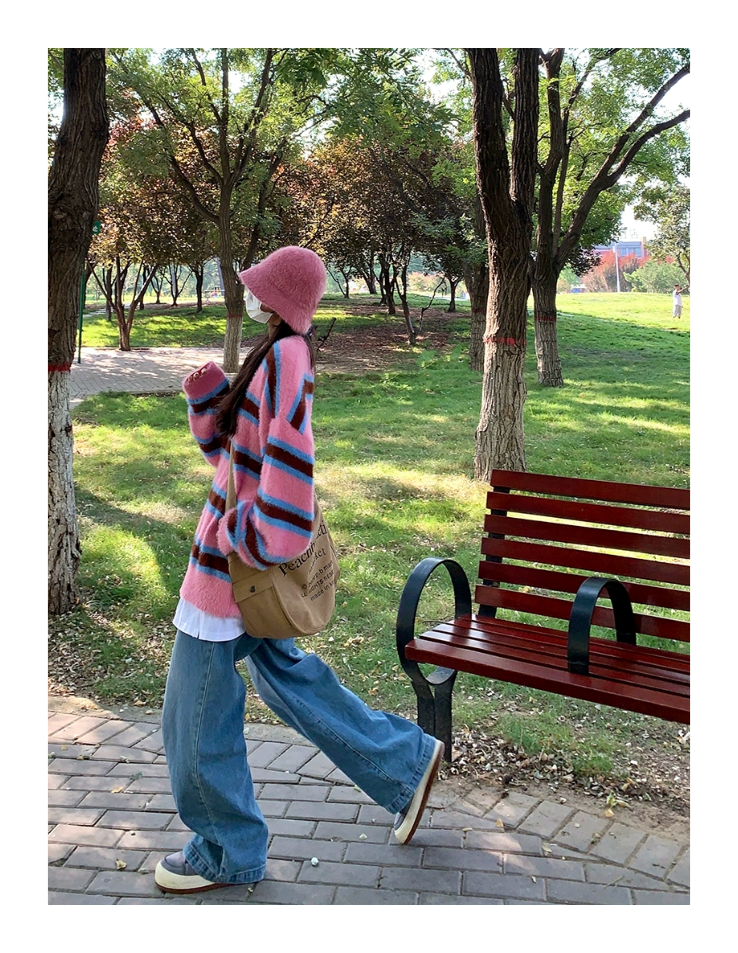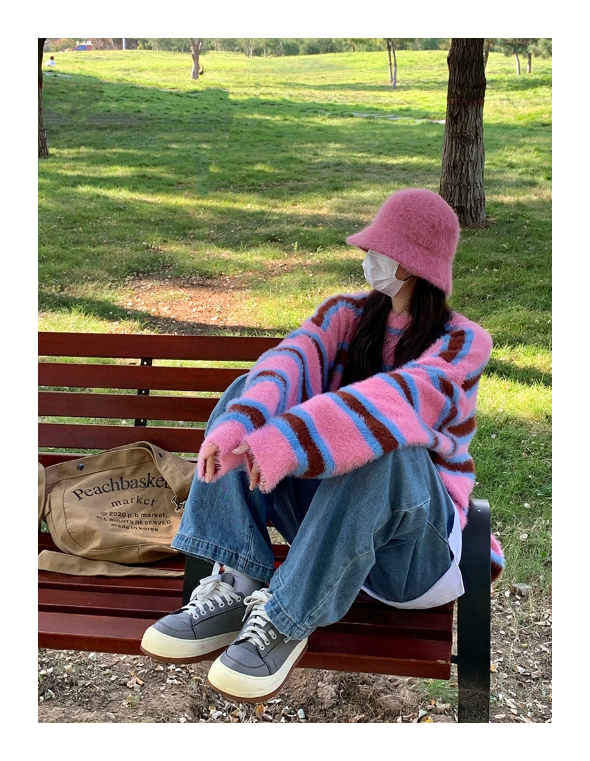 JIANYINZ軟糯溫柔粉色條紋慵懶風毛衣男女寬松復古ins甜辣針織衫
