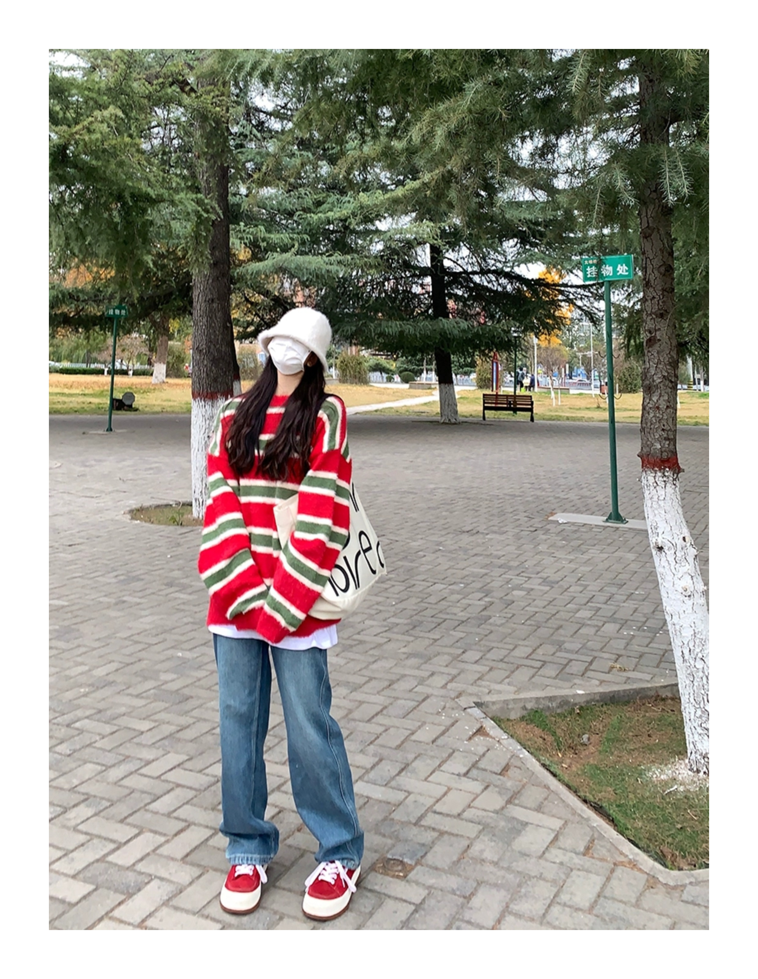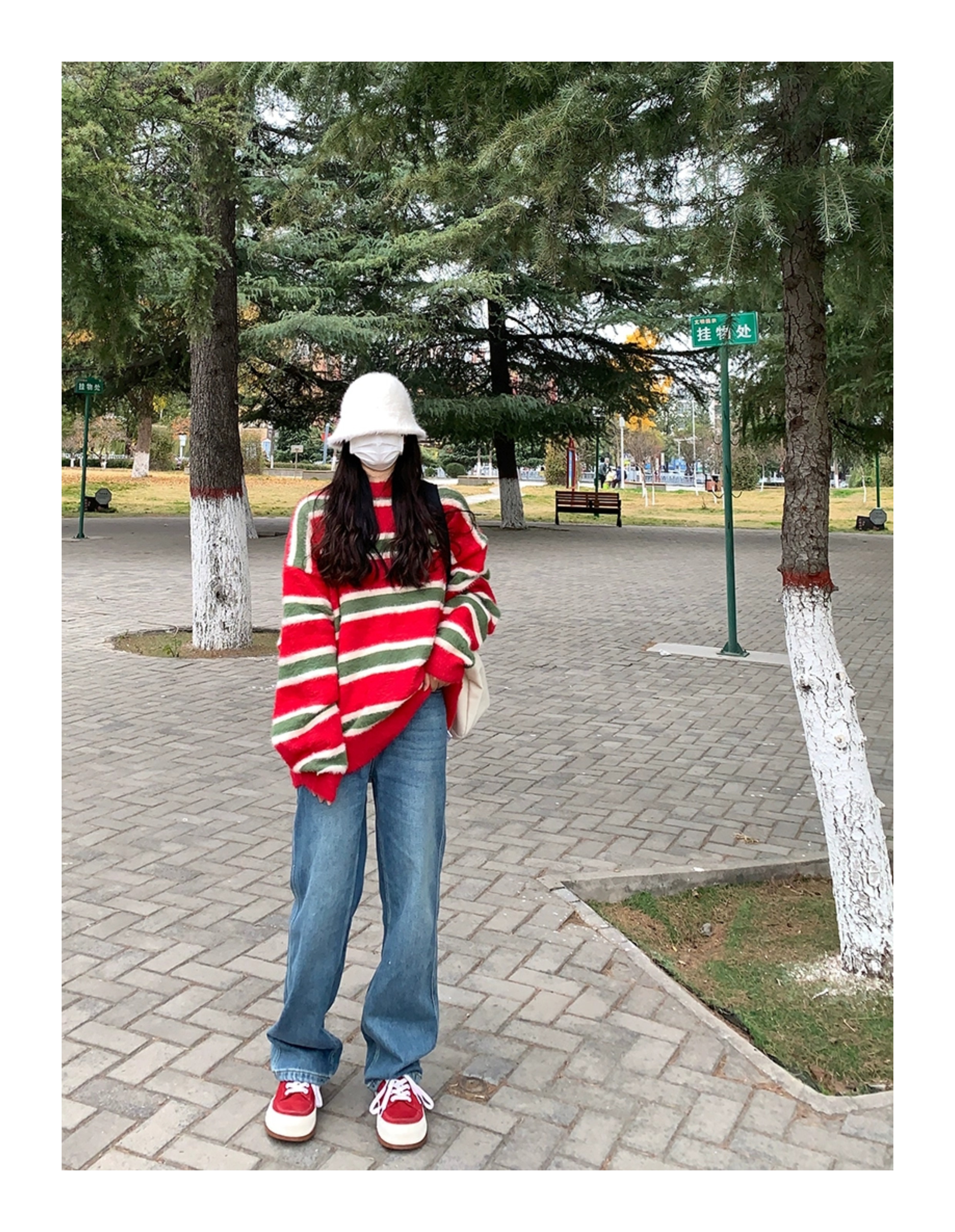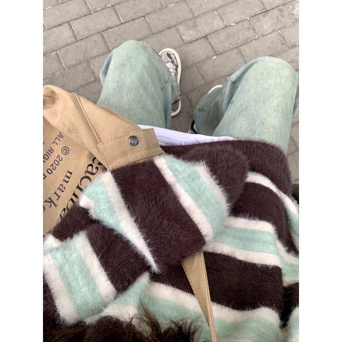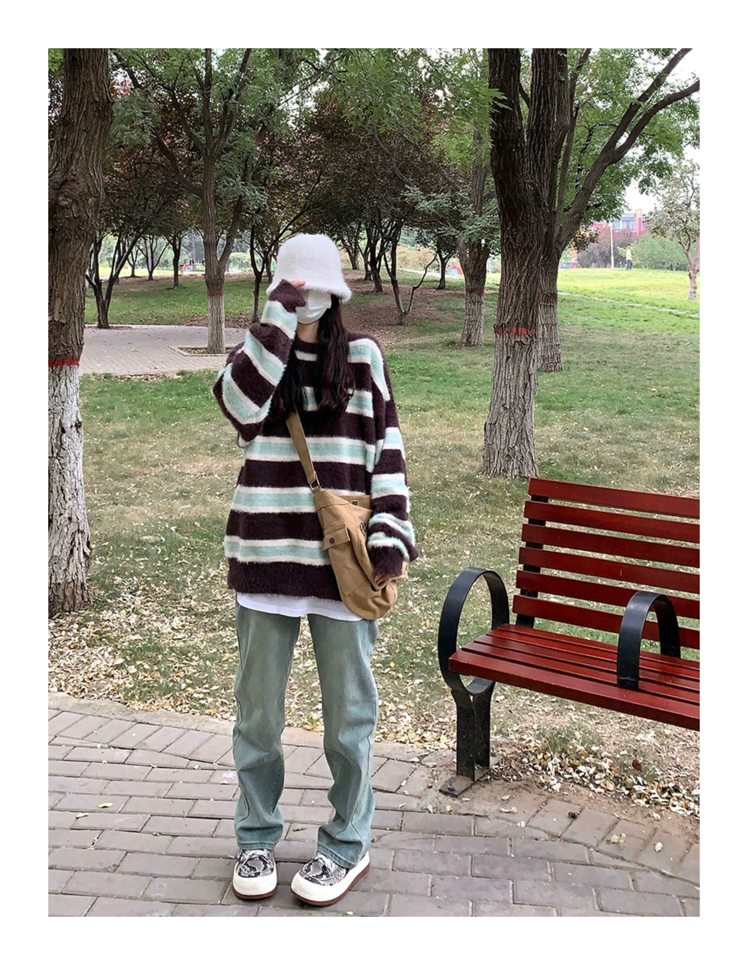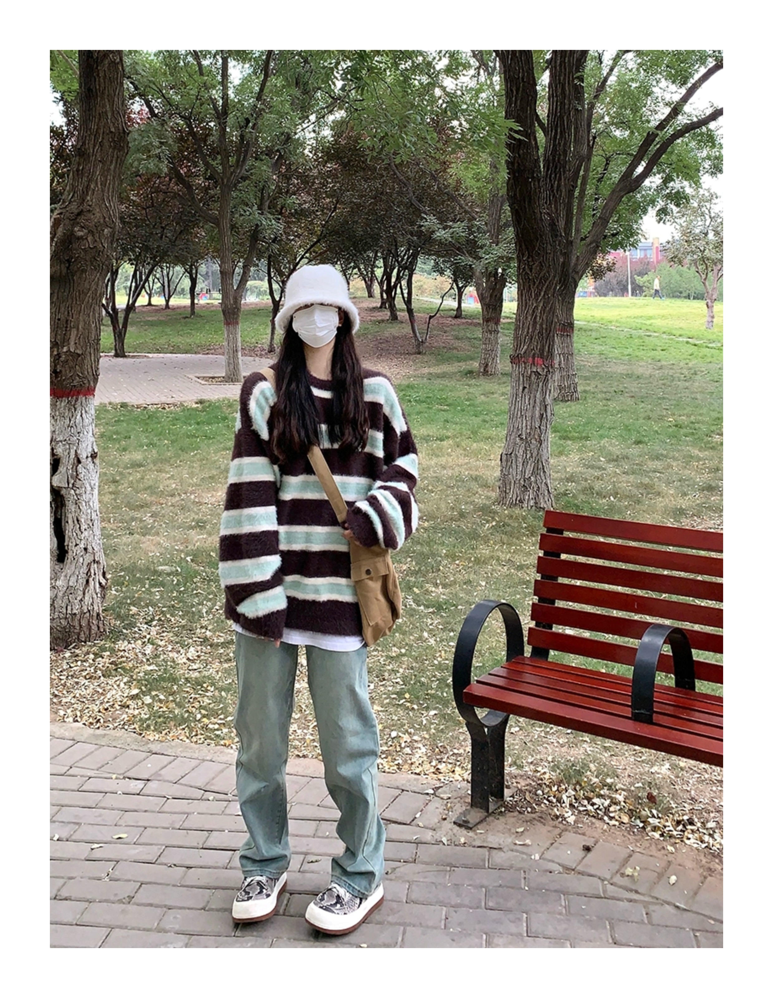 JIANYINZ軟糯溫柔粉色條紋慵懶風毛衣男女寬松復古ins甜辣針織衫