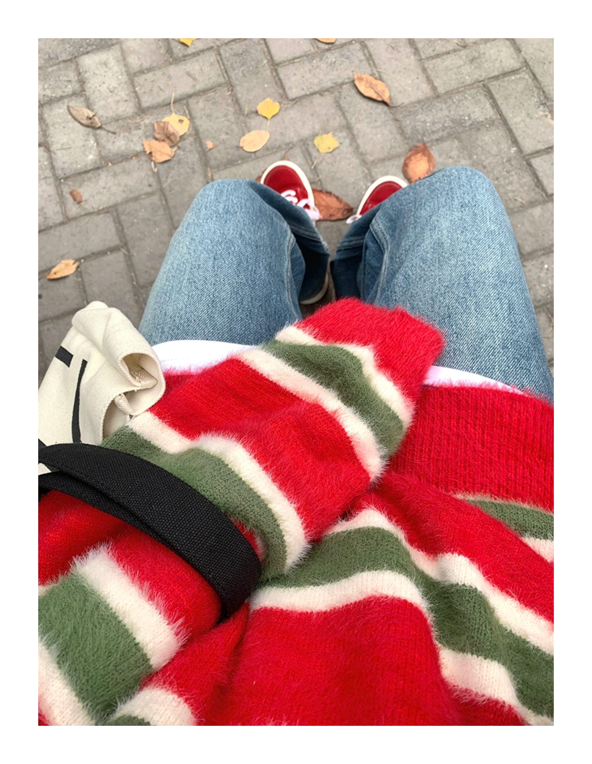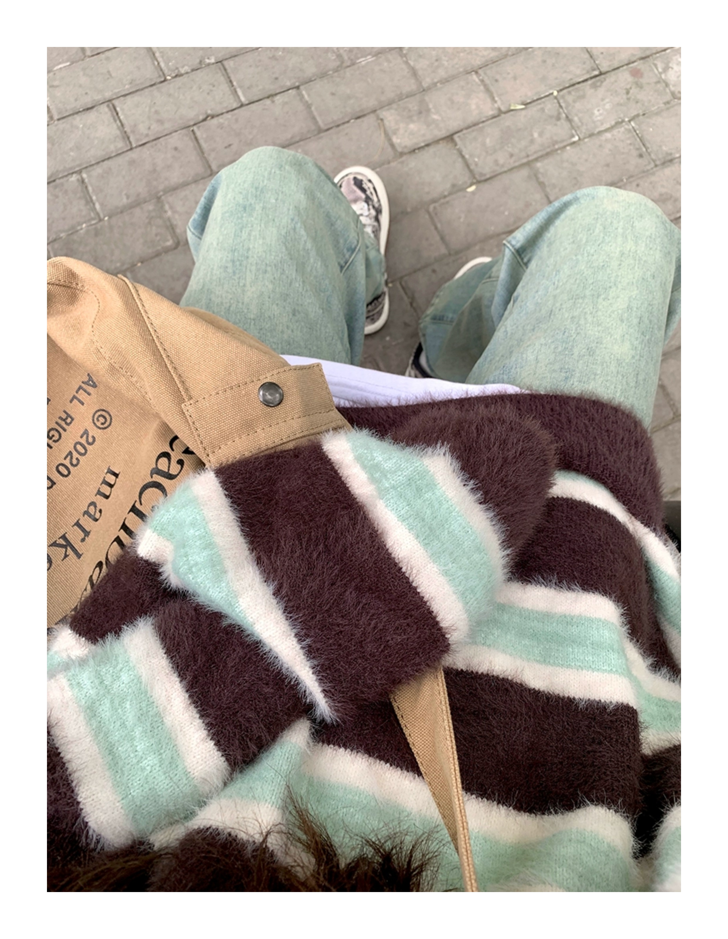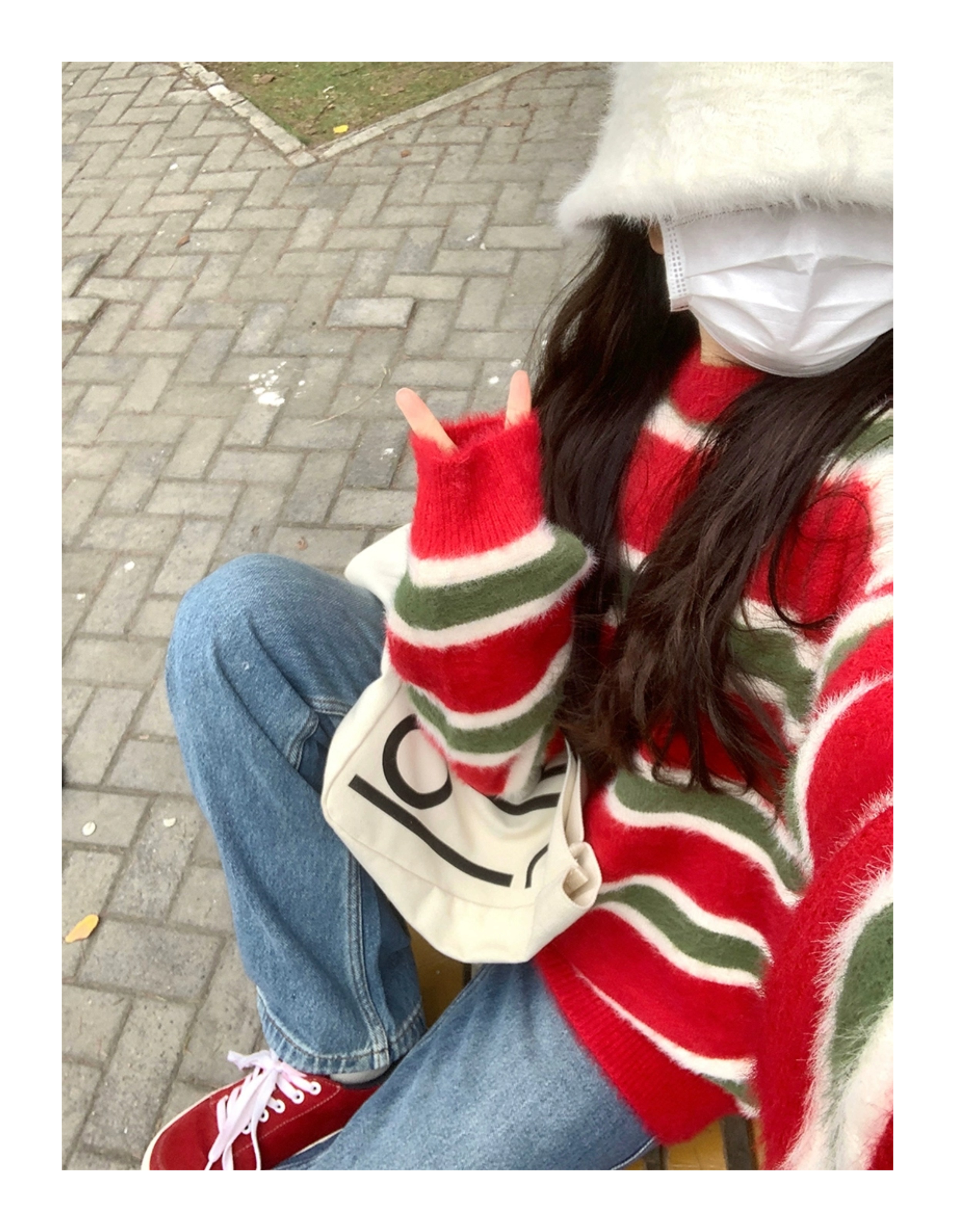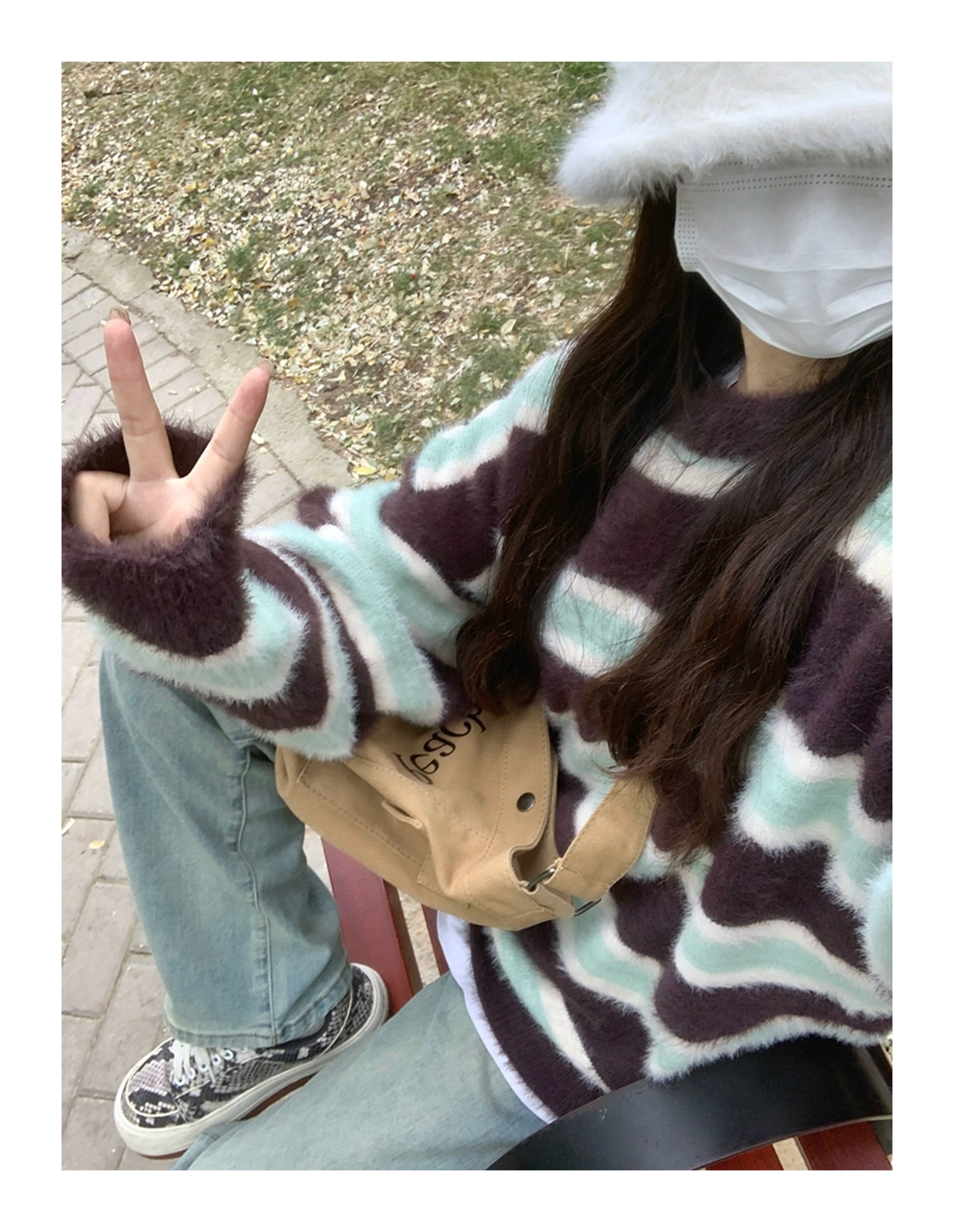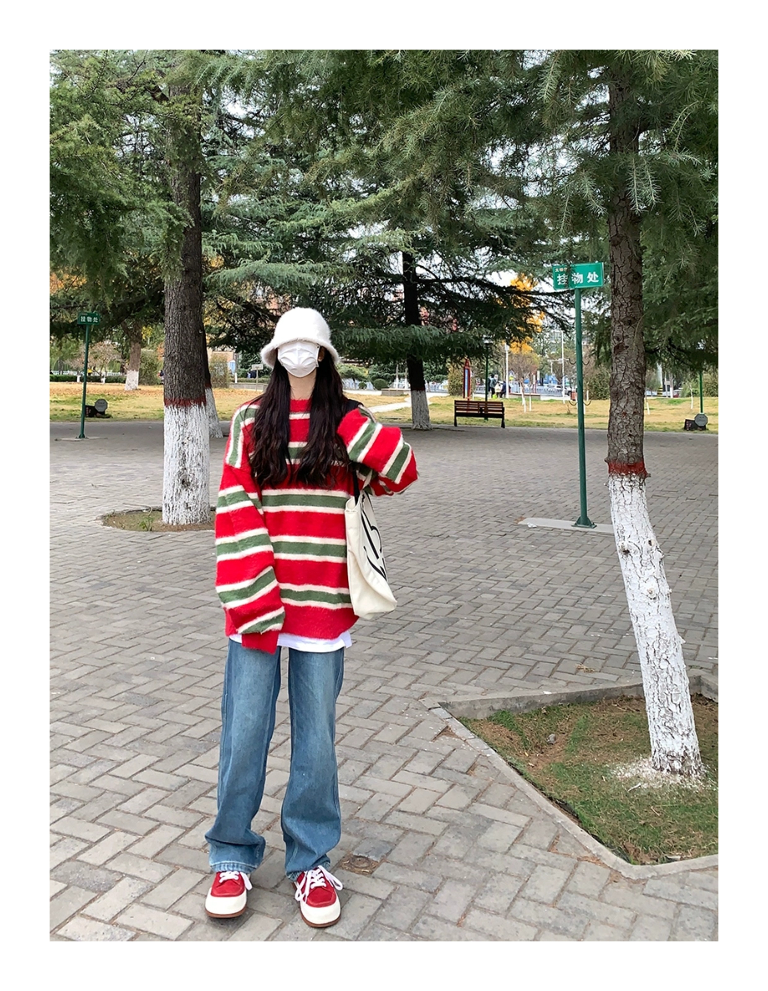 JIANYINZ軟糯溫柔粉色條紋慵懶風毛衣男女寬松復古ins甜辣針織衫