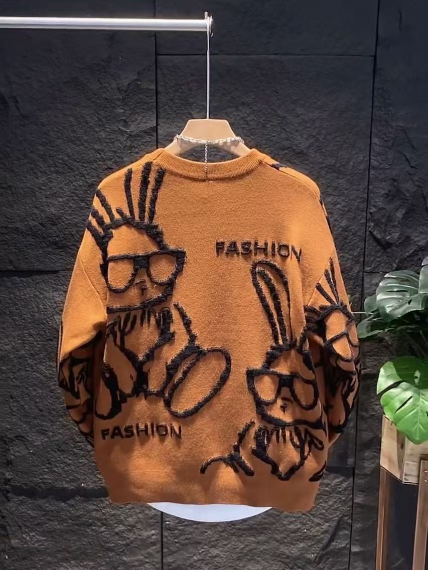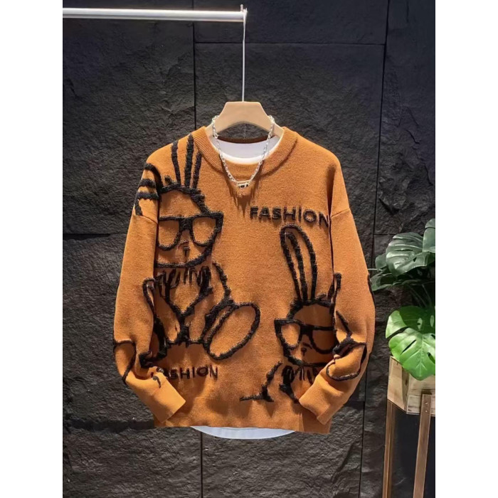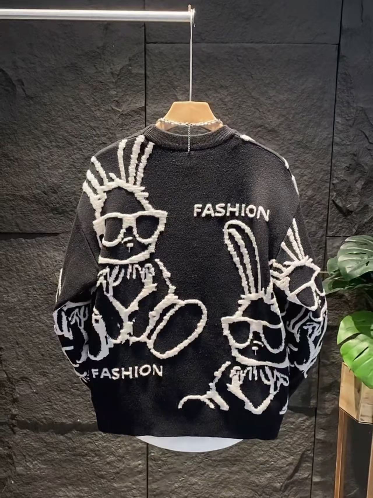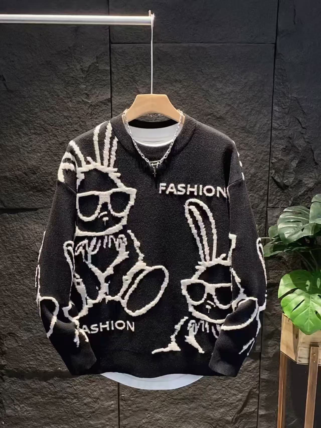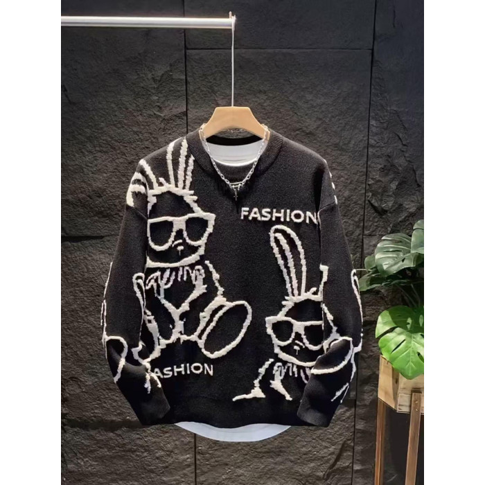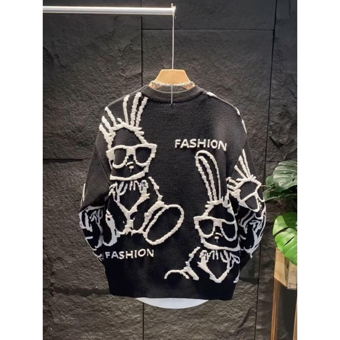 潮牌卡通印花兔子毛衣男秋冬情侶潮流套頭上衣休閒百搭圓領針織衫