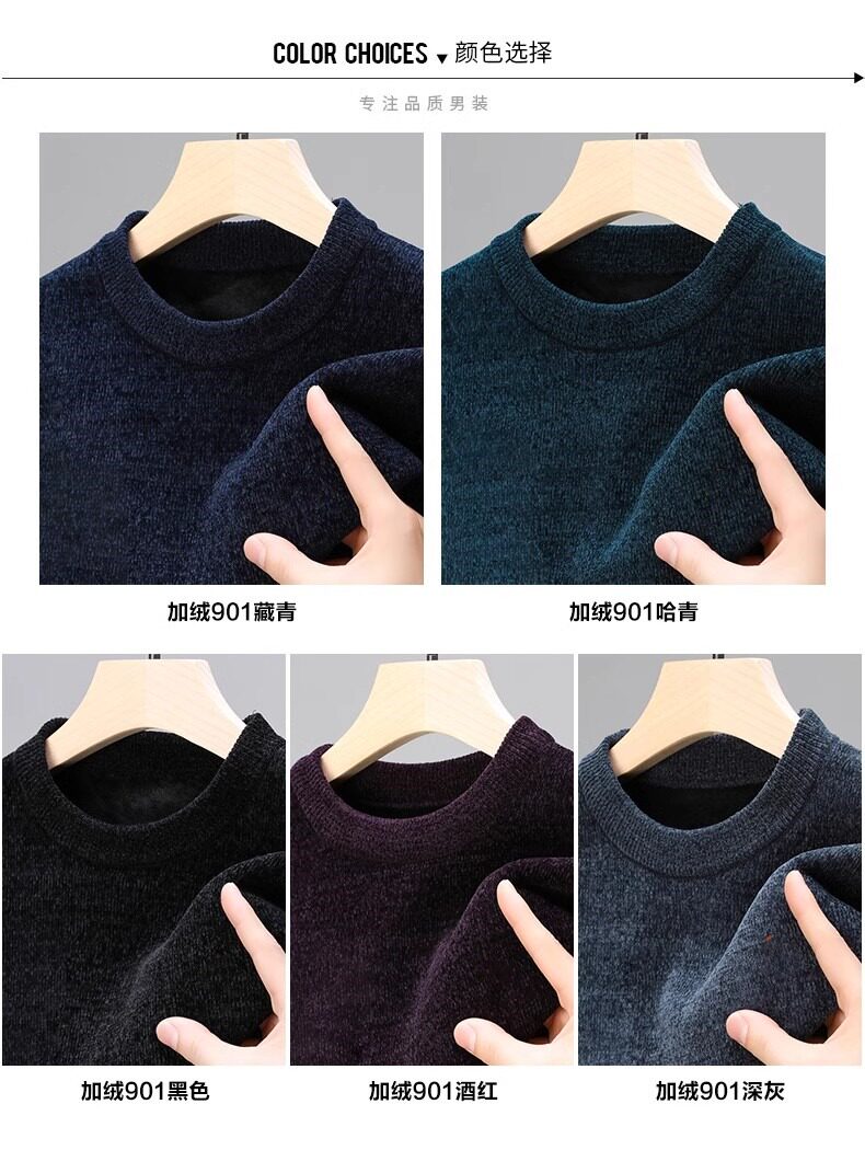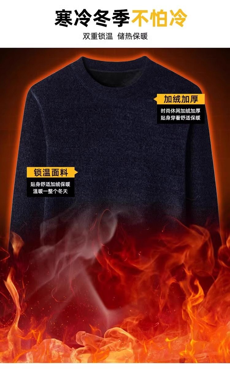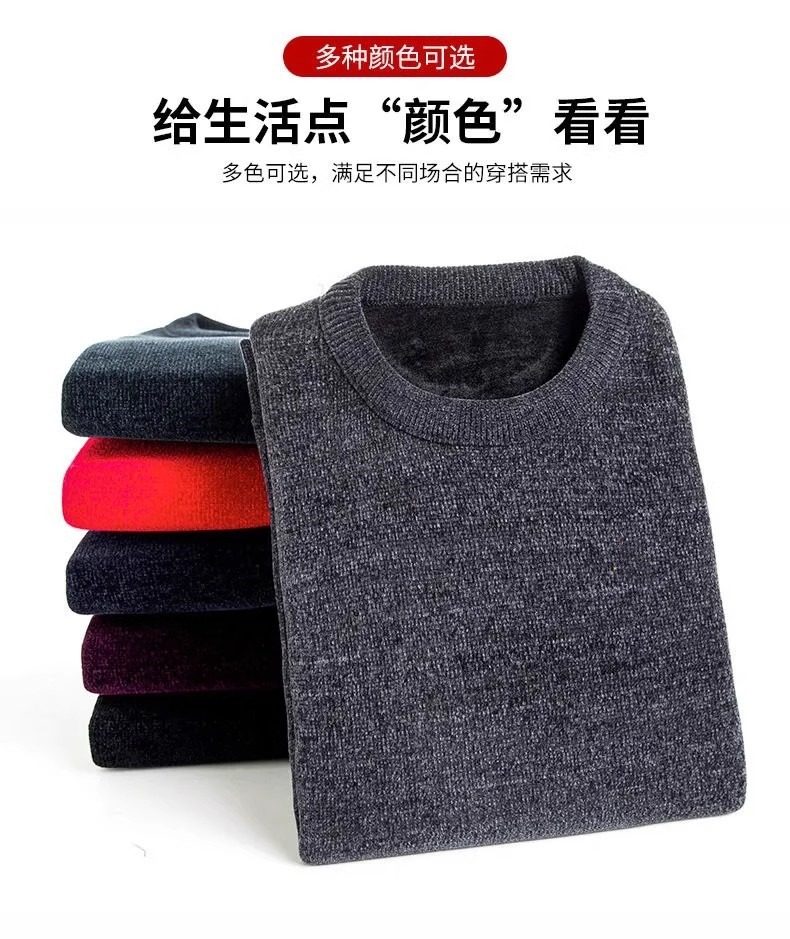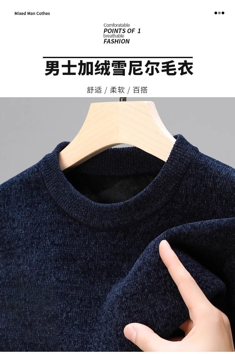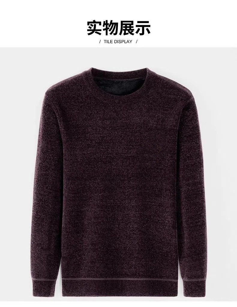 男士雪尼爾毛衣加絨加厚圓領打底針織衫冬季保暖中年羊毛衫