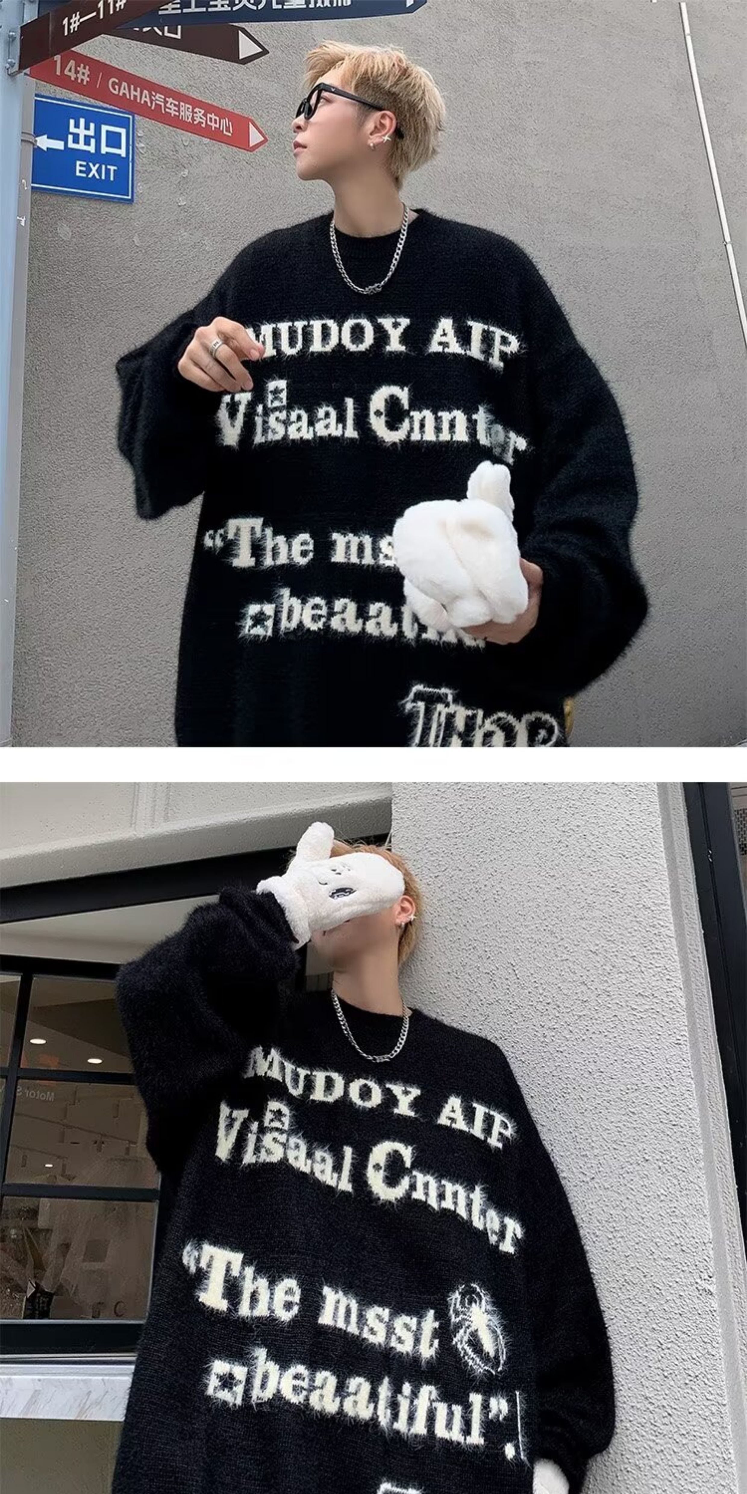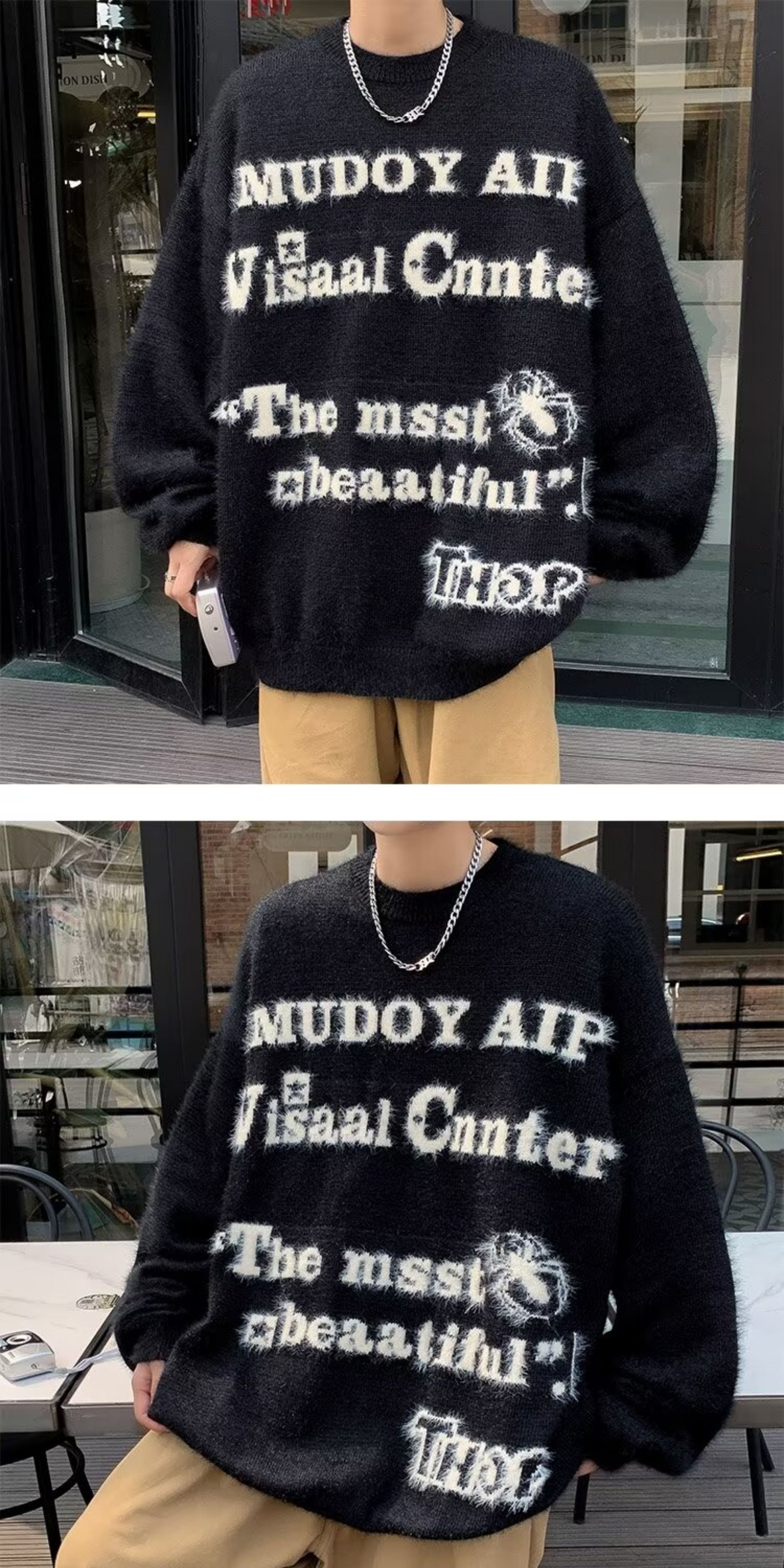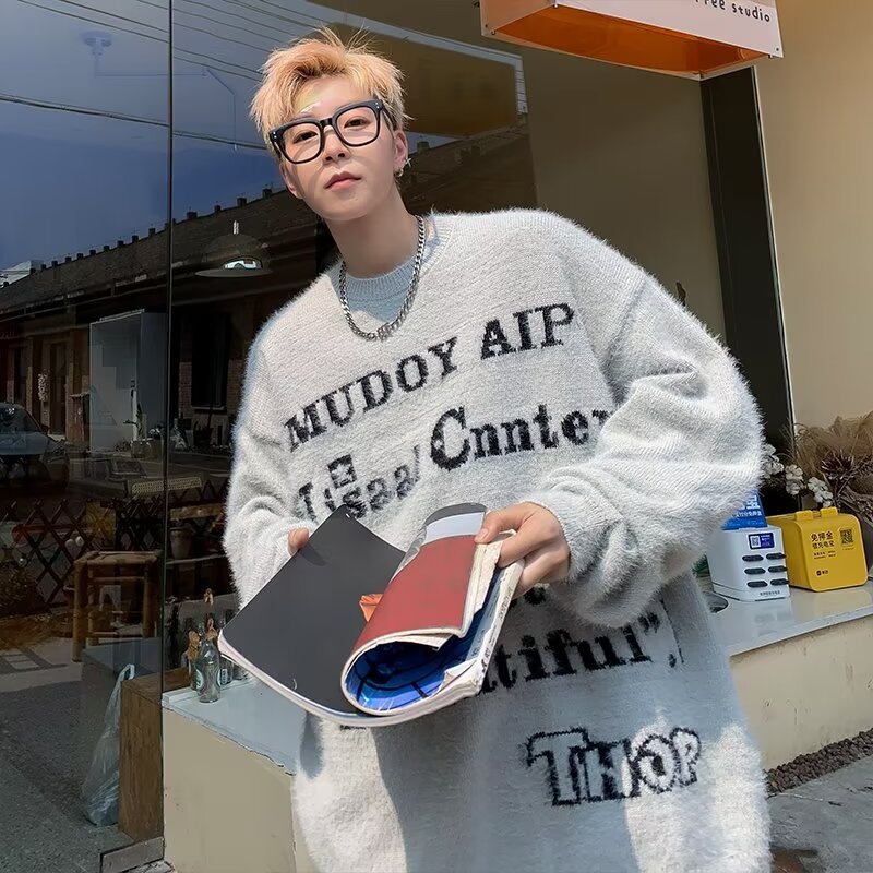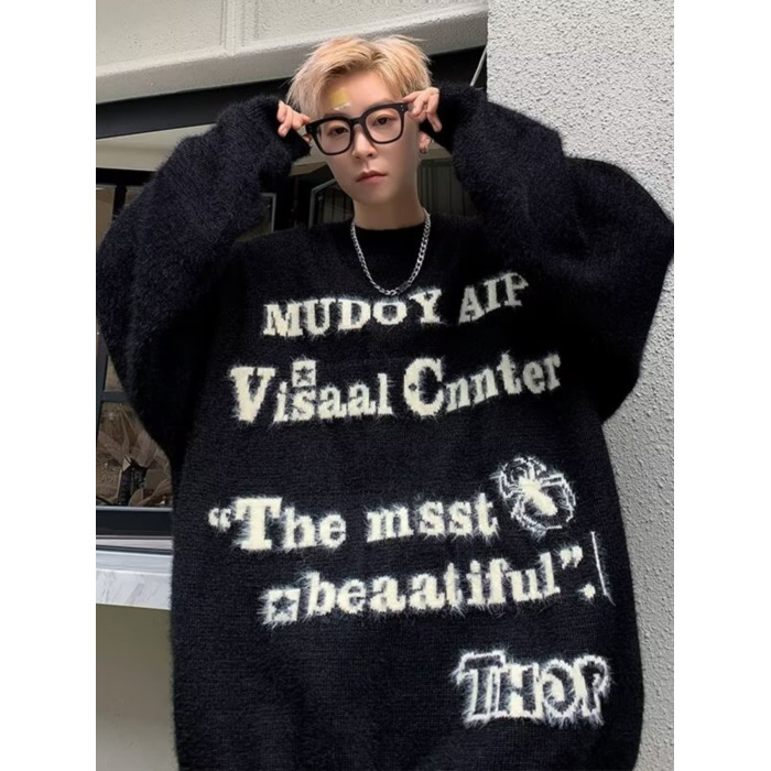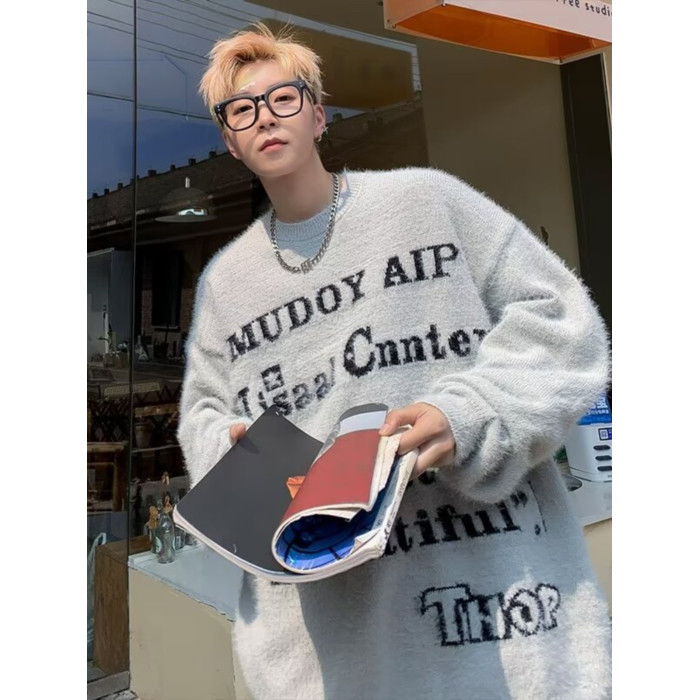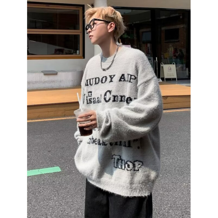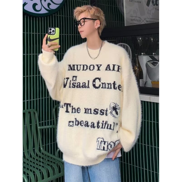 美式仿貂絨毛衣男春季裝寬松圓領內搭線衣高街嘻哈潮流情侶針織衫
