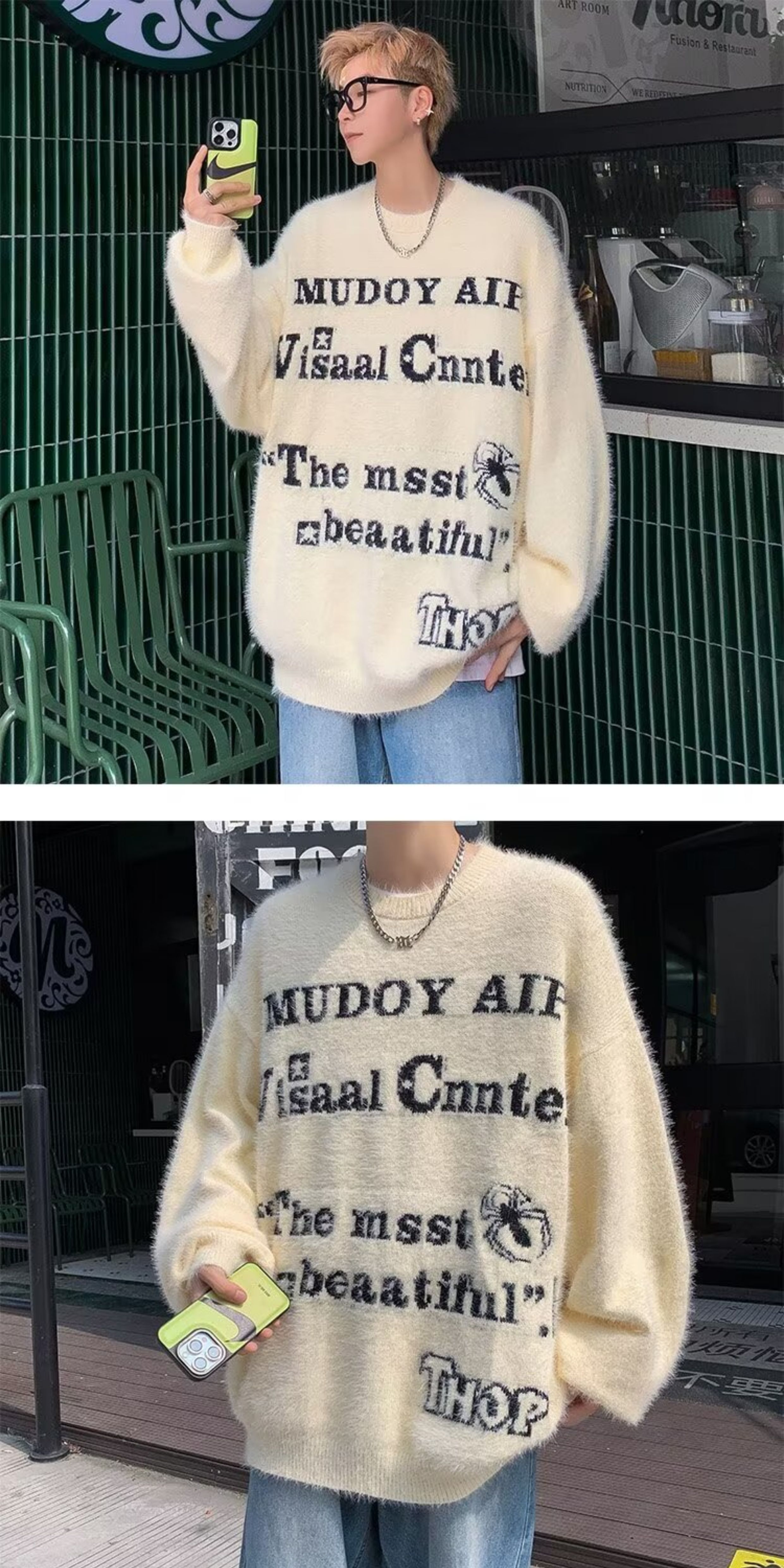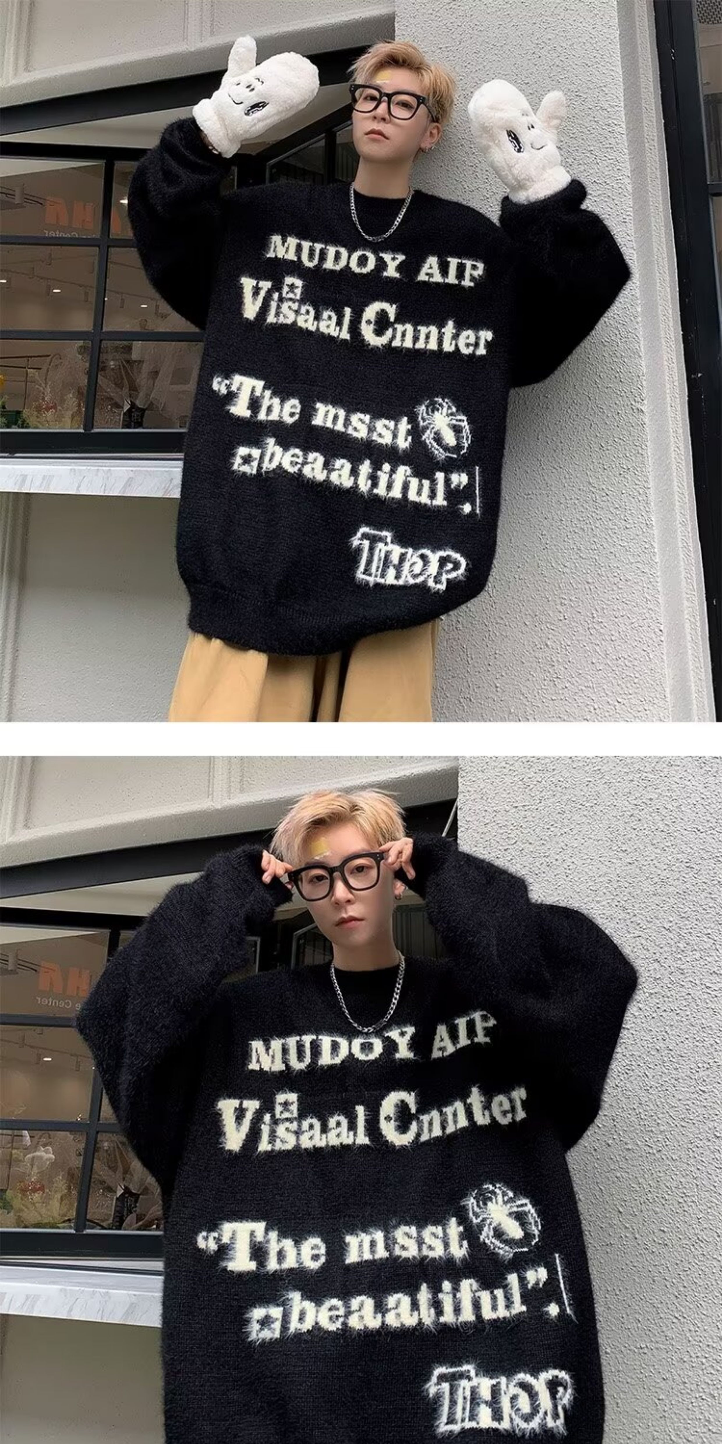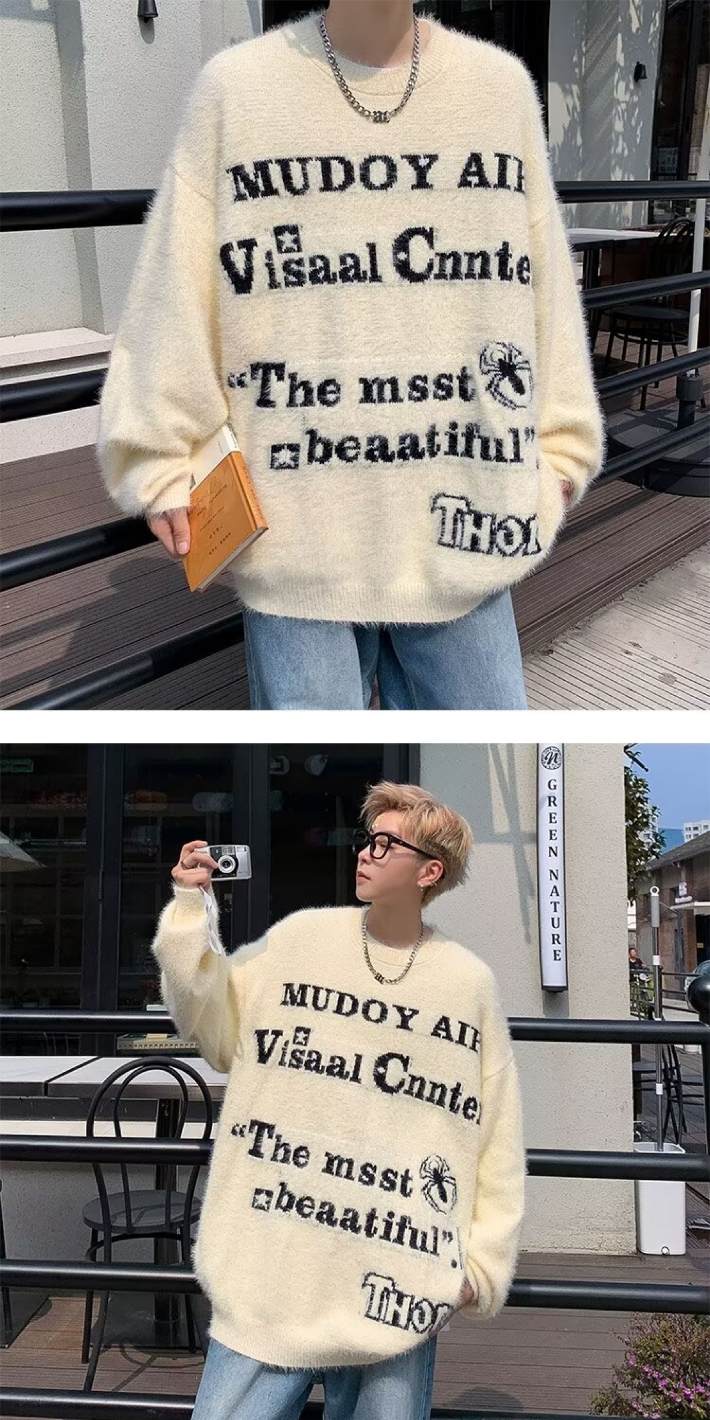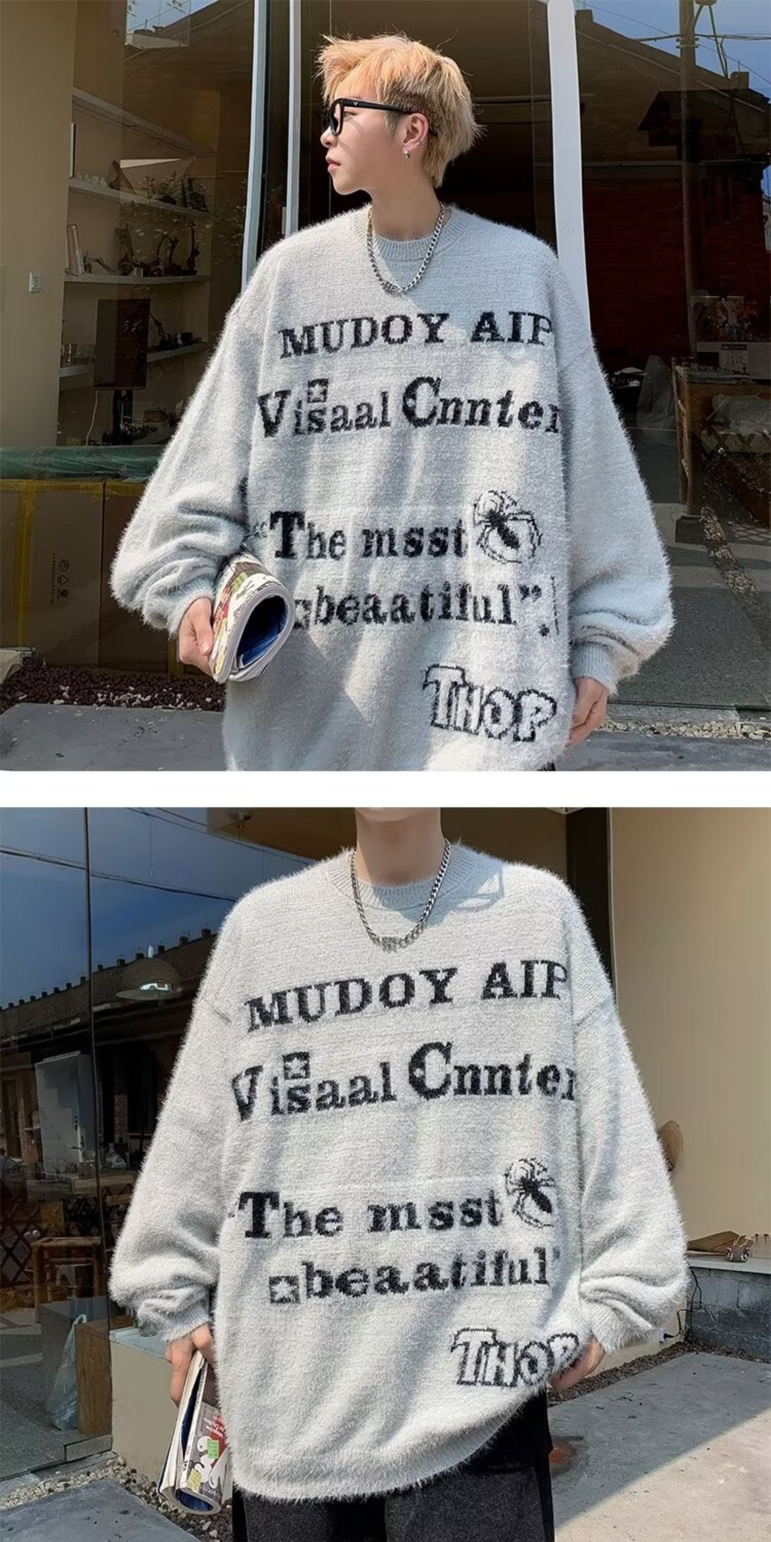 美式仿貂絨毛衣男春季裝寬松圓領內搭線衣高街嘻哈潮流情侶針織衫