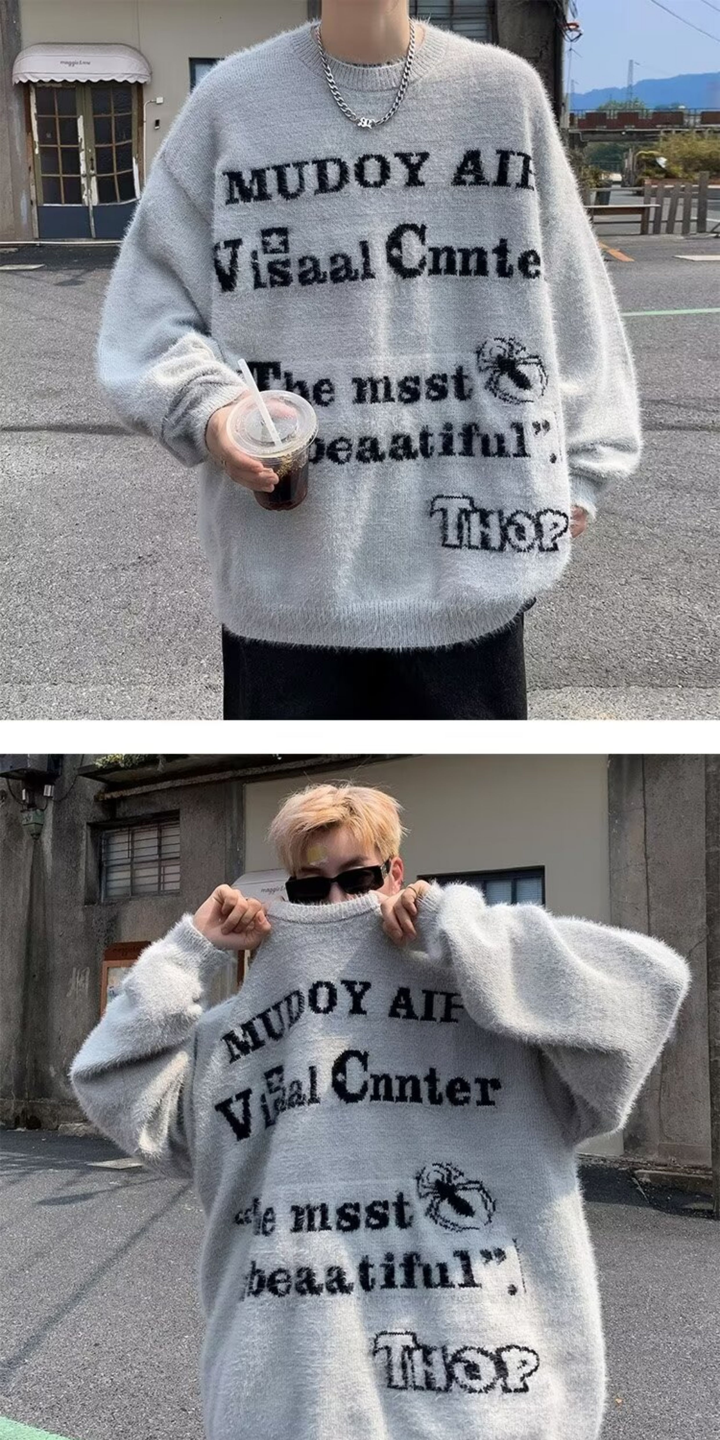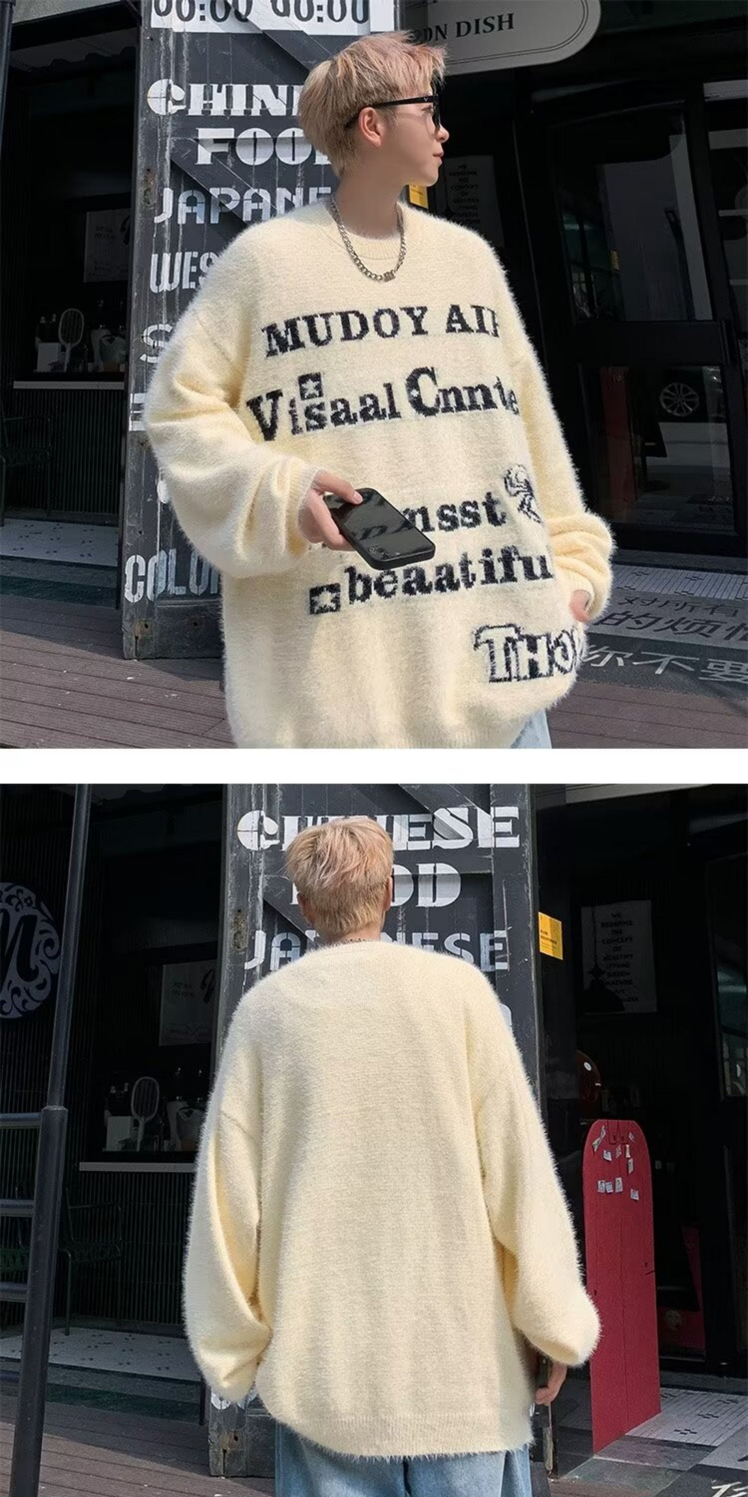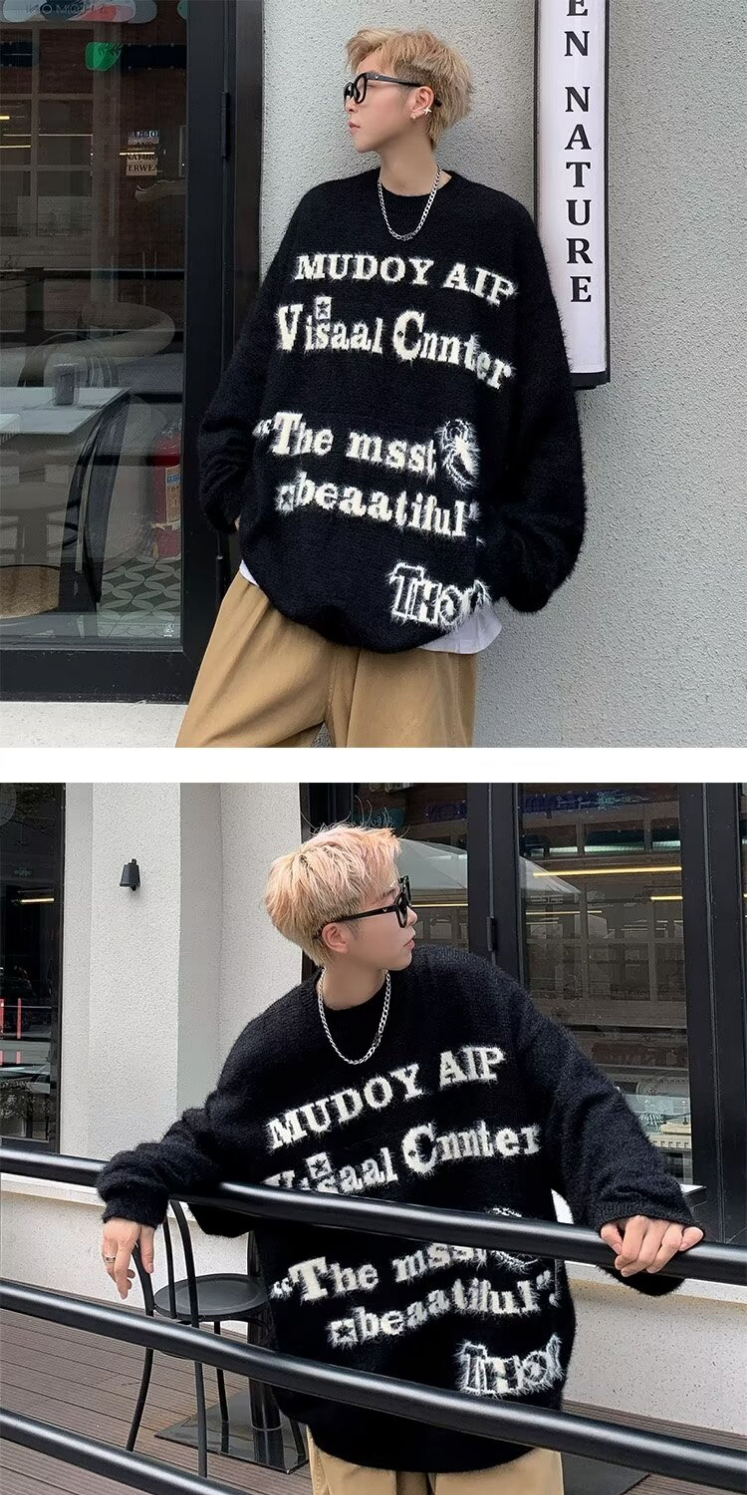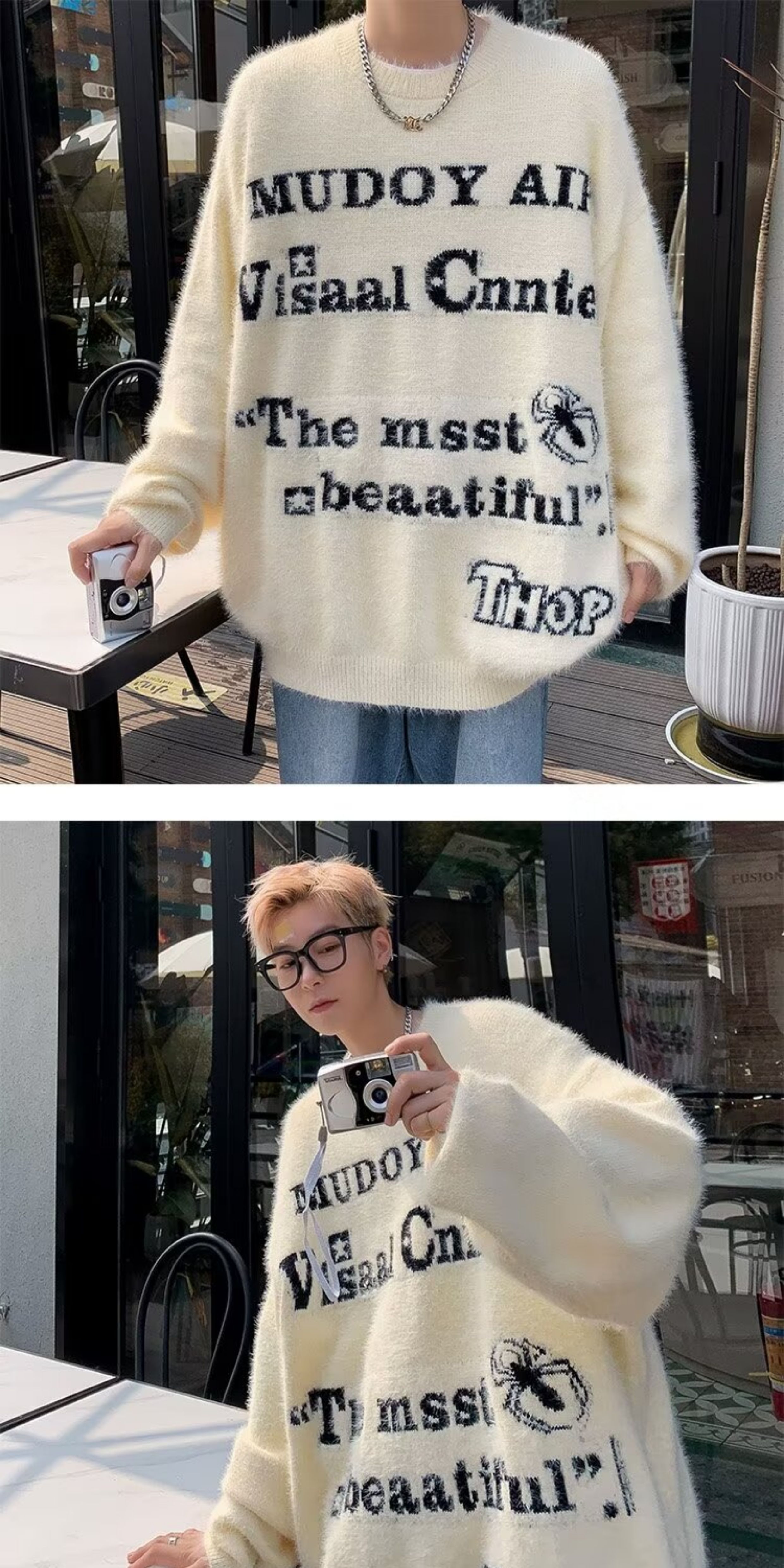 美式仿貂絨毛衣男春季裝寬松圓領內搭線衣高街嘻哈潮流情侶針織衫