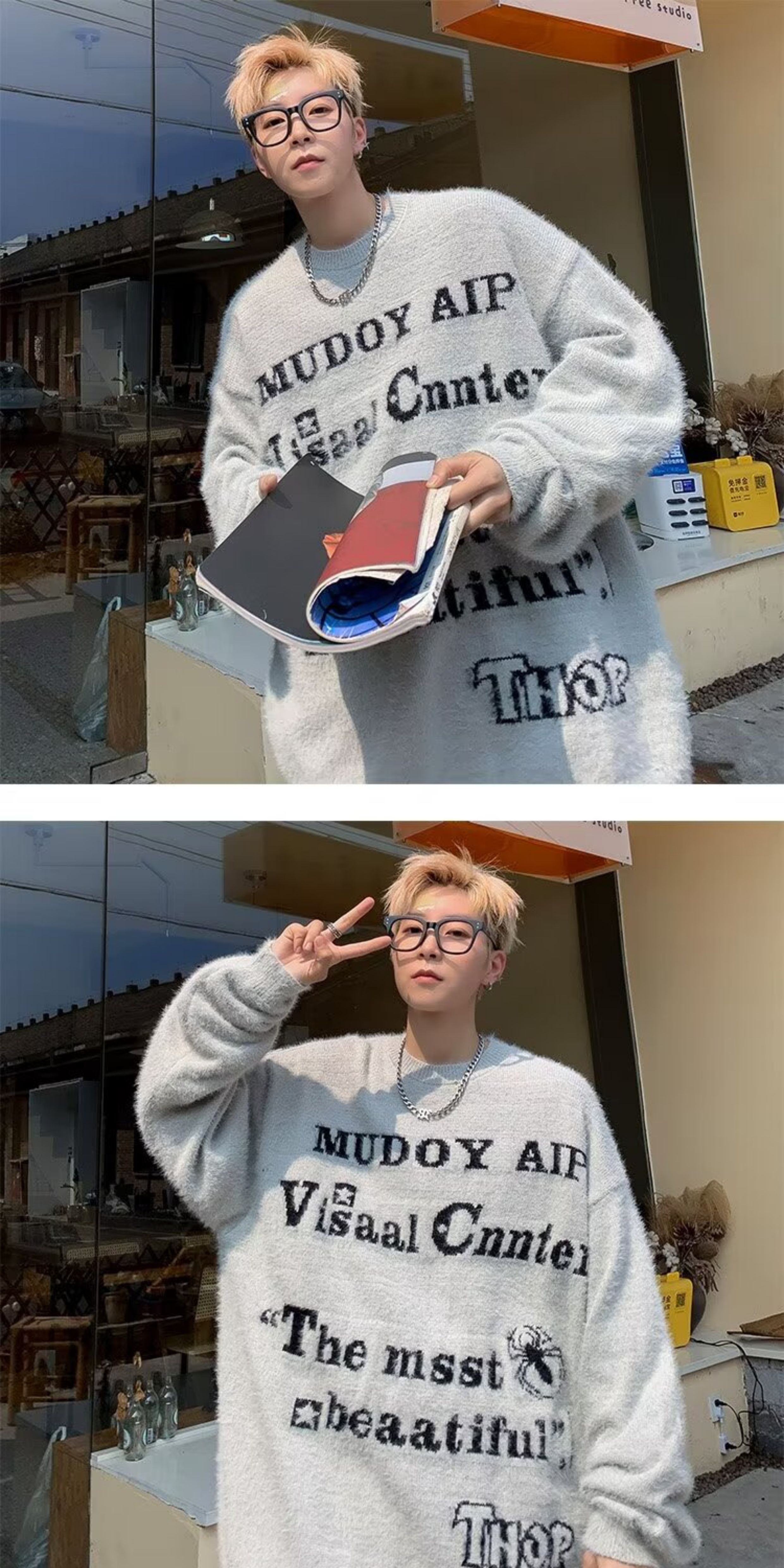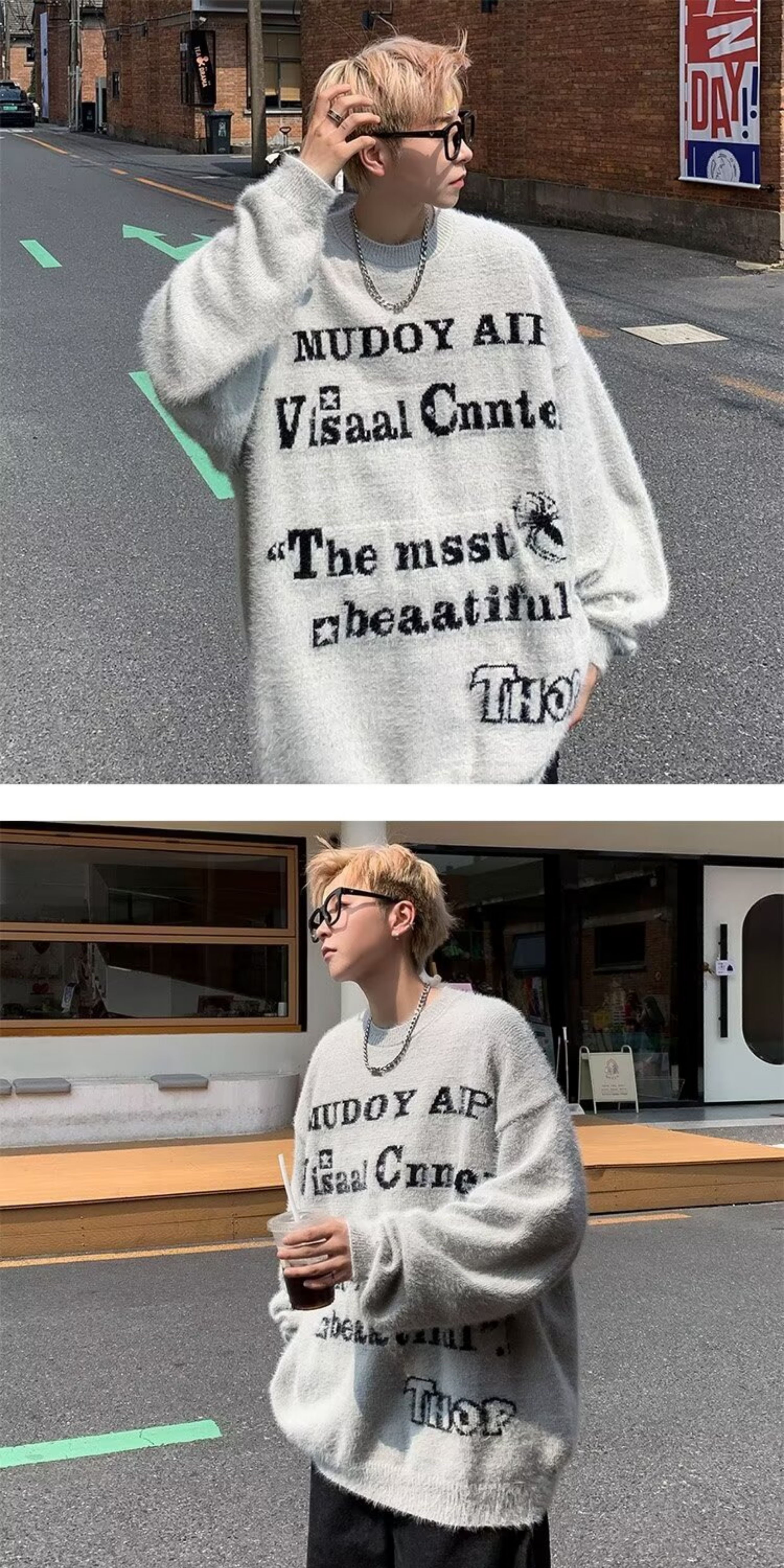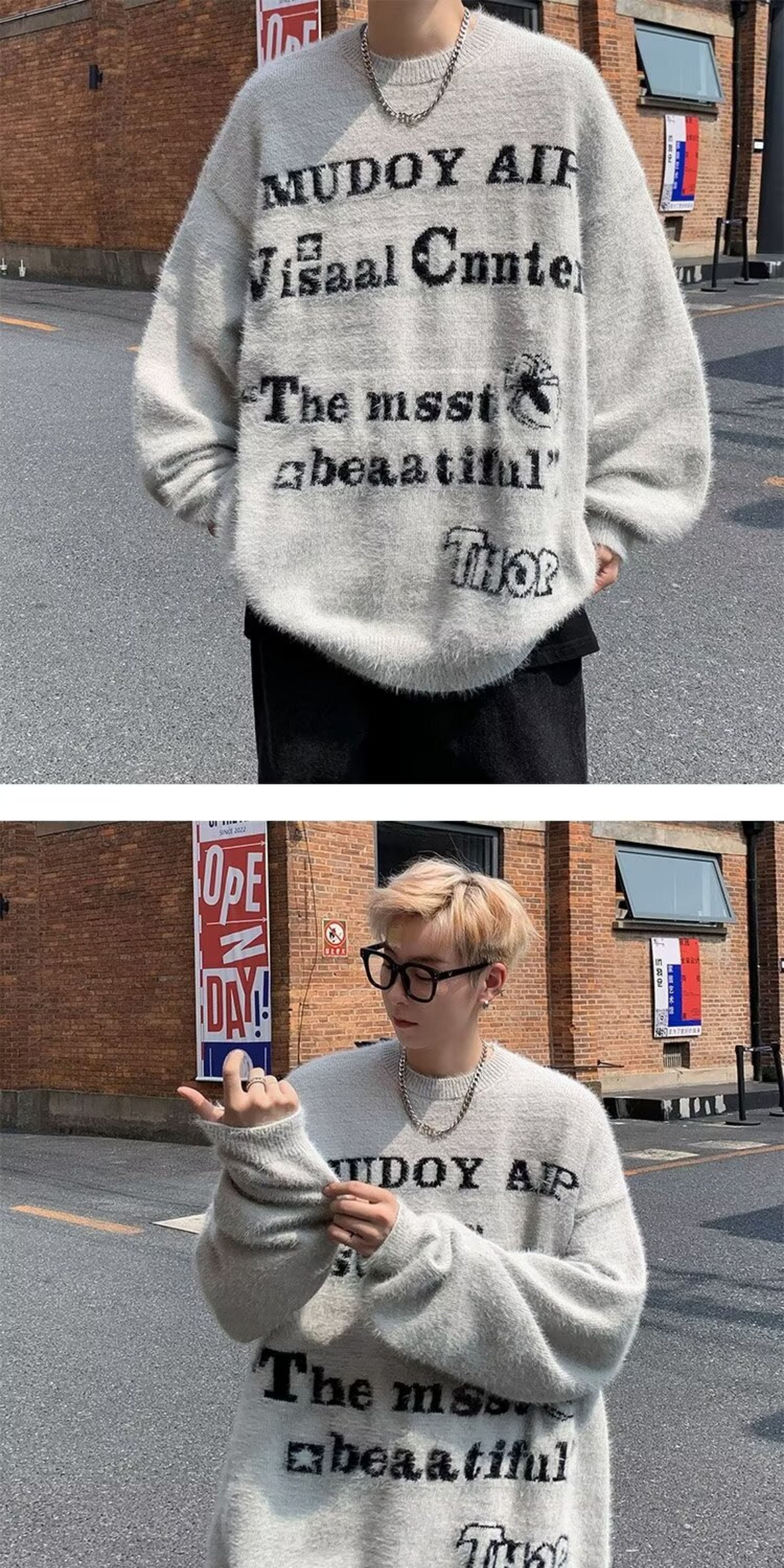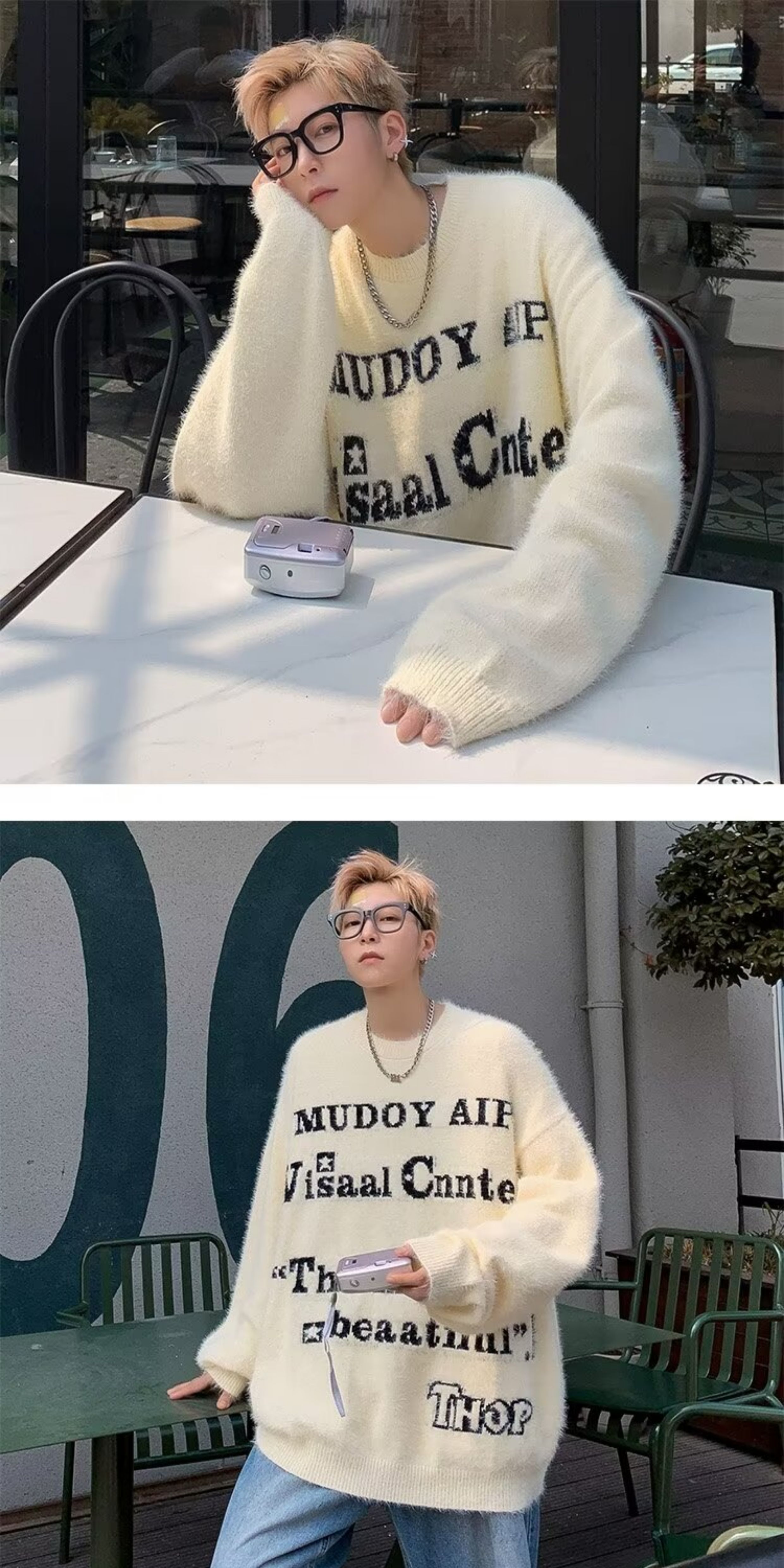 美式仿貂絨毛衣男春季裝寬松圓領內搭線衣高街嘻哈潮流情侶針織衫