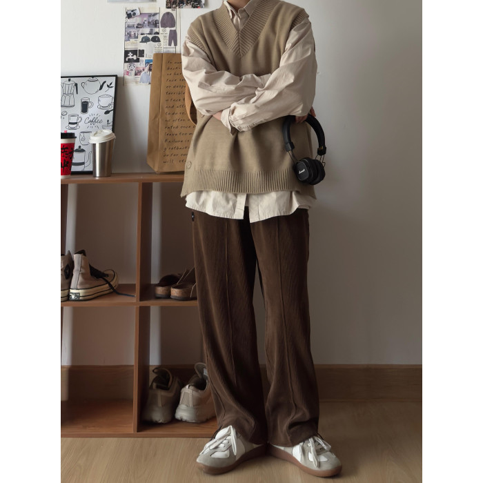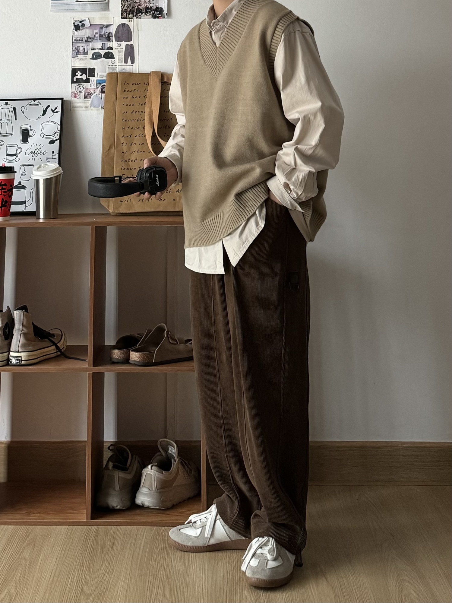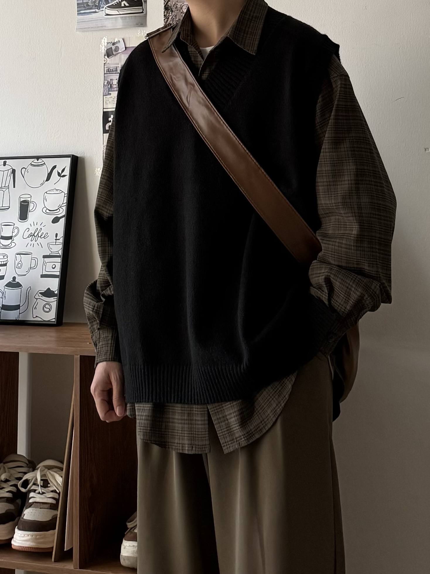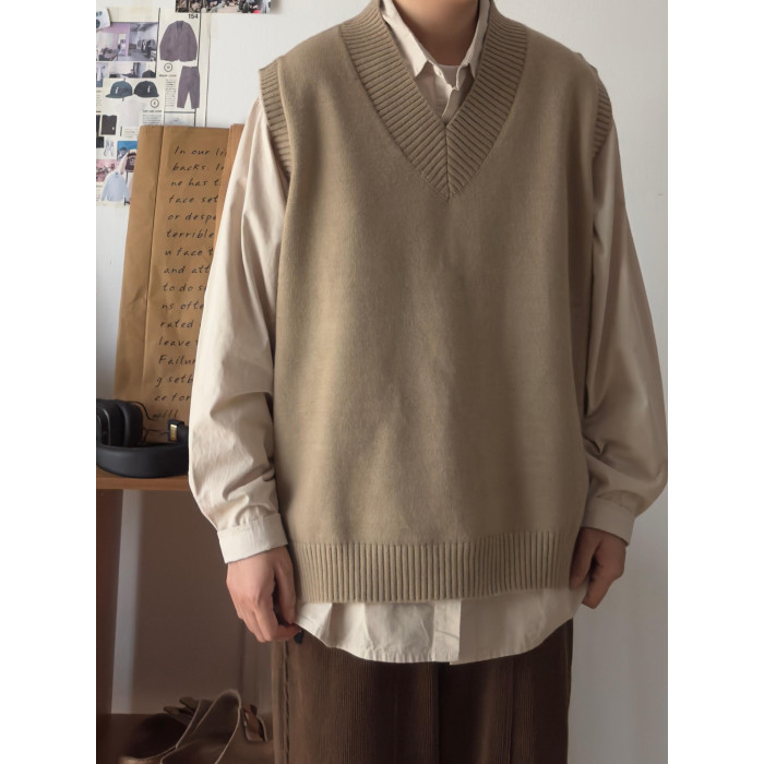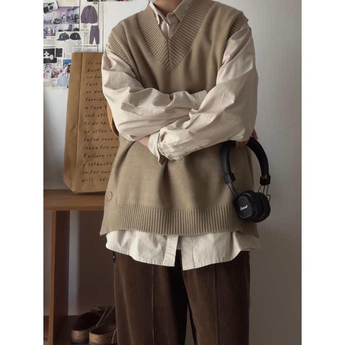 日系男裝秋冬休閒寬松V領針織馬甲毛衣復古純色中性情侶背心男女