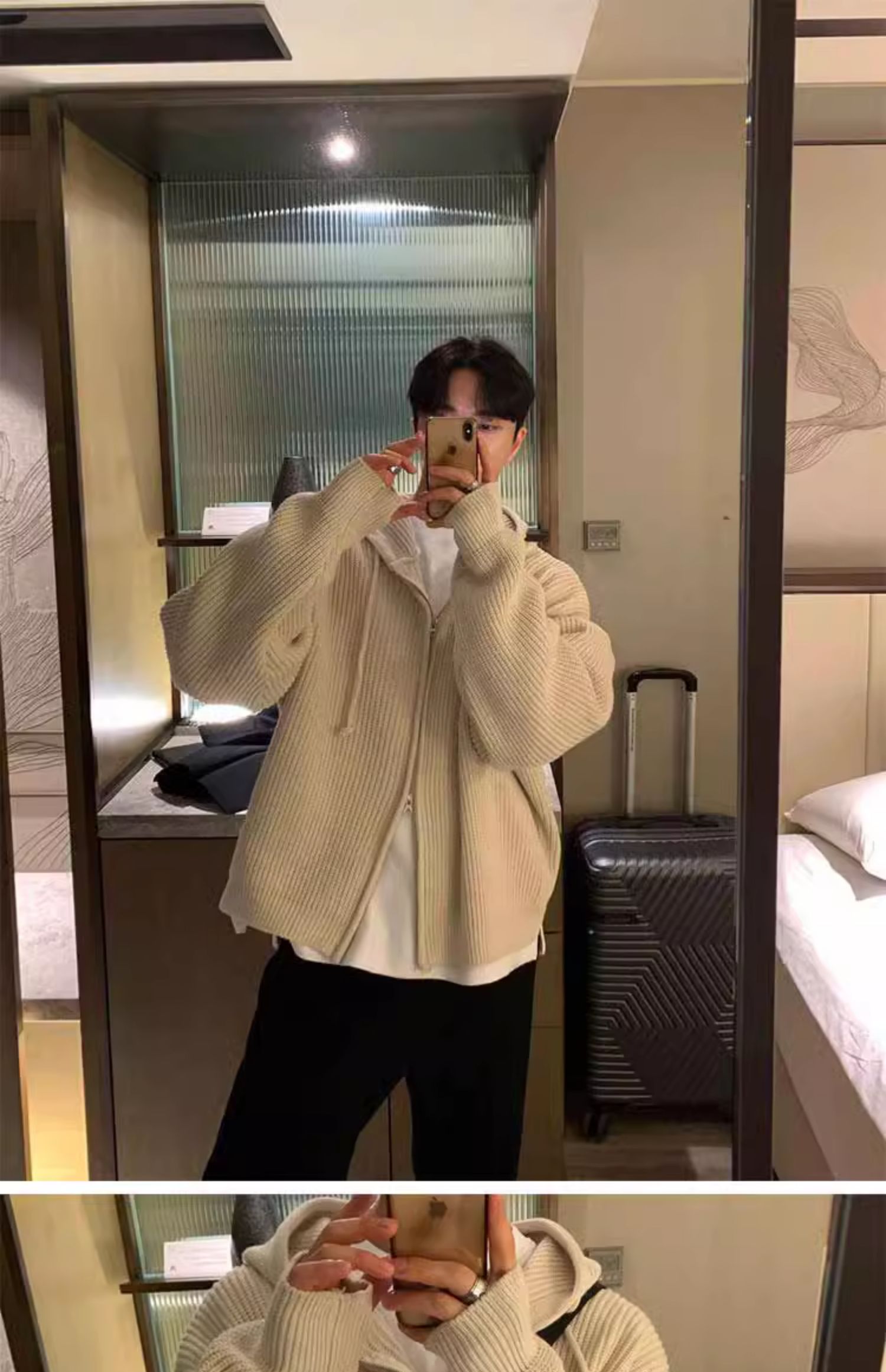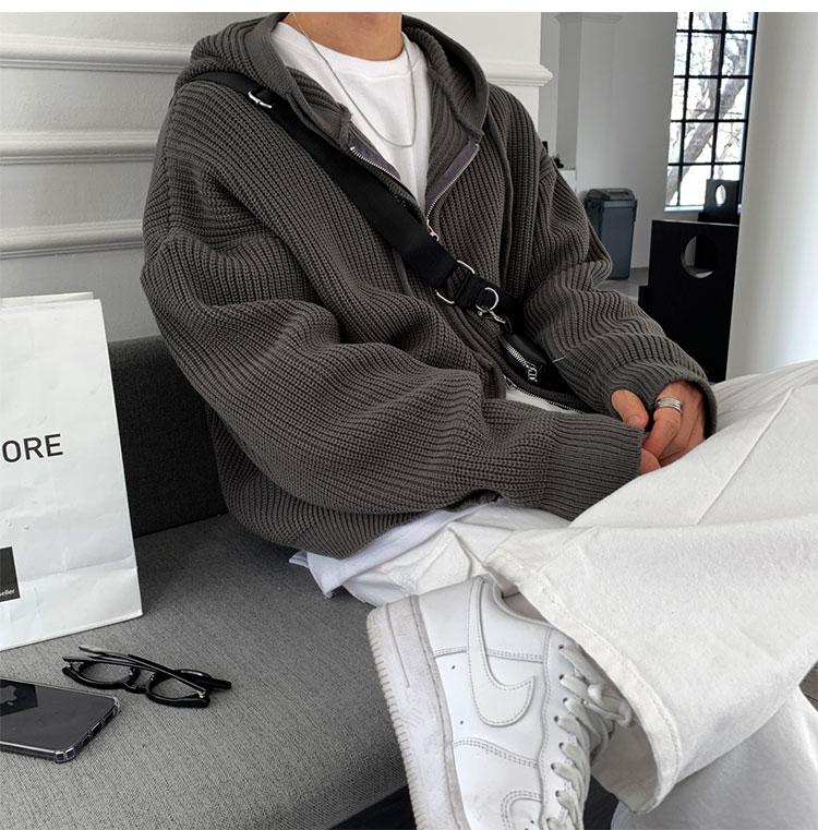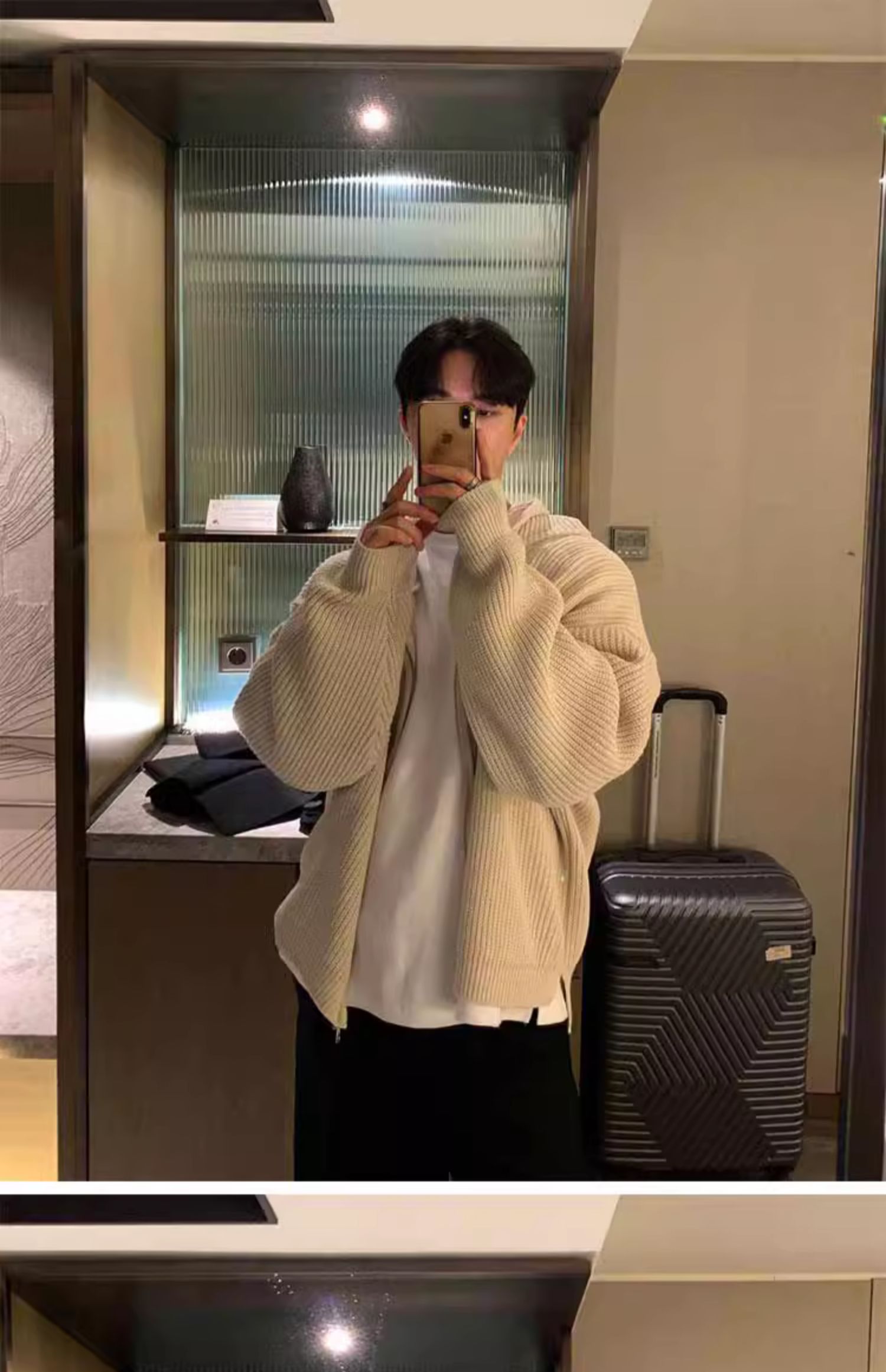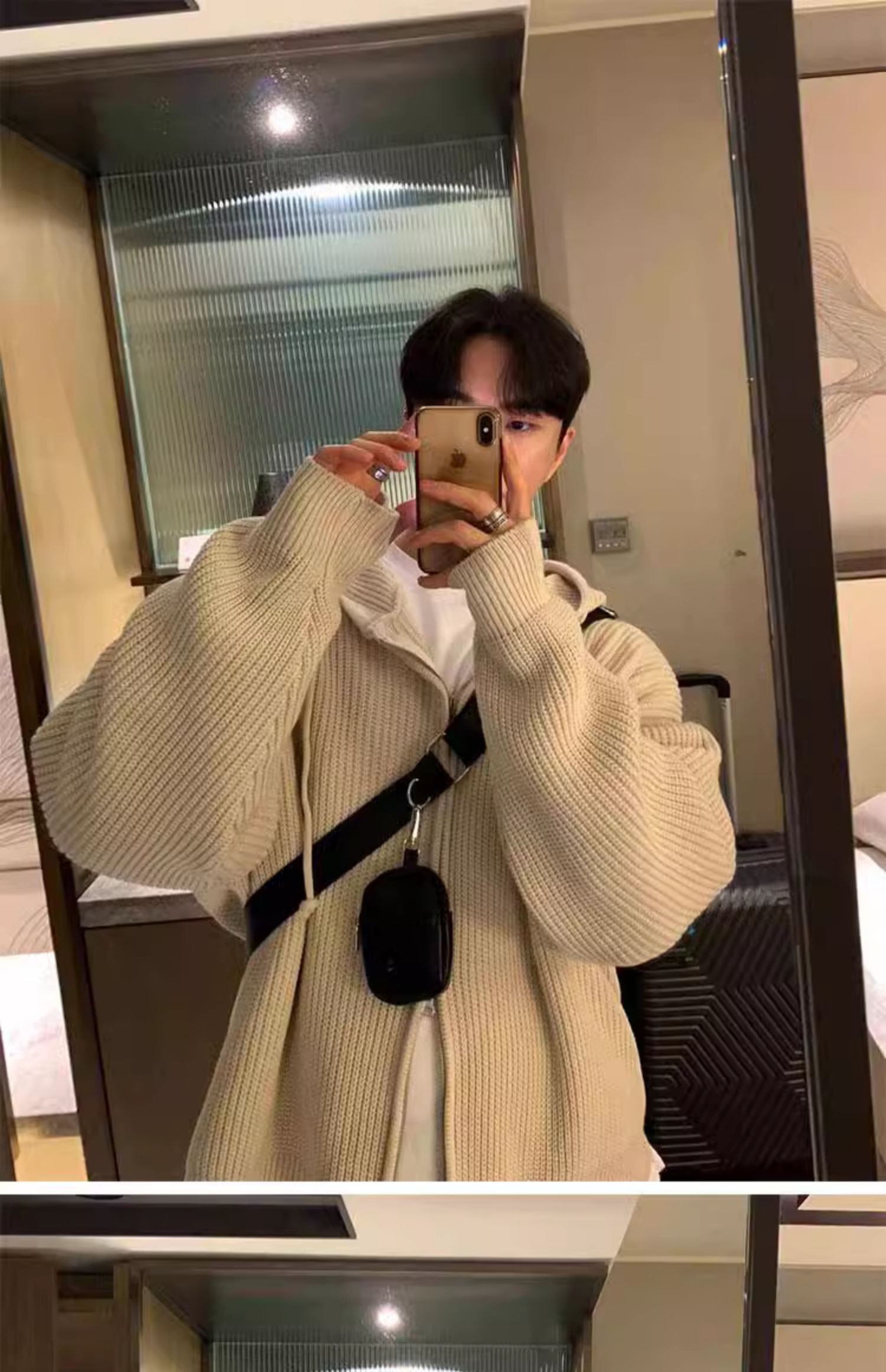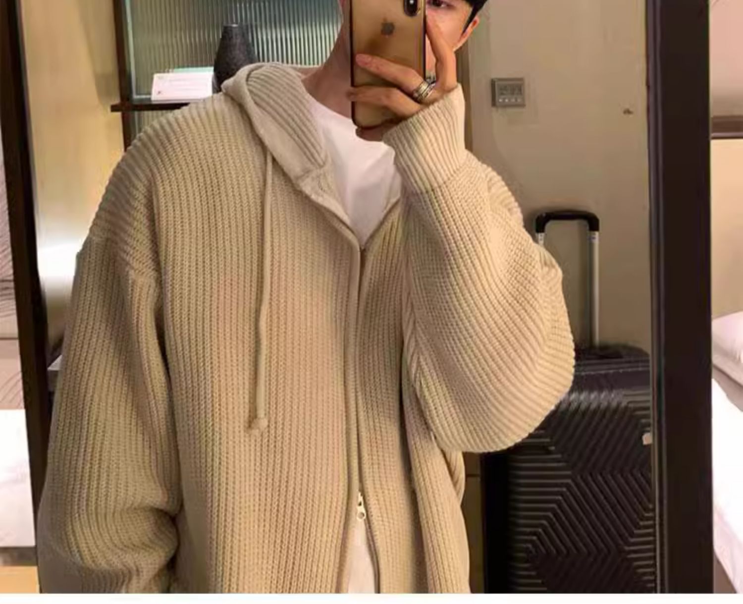 美式針織開衫毛衣外套男秋冬新款復古慵懶風潮牌百搭純色拉鍊線衣