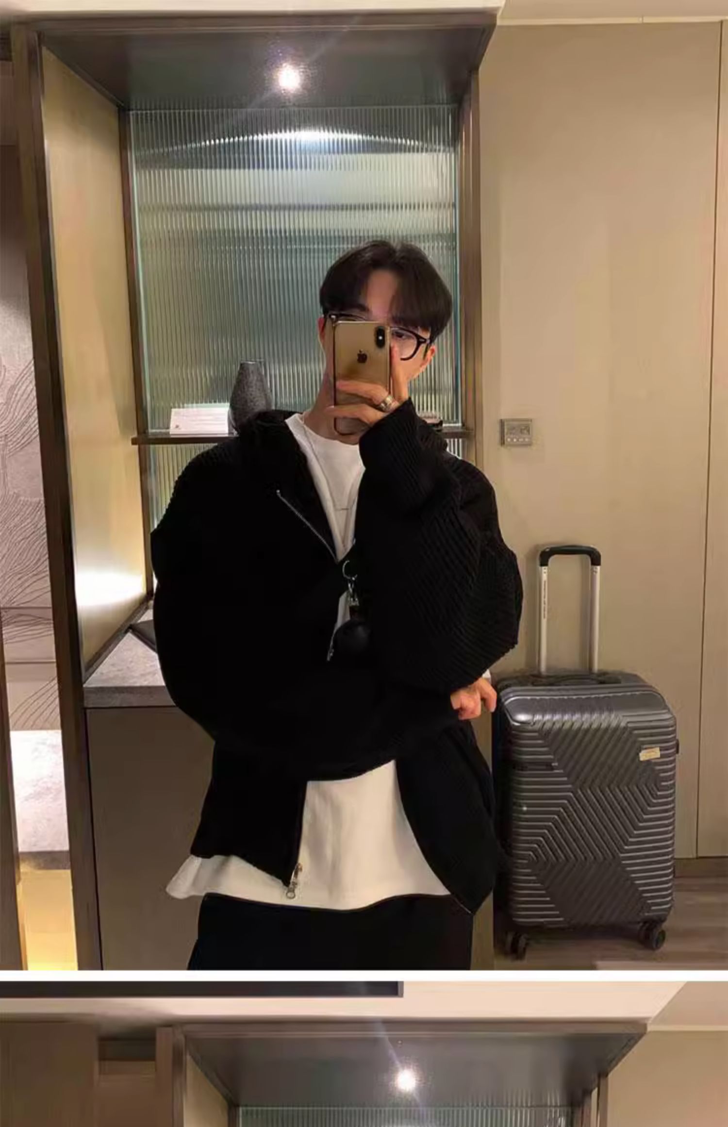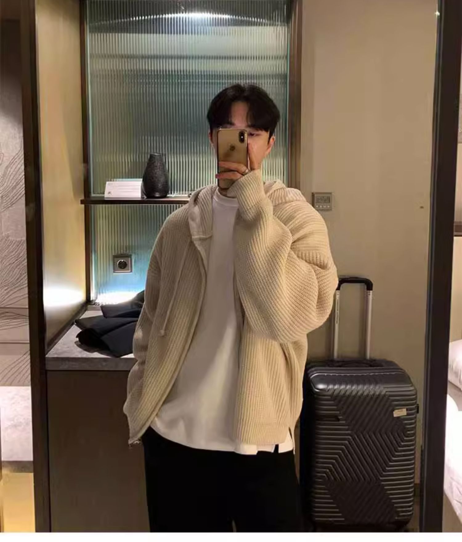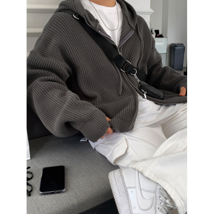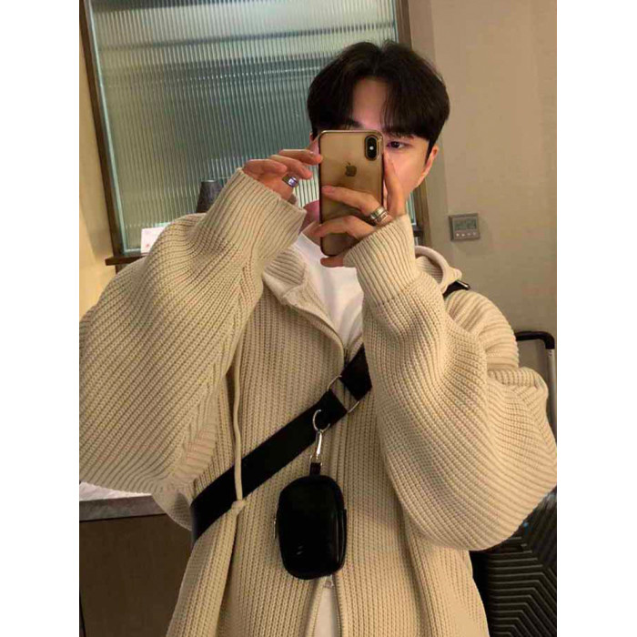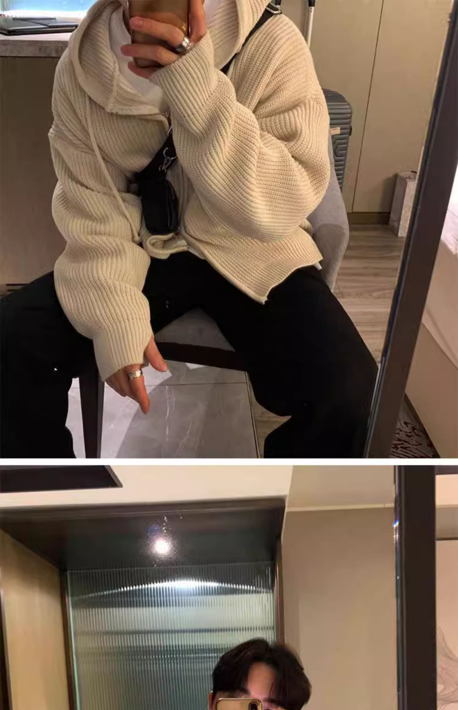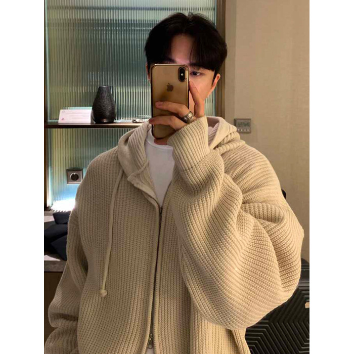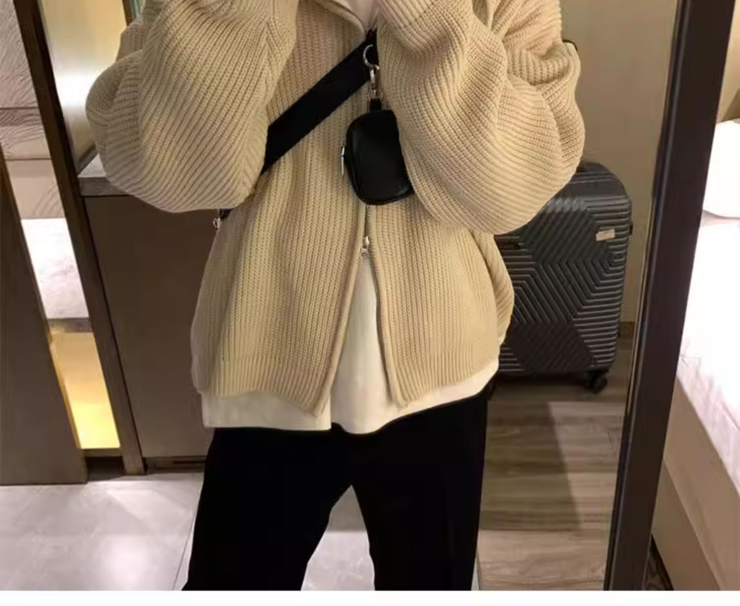 美式針織開衫毛衣外套男秋冬新款復古慵懶風潮牌百搭純色拉鍊線衣
