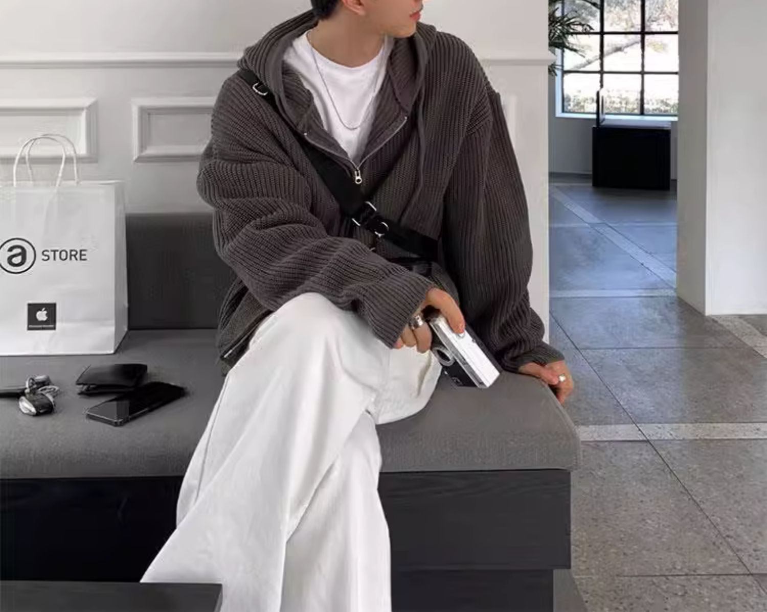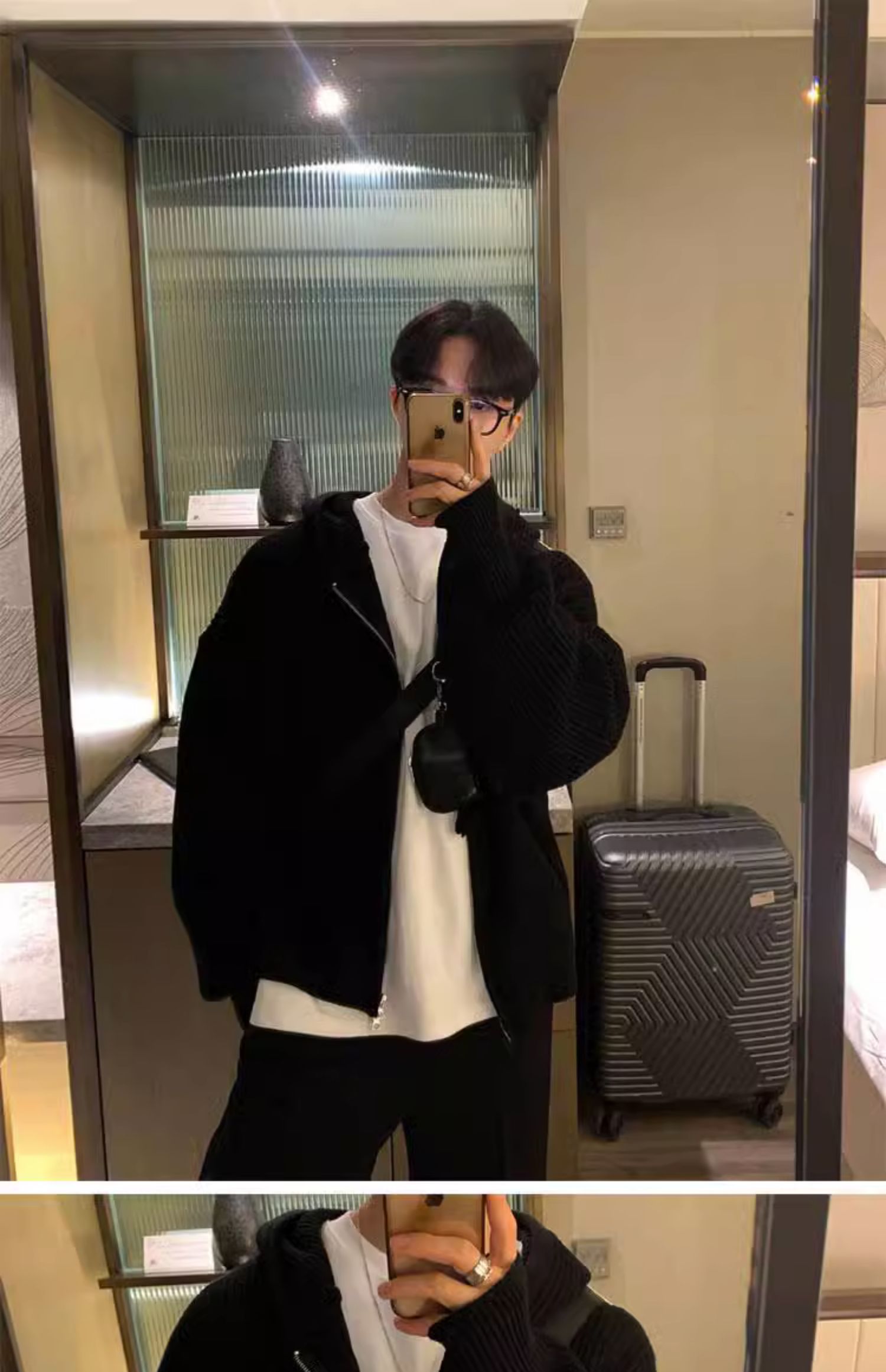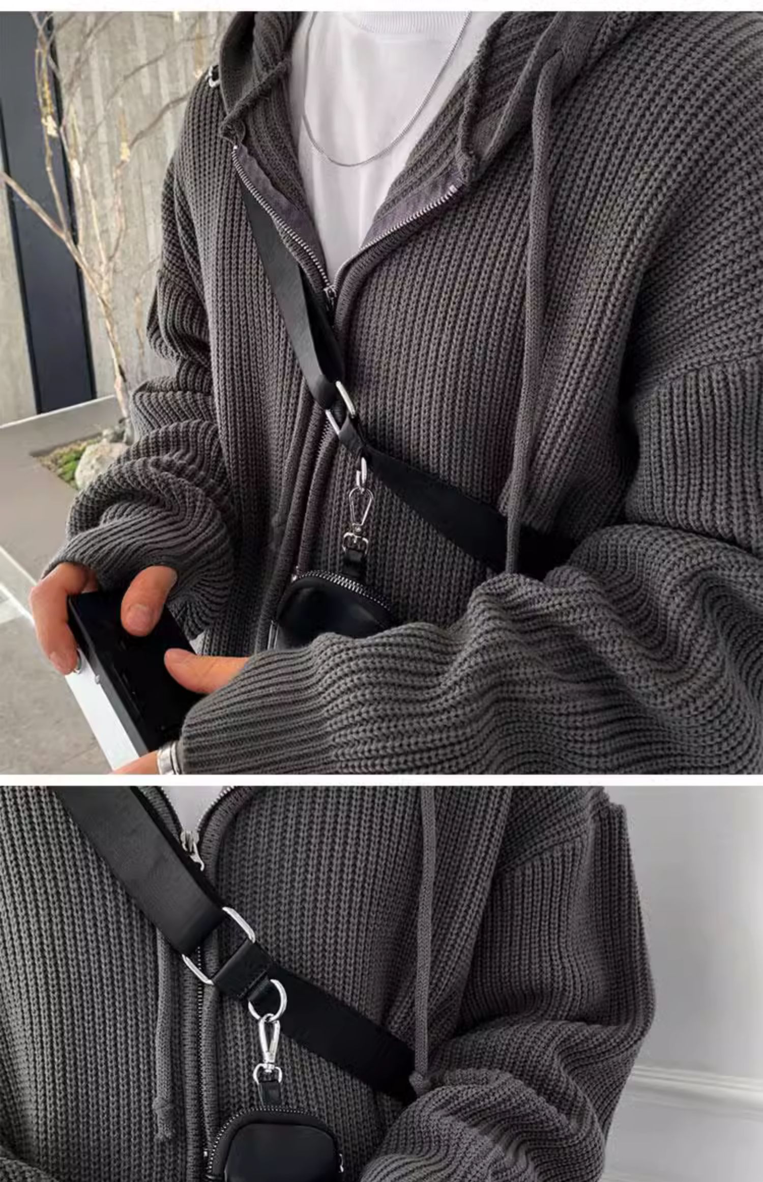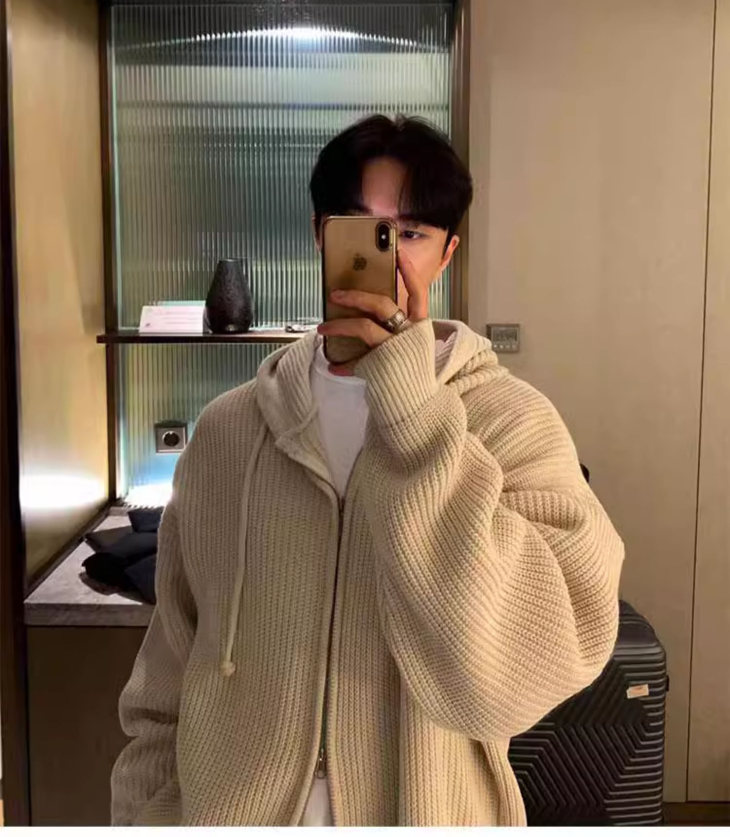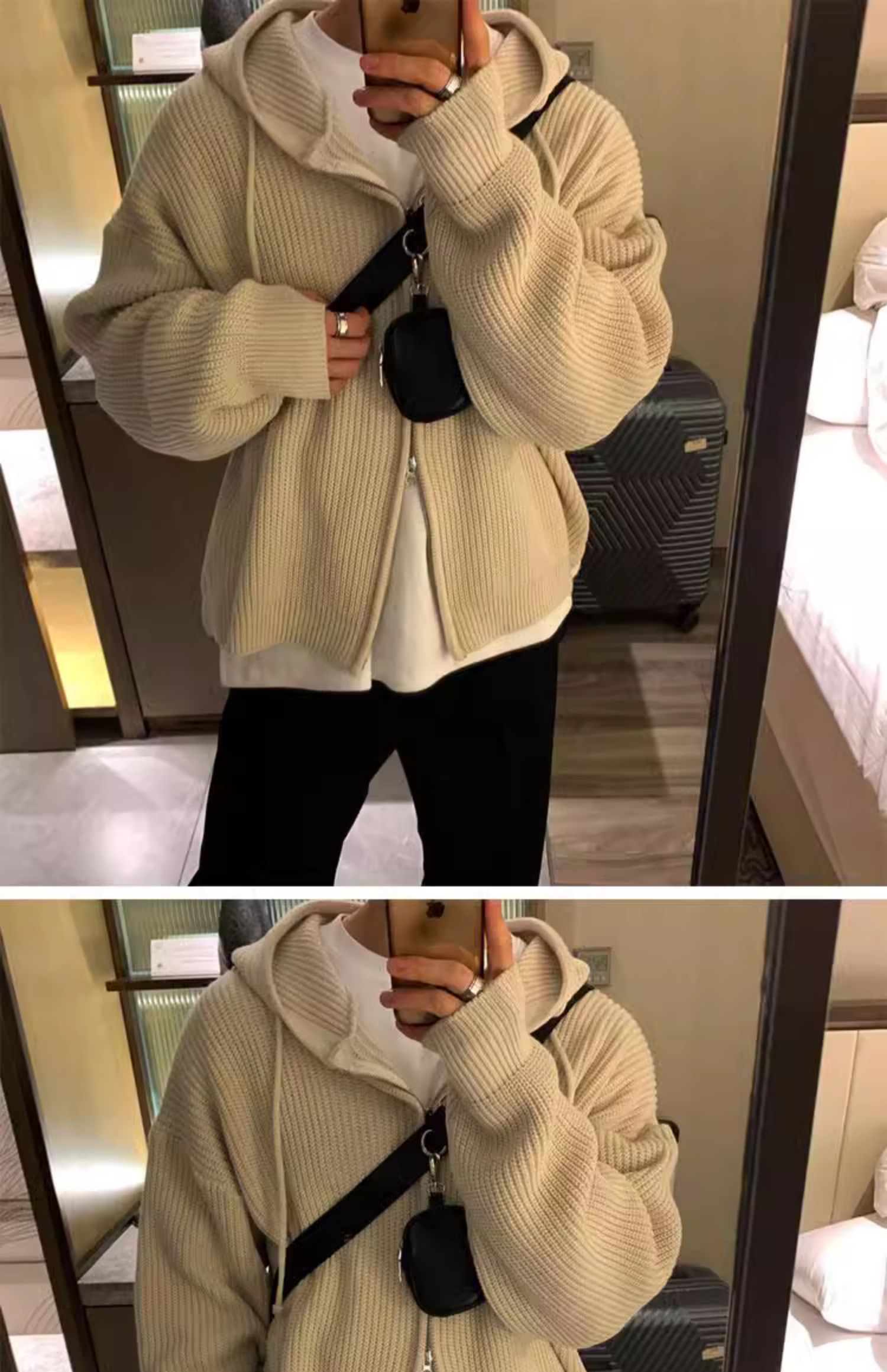 美式針織開衫毛衣外套男秋冬新款復古慵懶風潮牌百搭純色拉鍊線衣