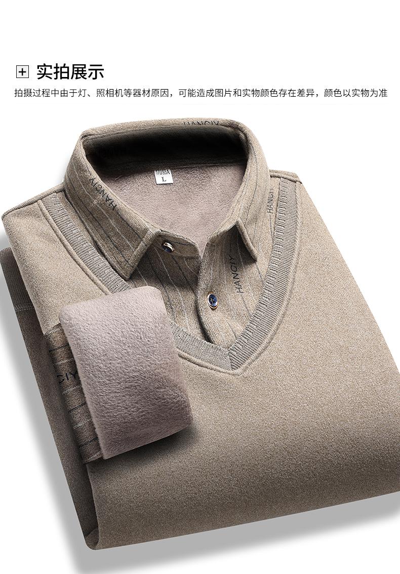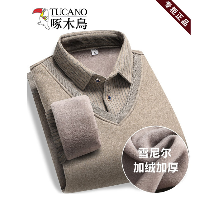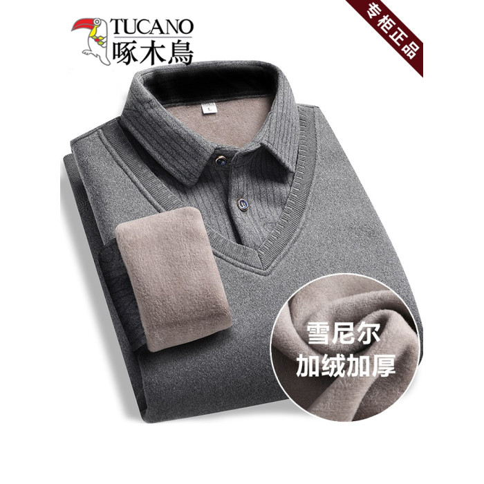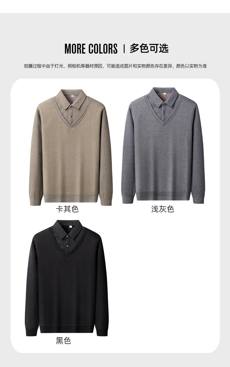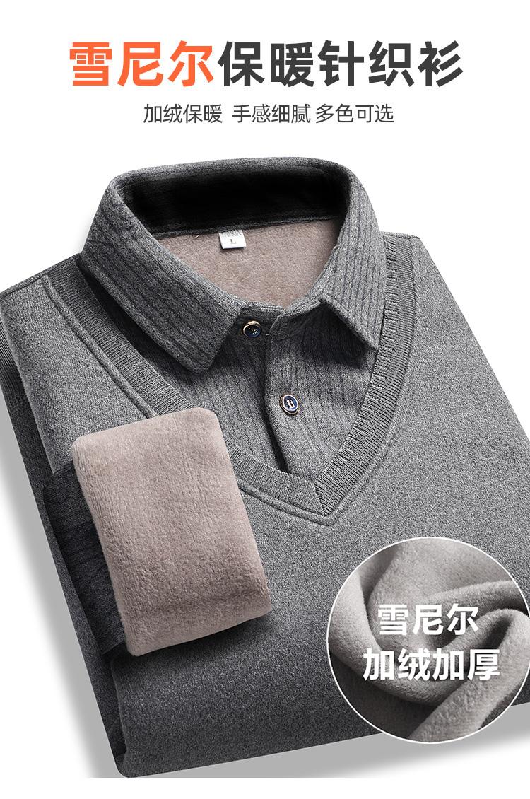啄木鳥爸爸裝加絨加厚假兩件毛衣t恤打底衫中老年雪尼爾針織衫男