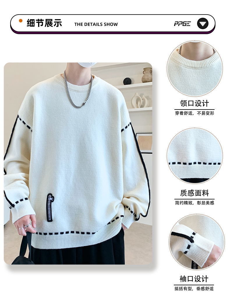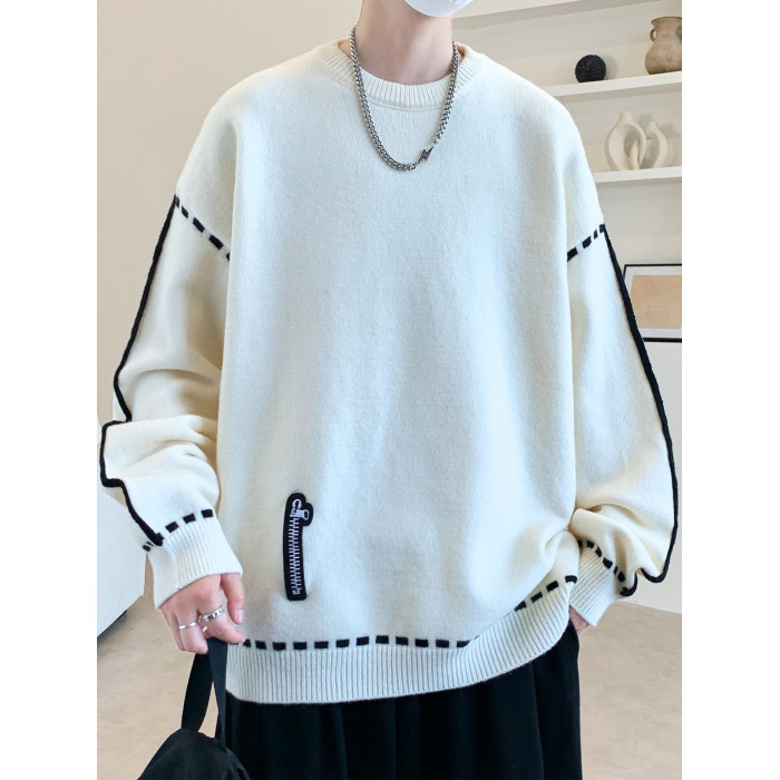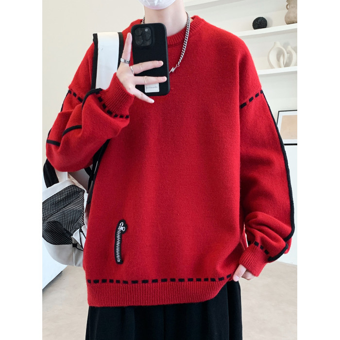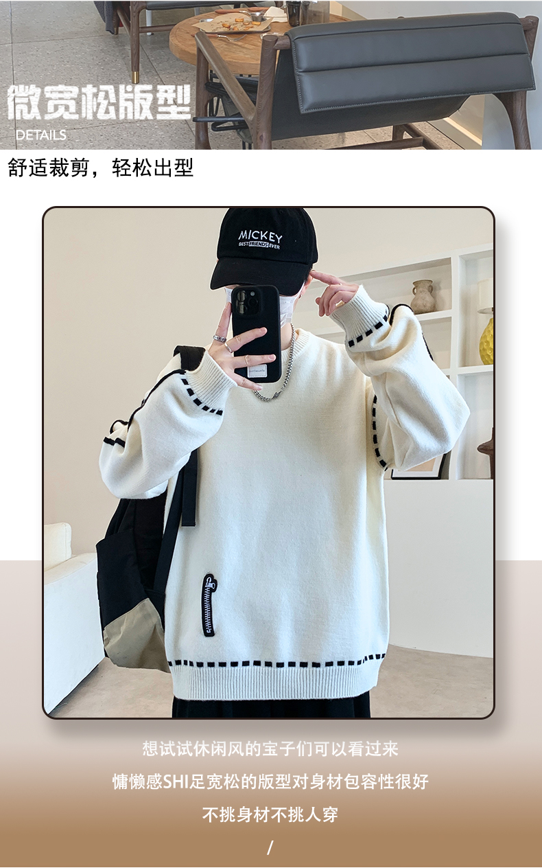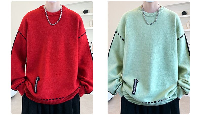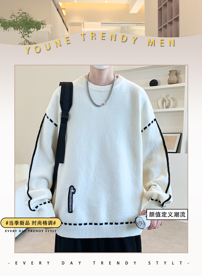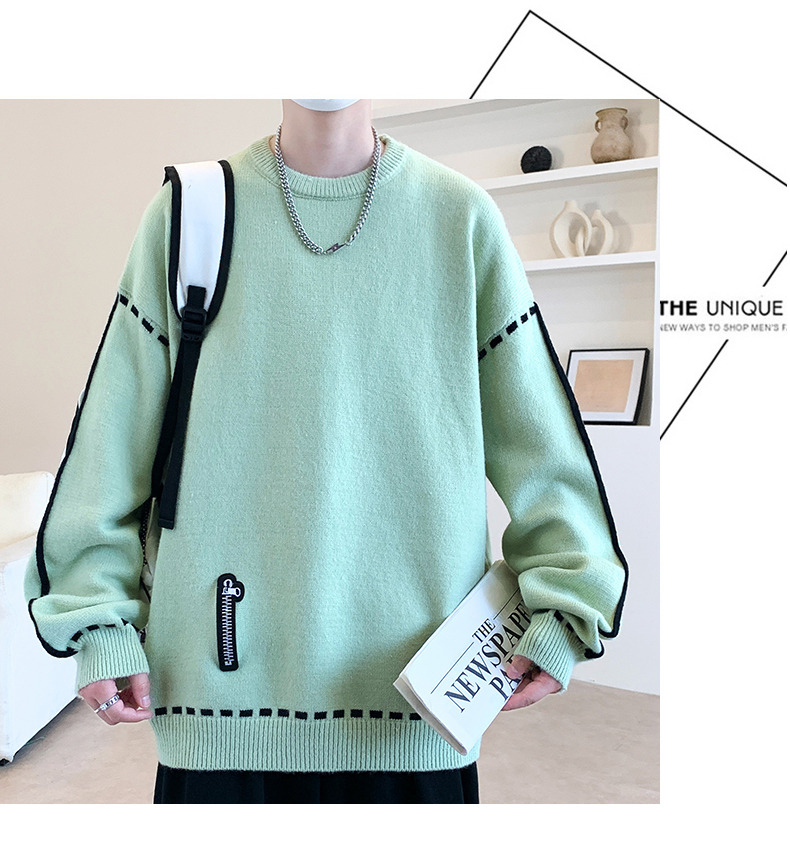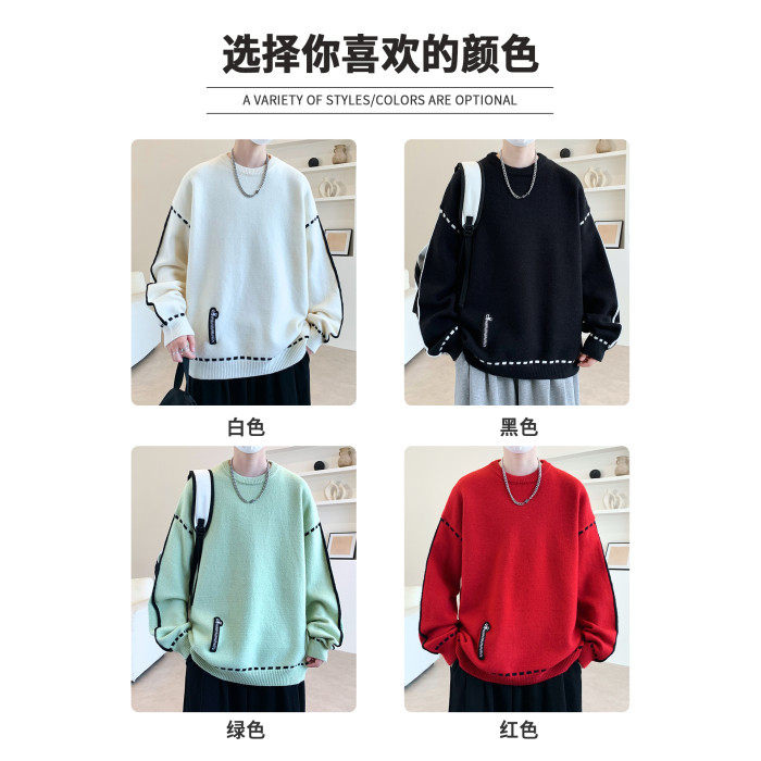 圓領毛衣男秋冬季學院風針織衫男寬松線條感撞色毛衫青少年毛線衣