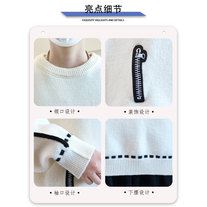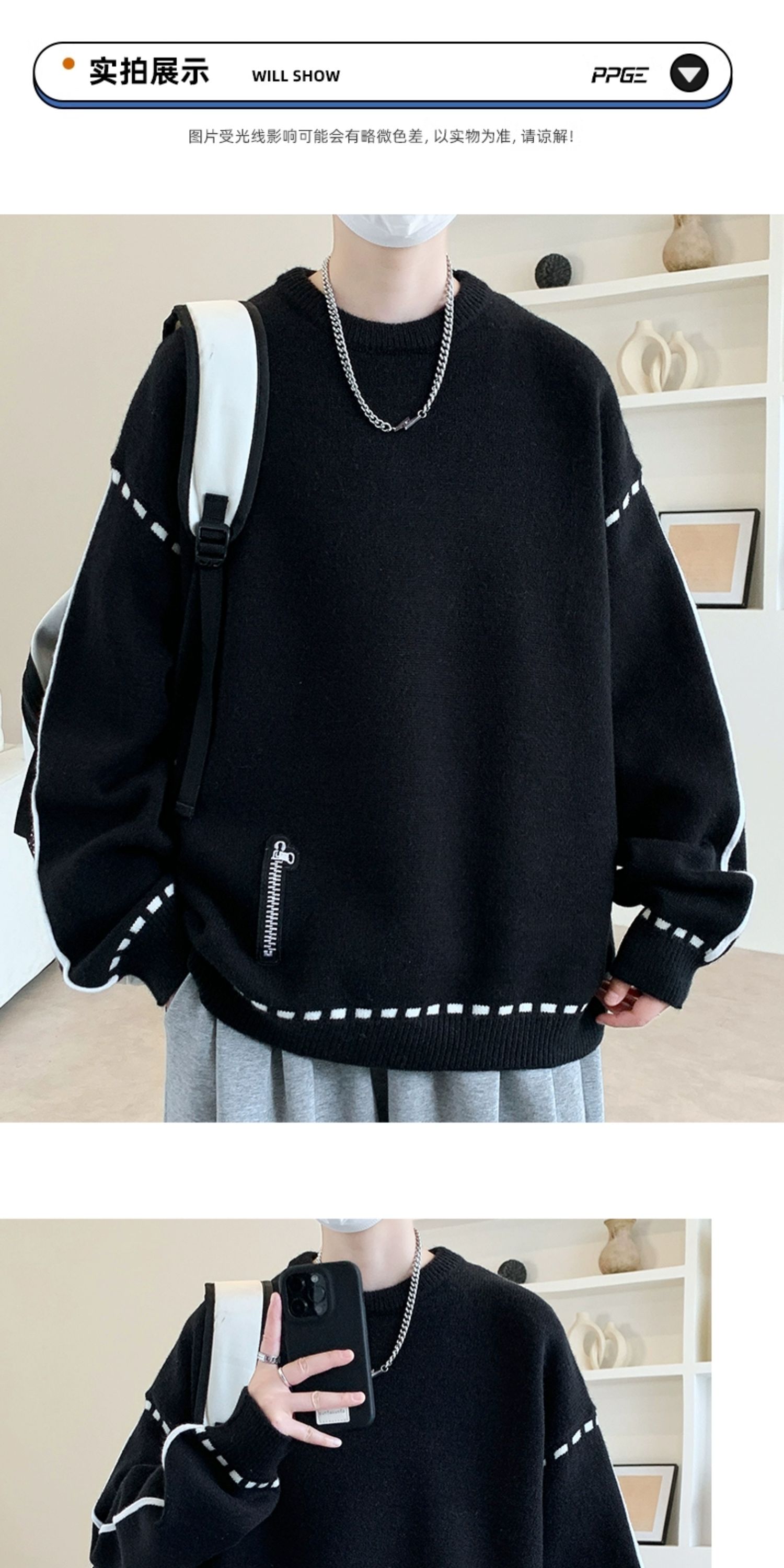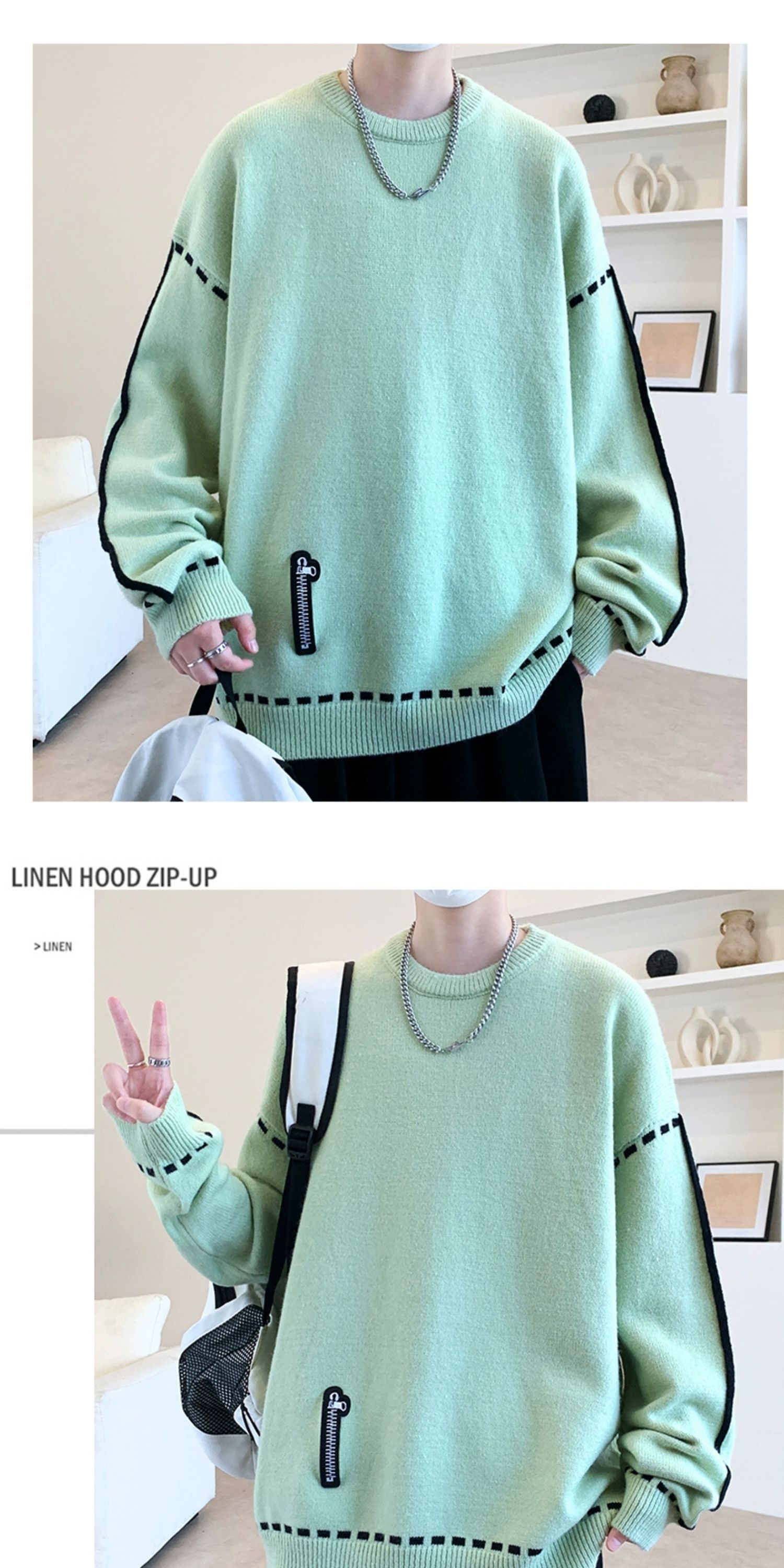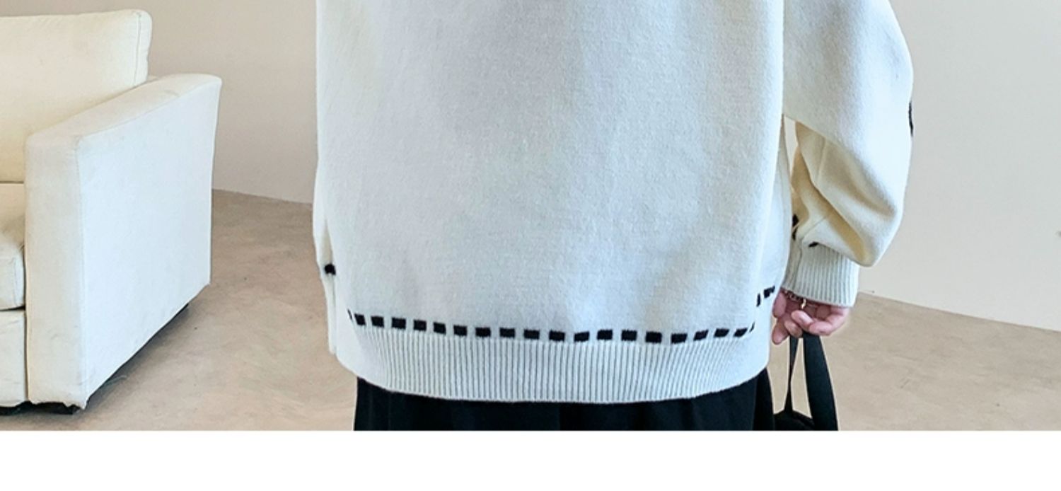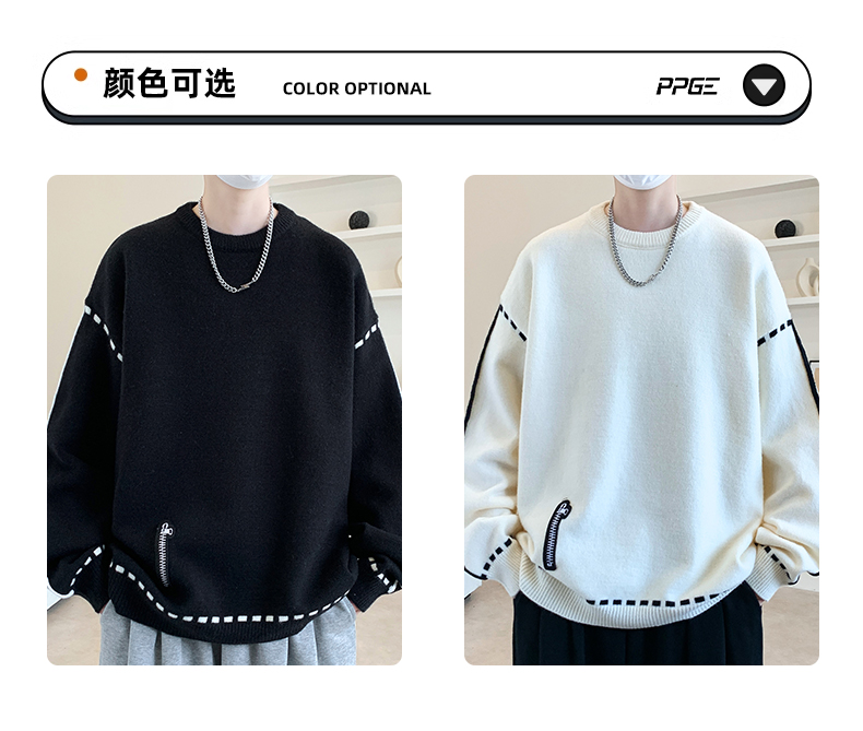 圓領毛衣男秋冬季學院風針織衫男寬松線條感撞色毛衫青少年毛線衣