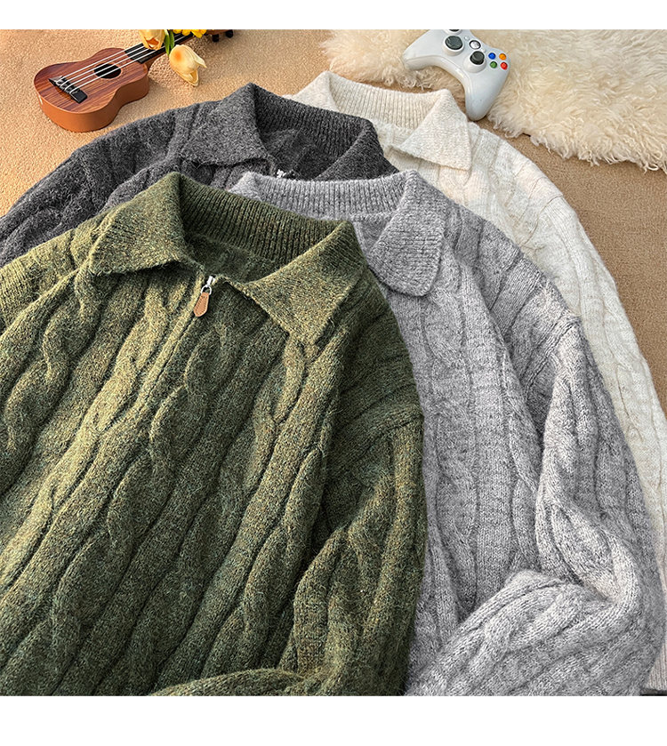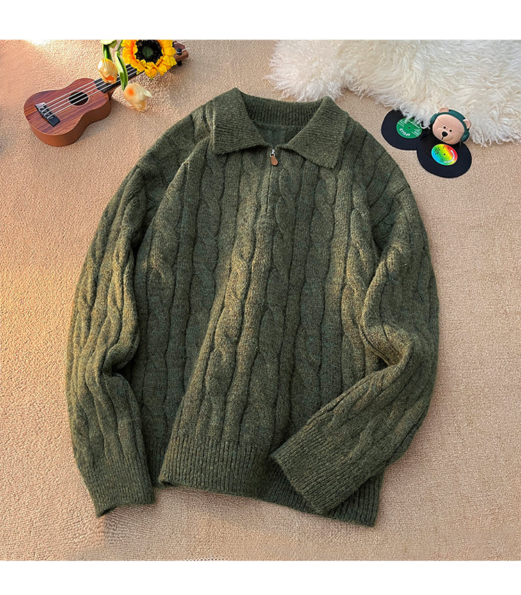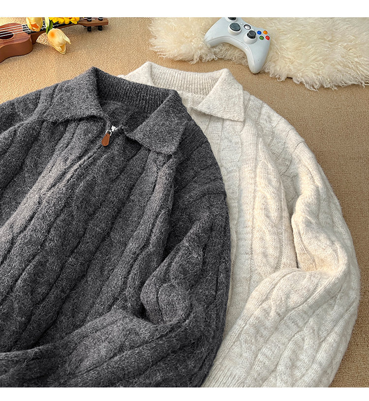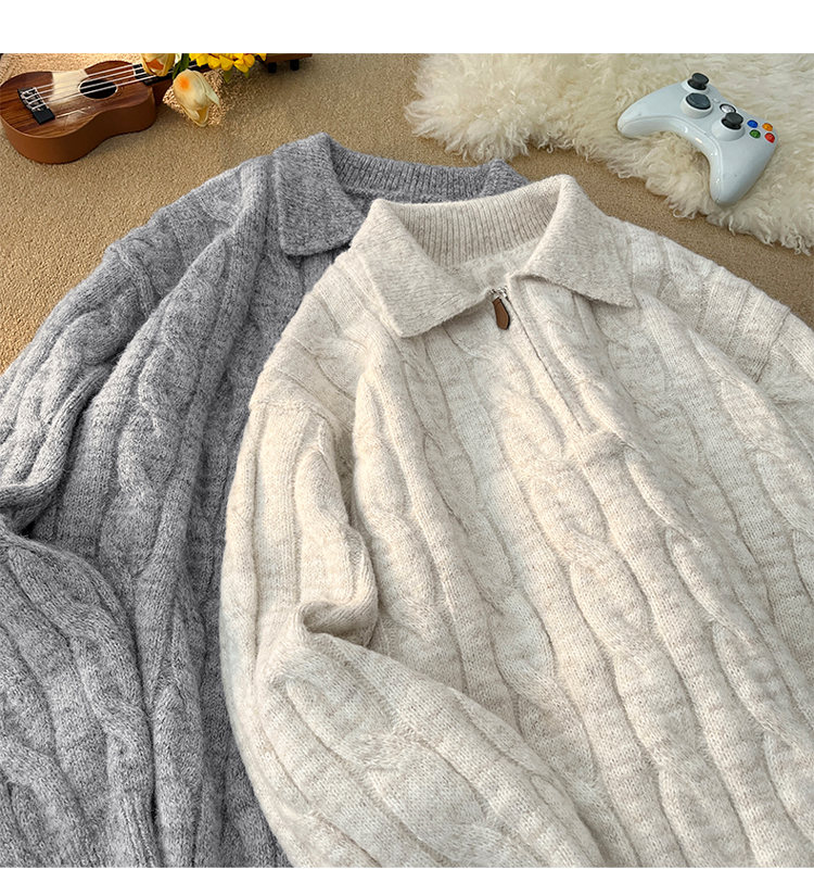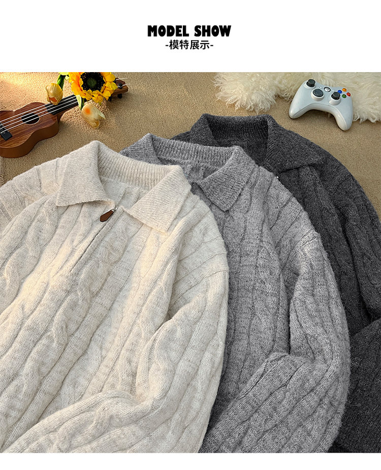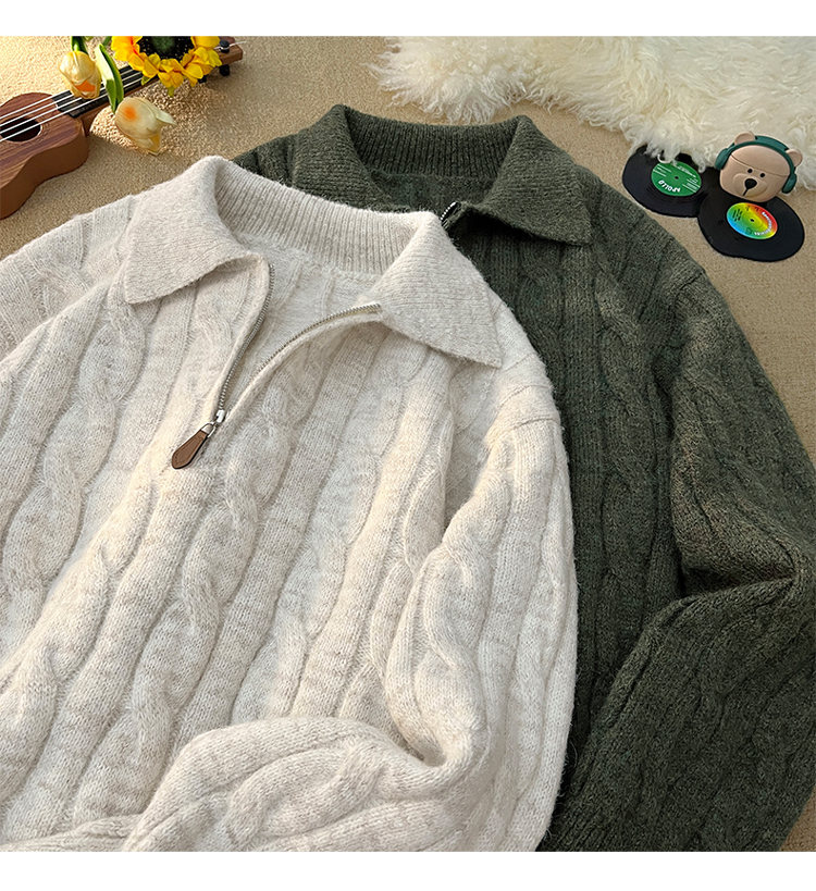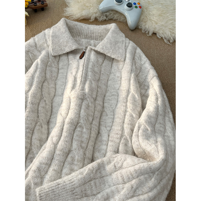 復古麻花半拉鍊針織衫男冬潮牌慵懶風情侶毛衣美式簡約休閒POLO衫