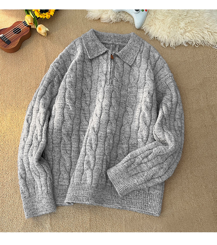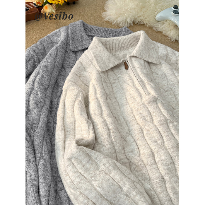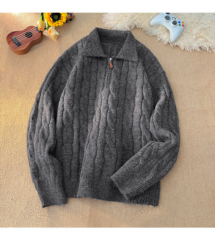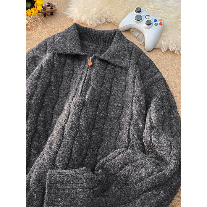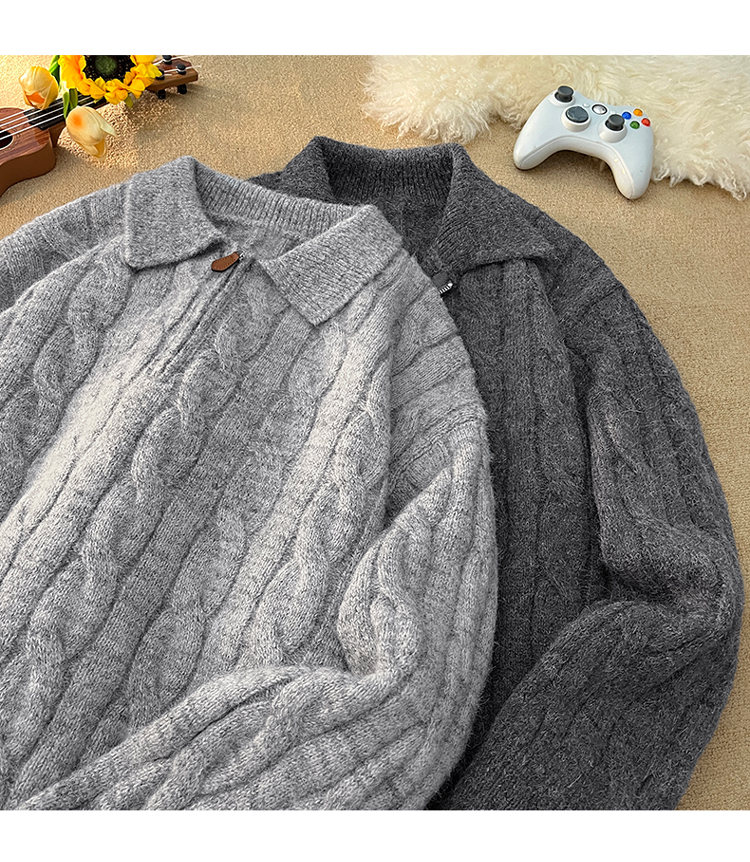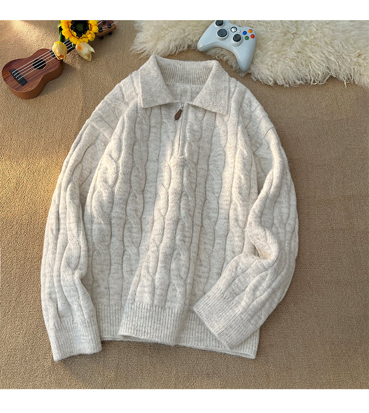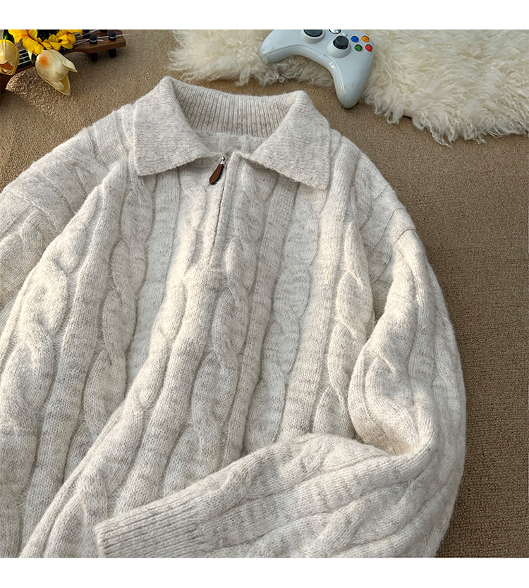 復古麻花半拉鍊針織衫男冬潮牌慵懶風情侶毛衣美式簡約休閒POLO衫
