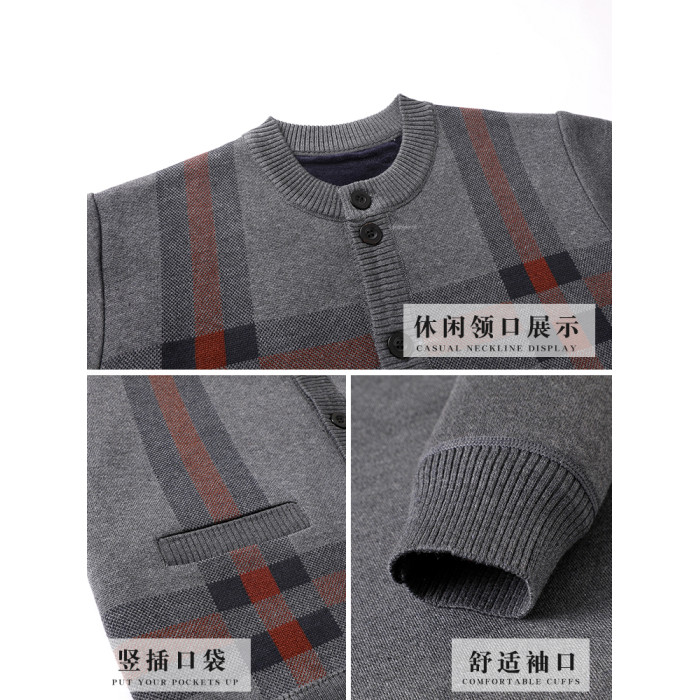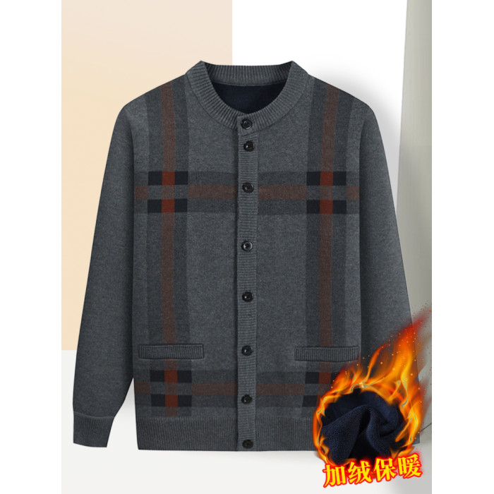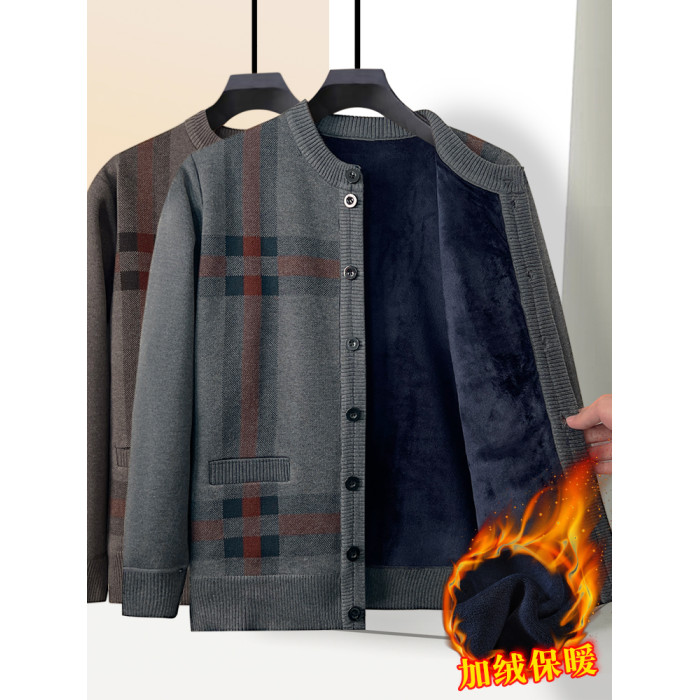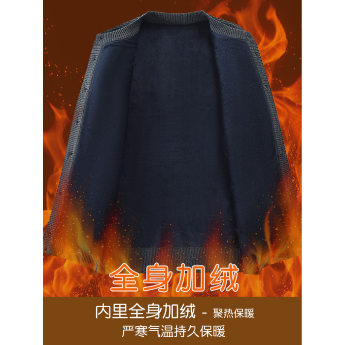 爸爸秋冬季加絨加厚開衫中老年人男保暖系釦針織毛衣外套爺爺上衣