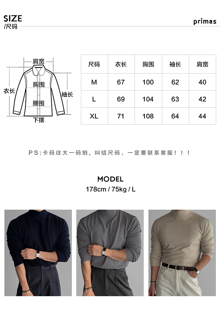 Primas 內搭界好手 半高領針織衫男秋冬純色毛衣打底衫上衣東大門