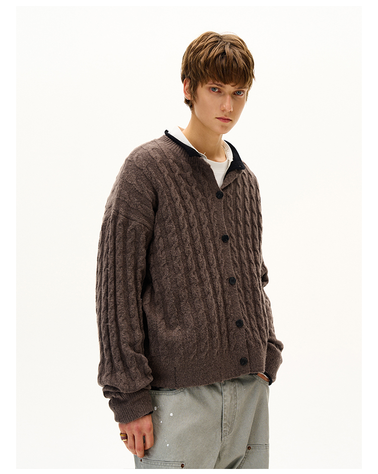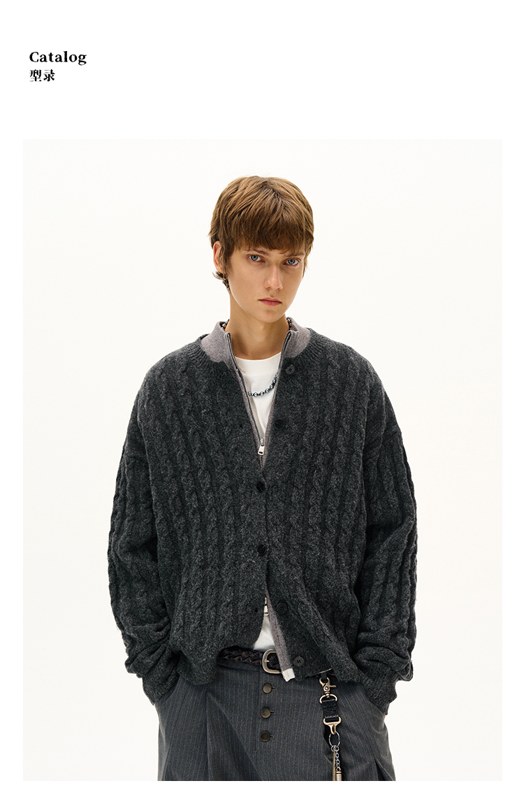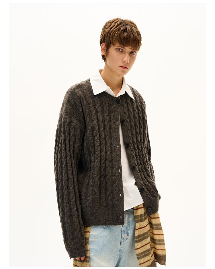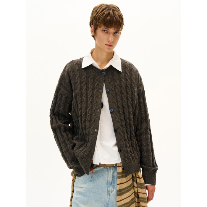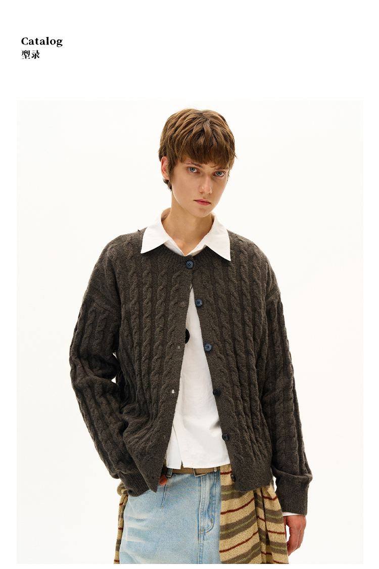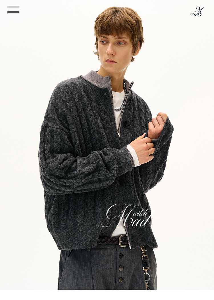 MADWITCH美式復古麻花紋羊毛混紡針織開衫男女寬松休閒萊賽爾外套