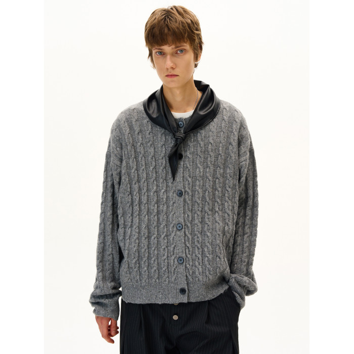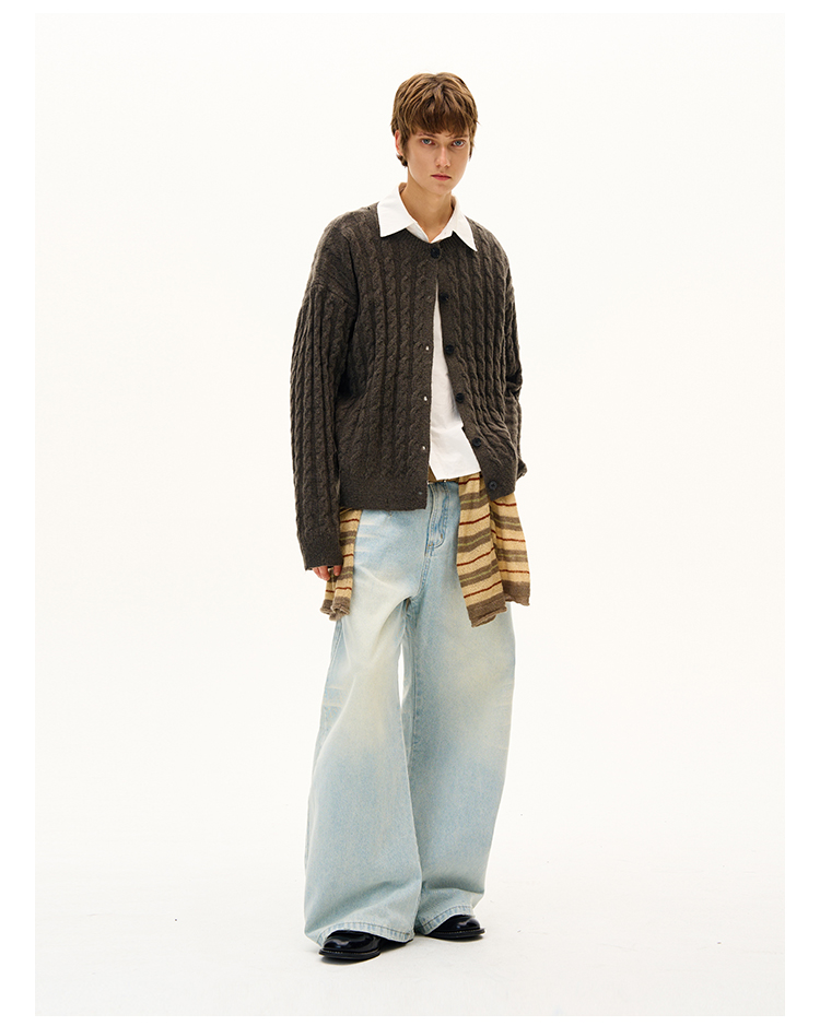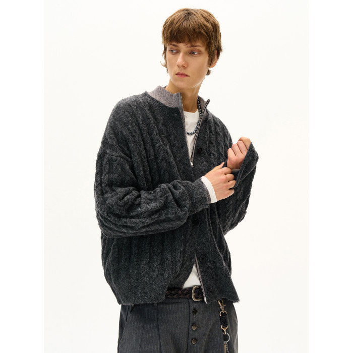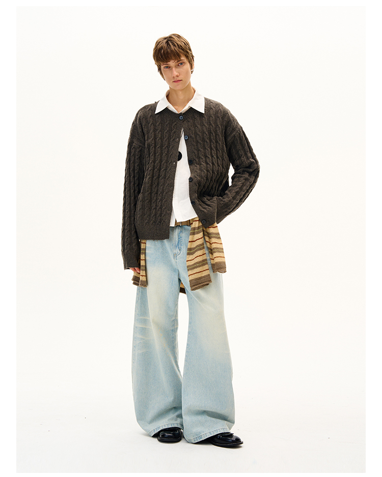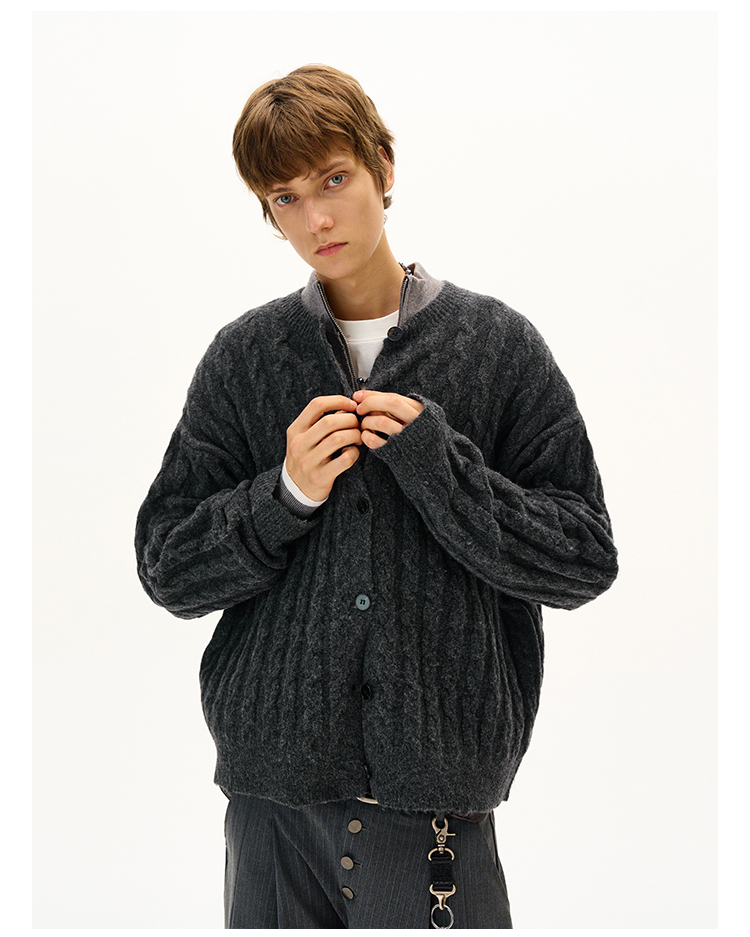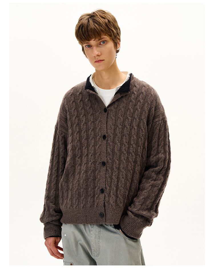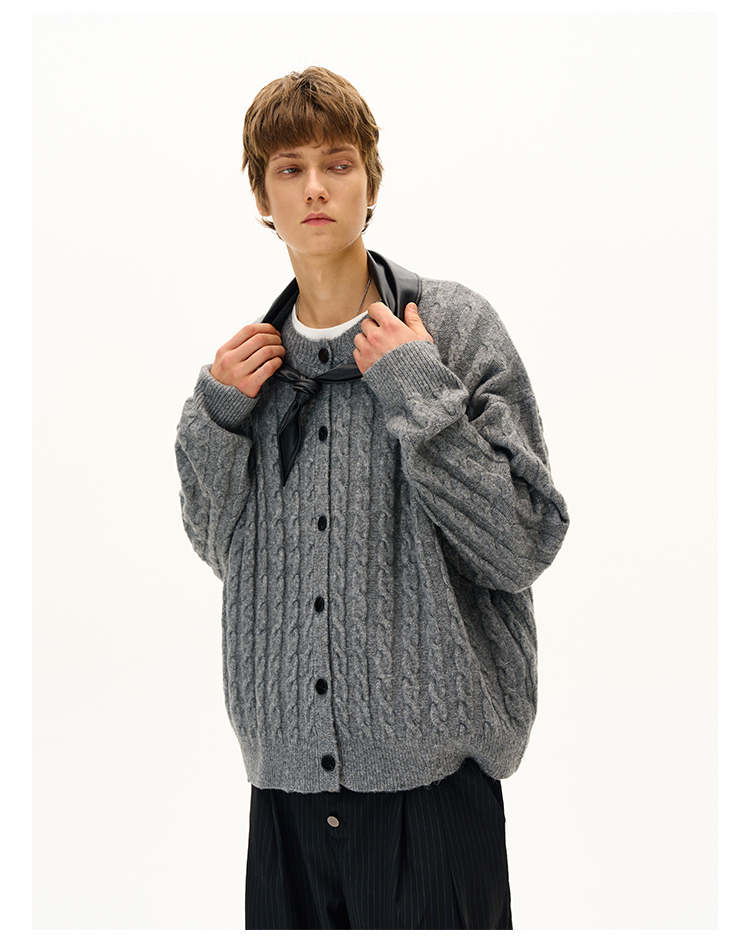 MADWITCH美式復古麻花紋羊毛混紡針織開衫男女寬松休閒萊賽爾外套