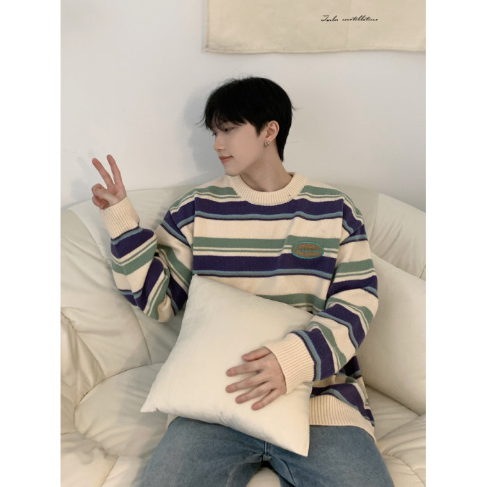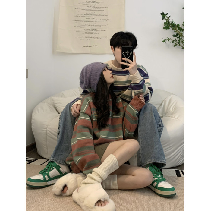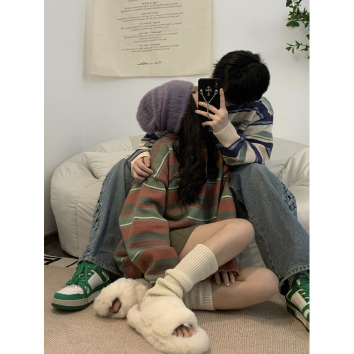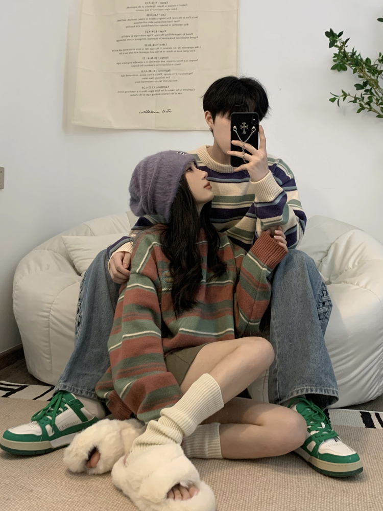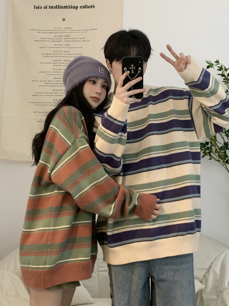 美式復古INS潮牌條紋毛衣男 秋冬oversize慵懶風圓領情侶裝針織衫