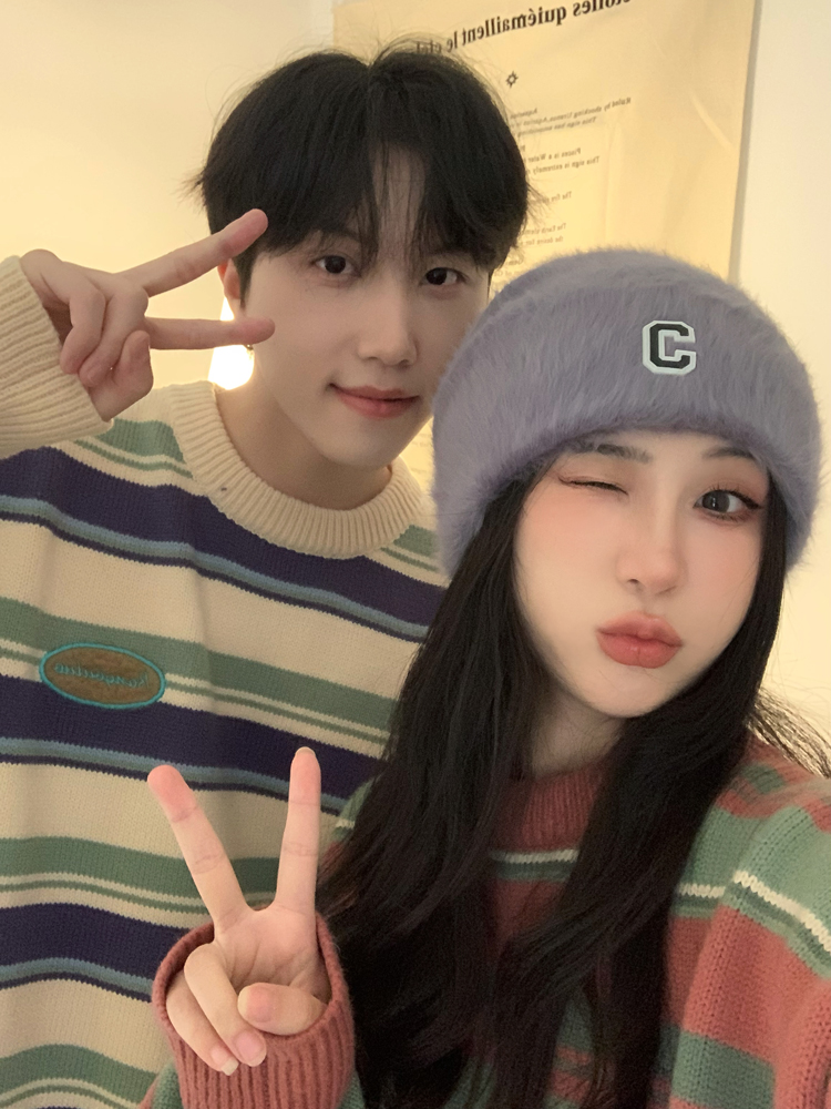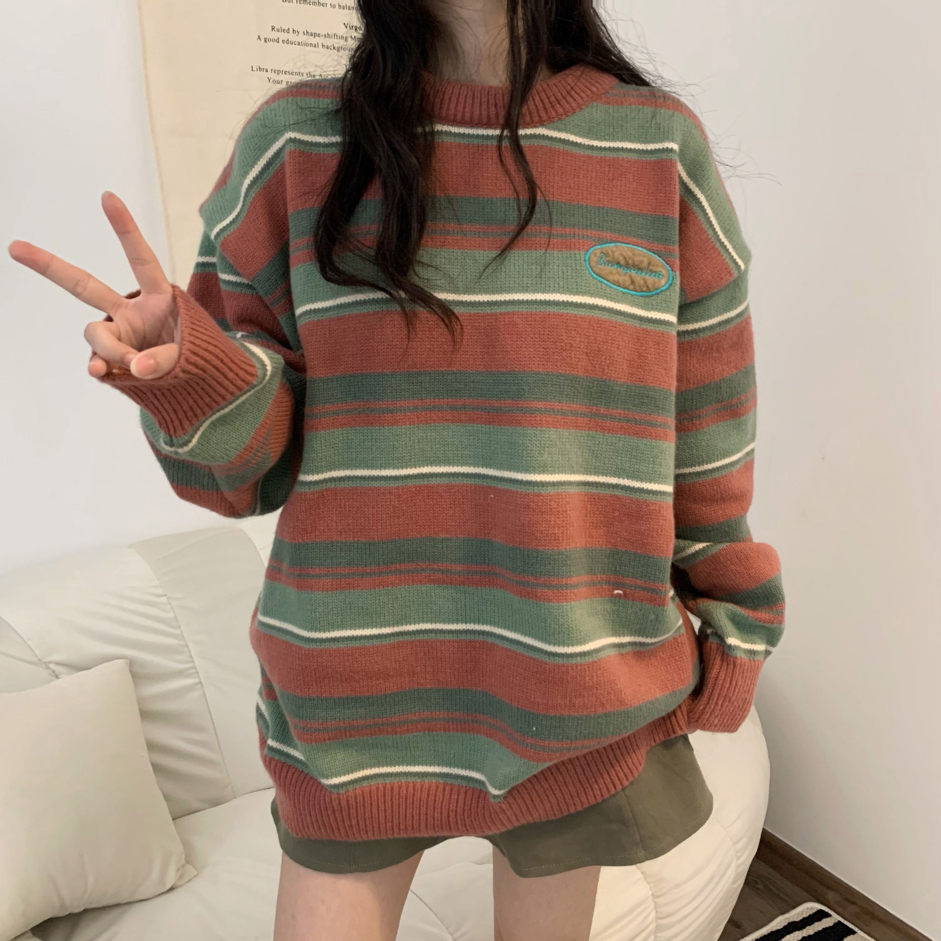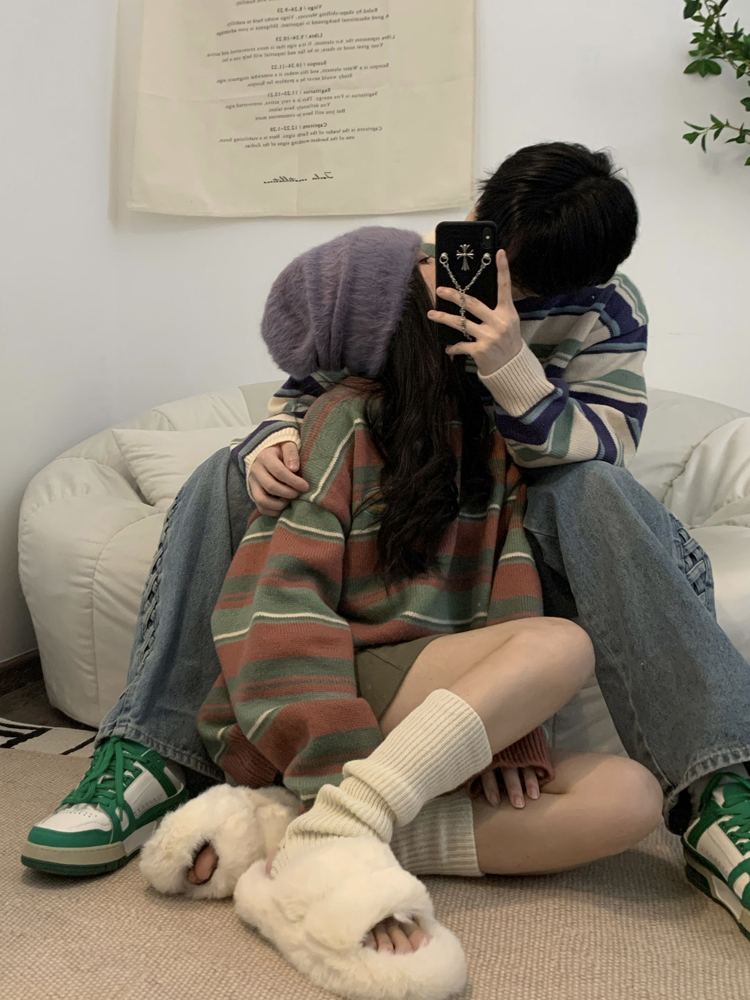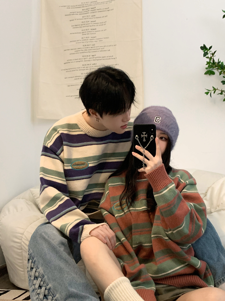 美式復古INS潮牌條紋毛衣男 秋冬oversize慵懶風圓領情侶裝針織衫