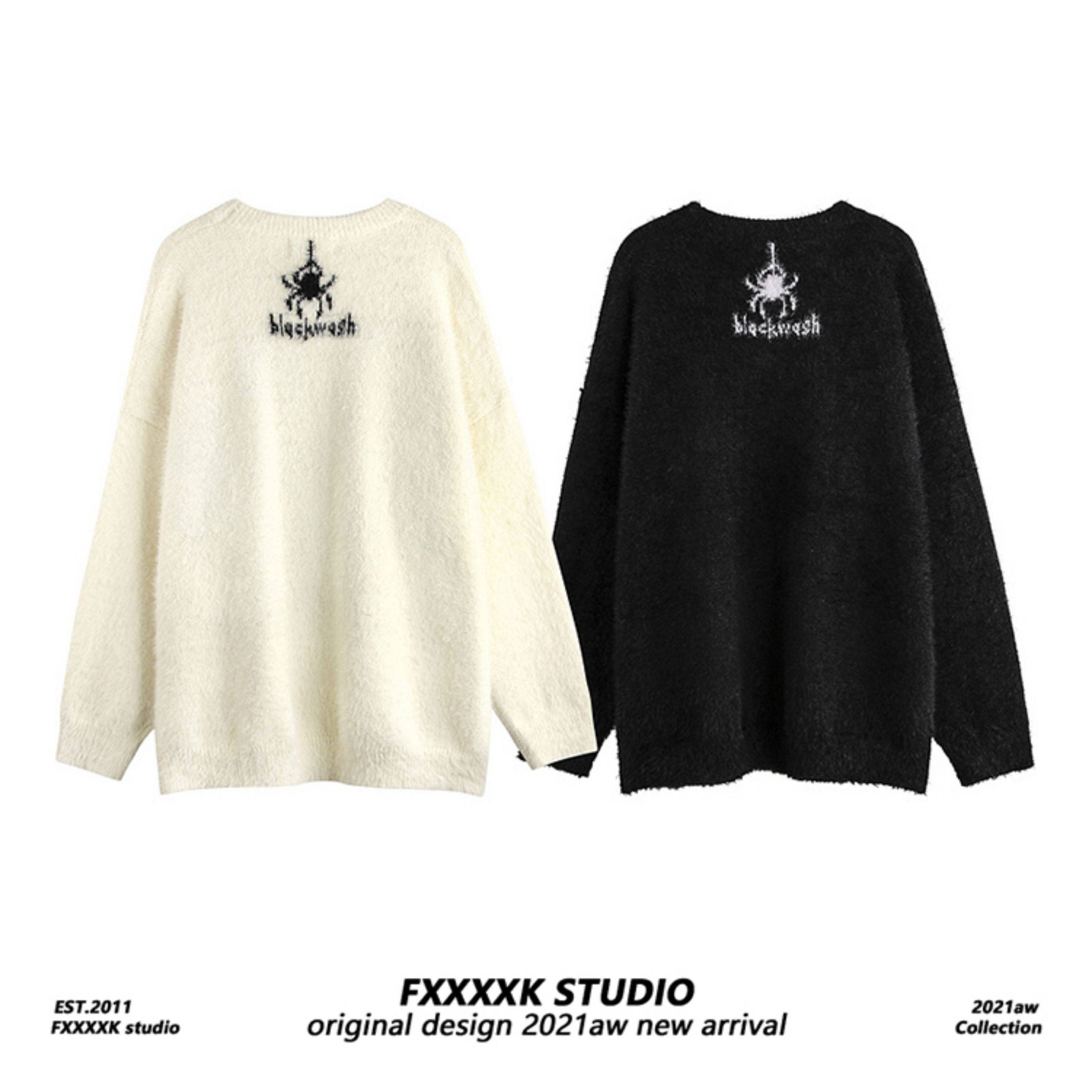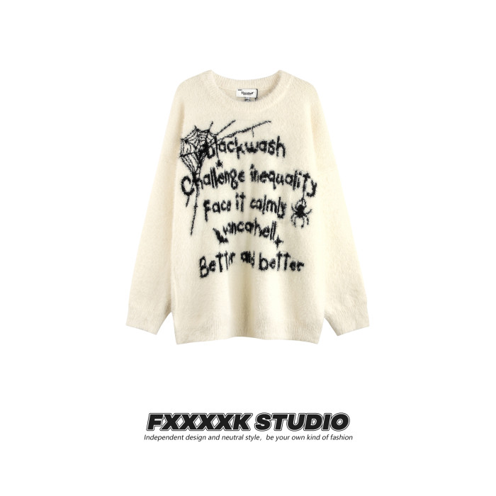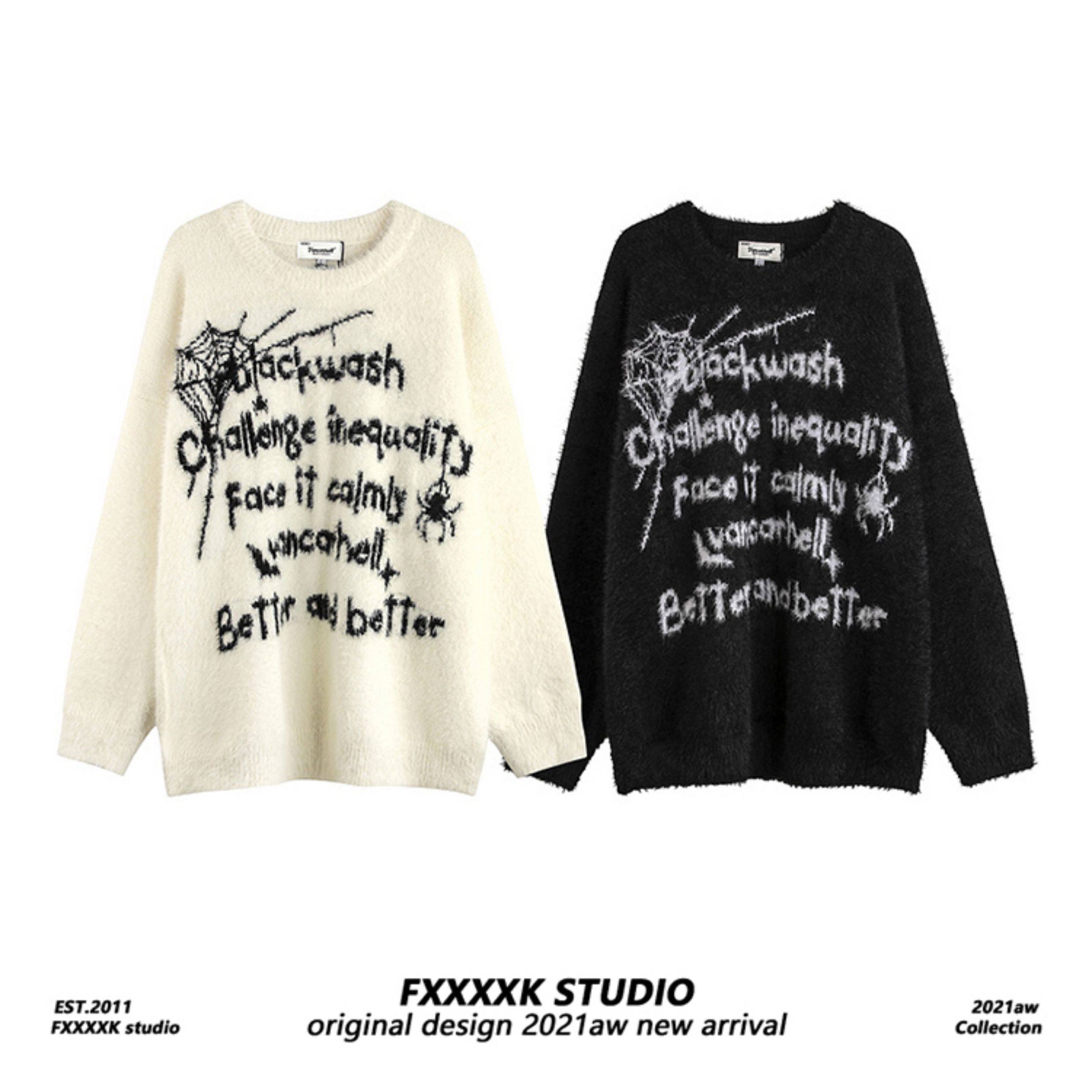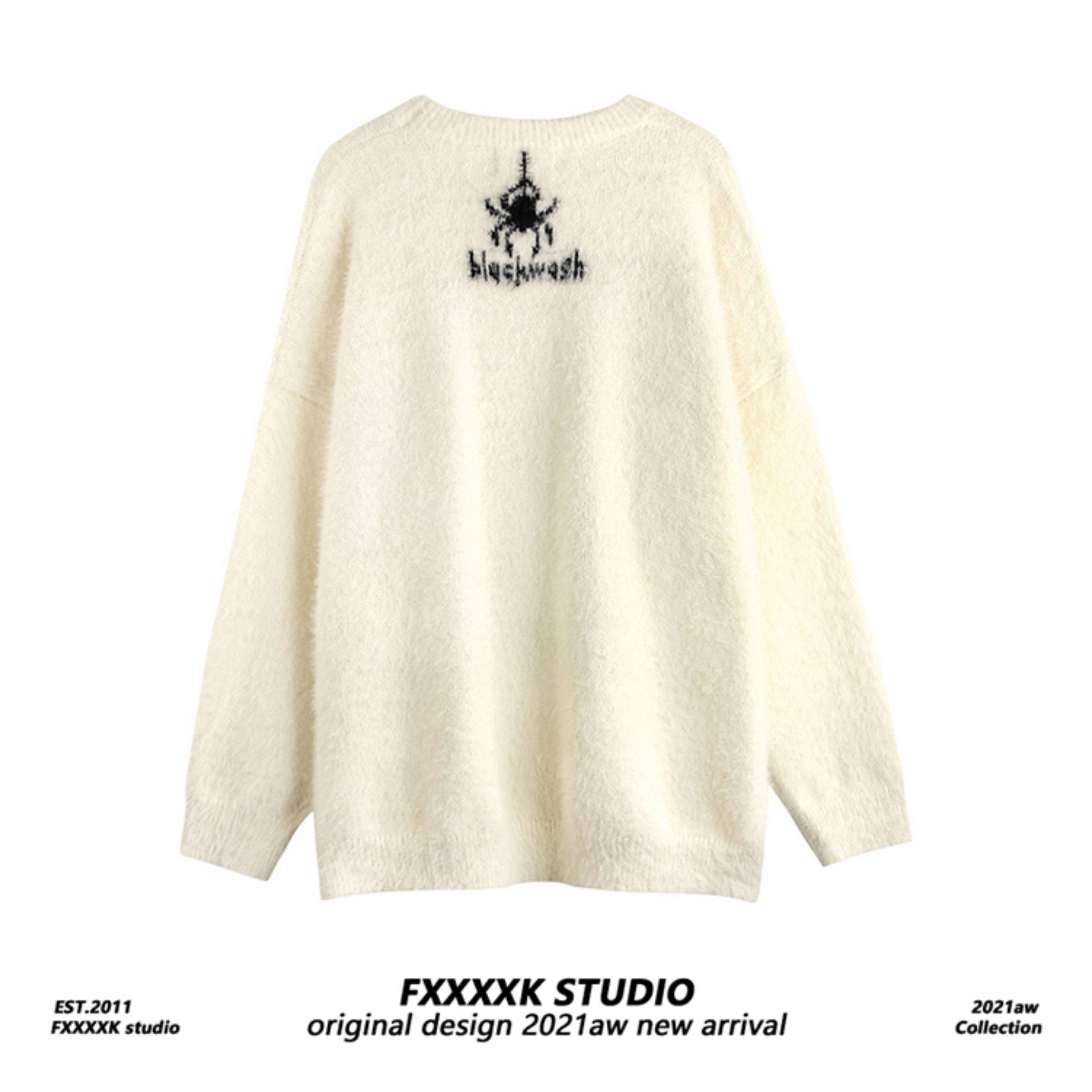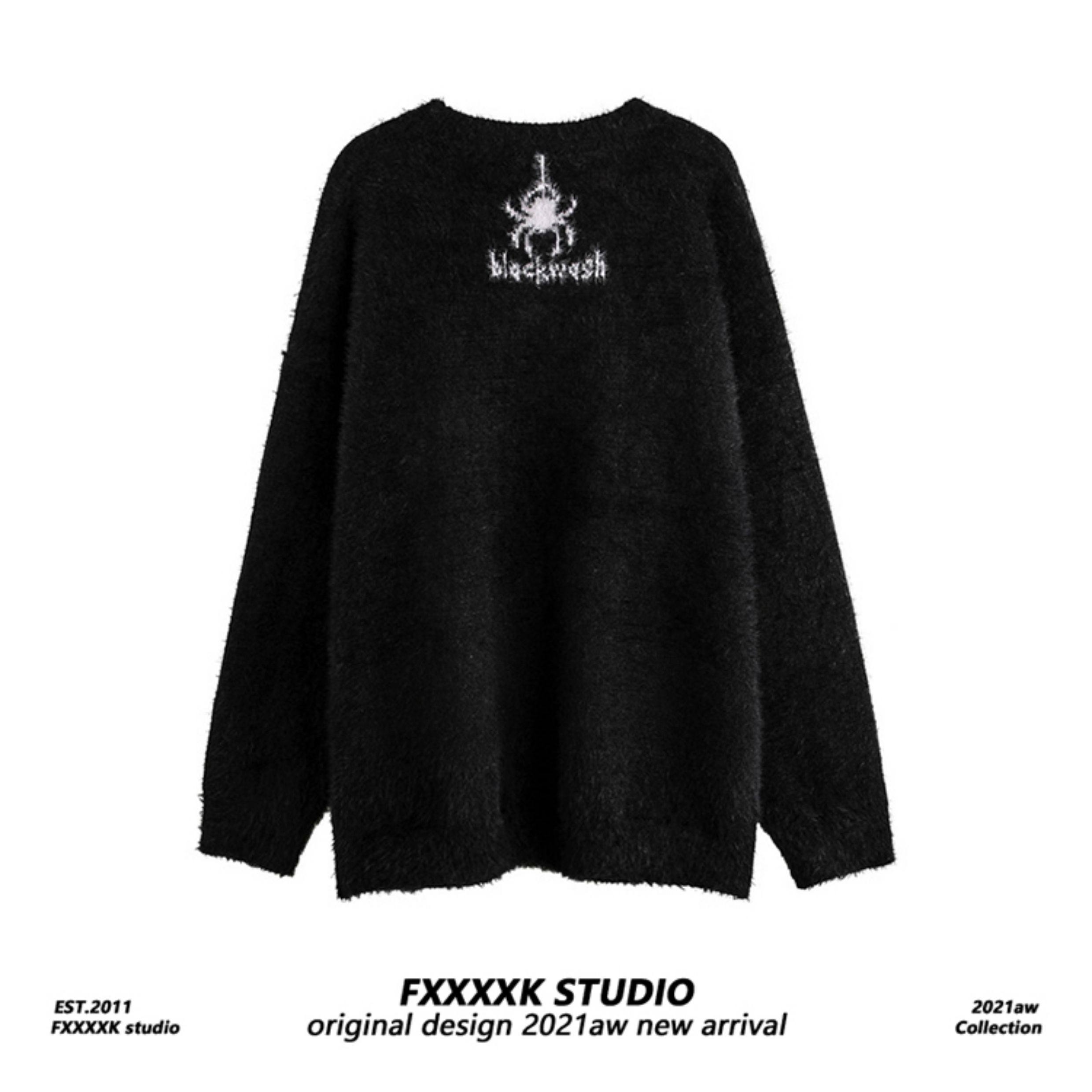 FXK原創 美式高街亞比風蜘蛛刺綉提花針織衫寬鬆情侶水貂毛毛衣