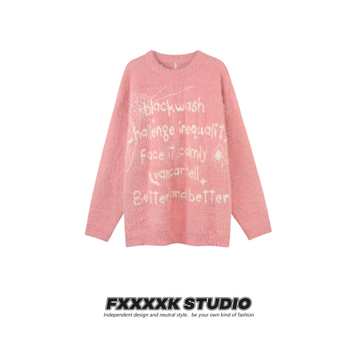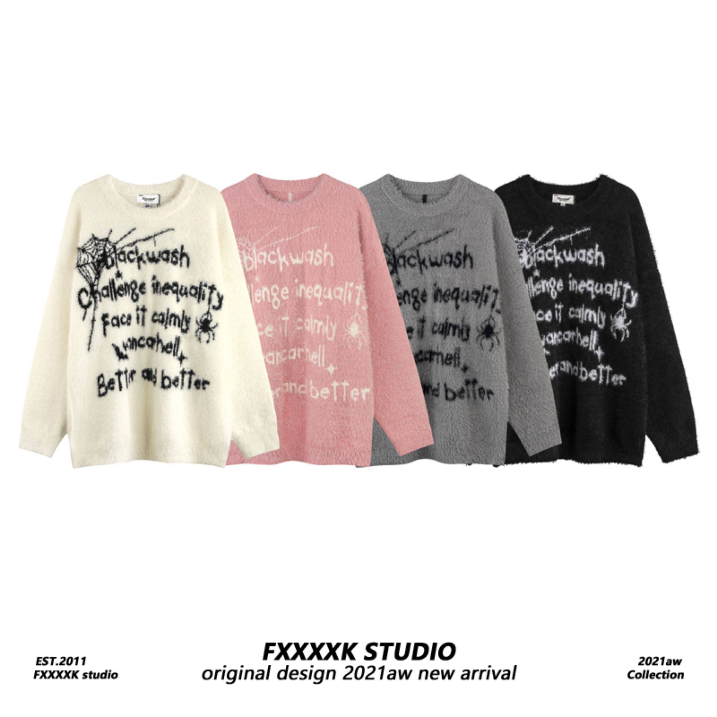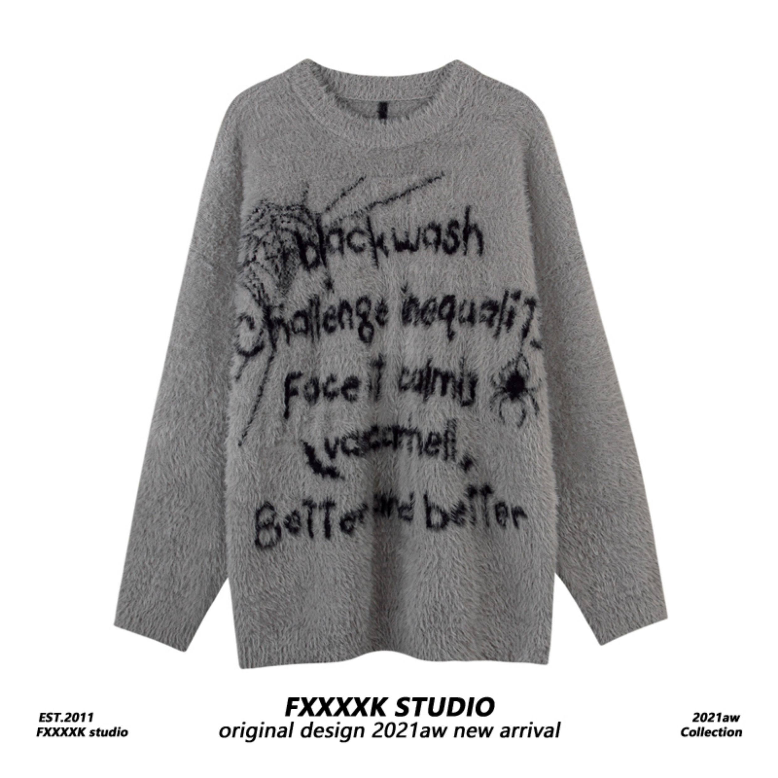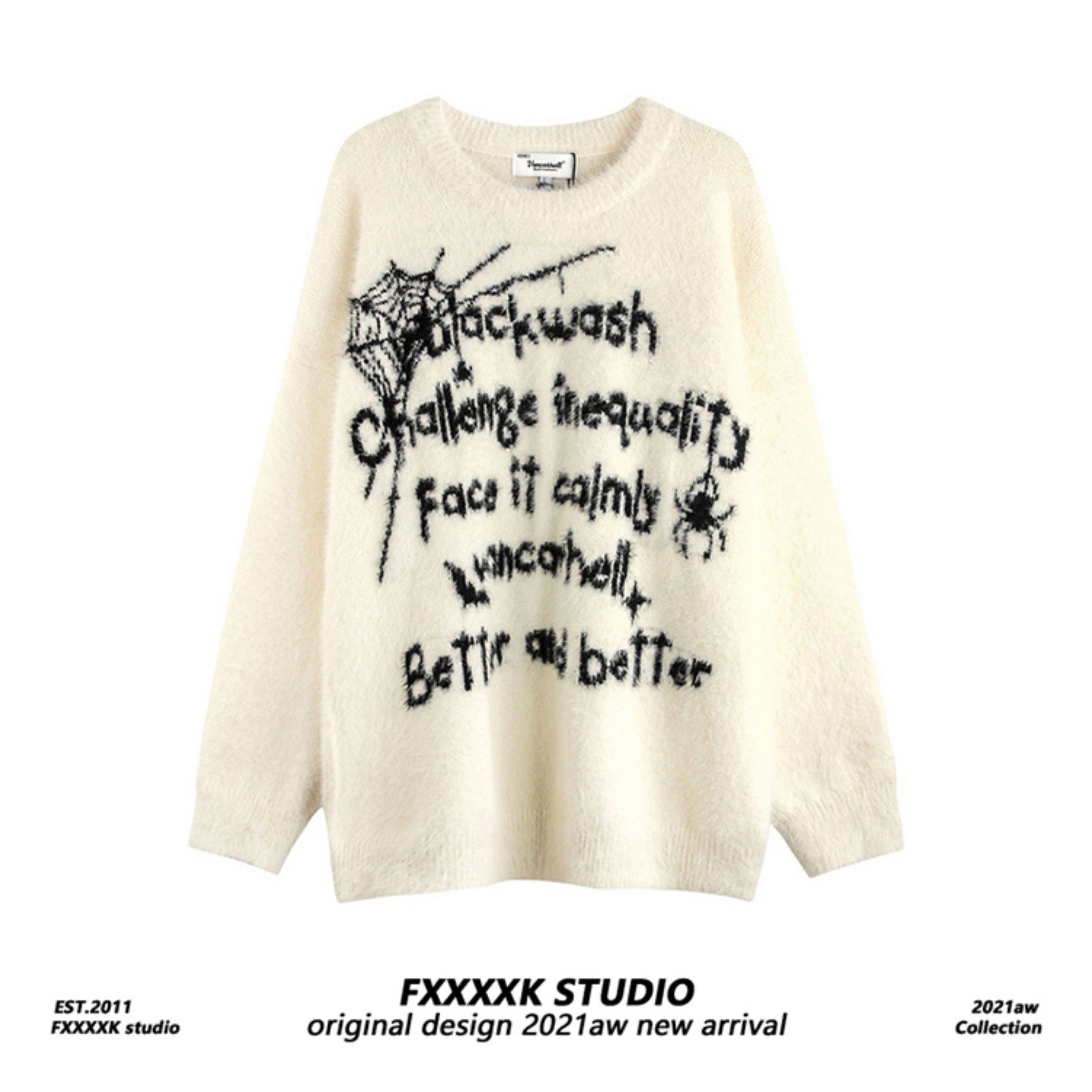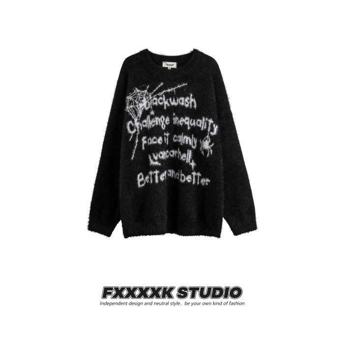 FXK原創 美式高街亞比風蜘蛛刺綉提花針織衫寬鬆情侶水貂毛毛衣