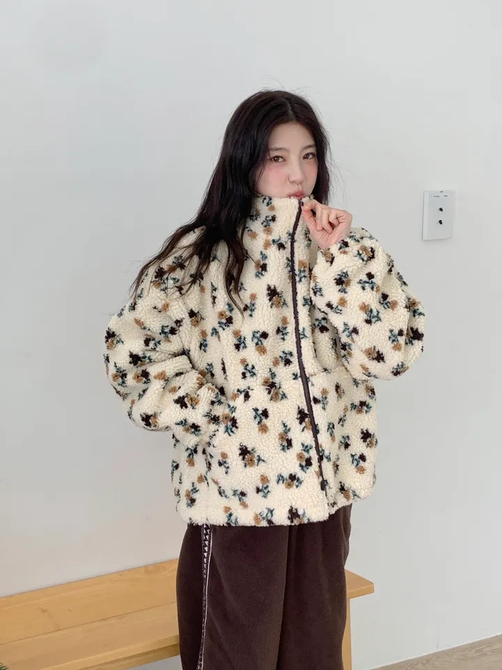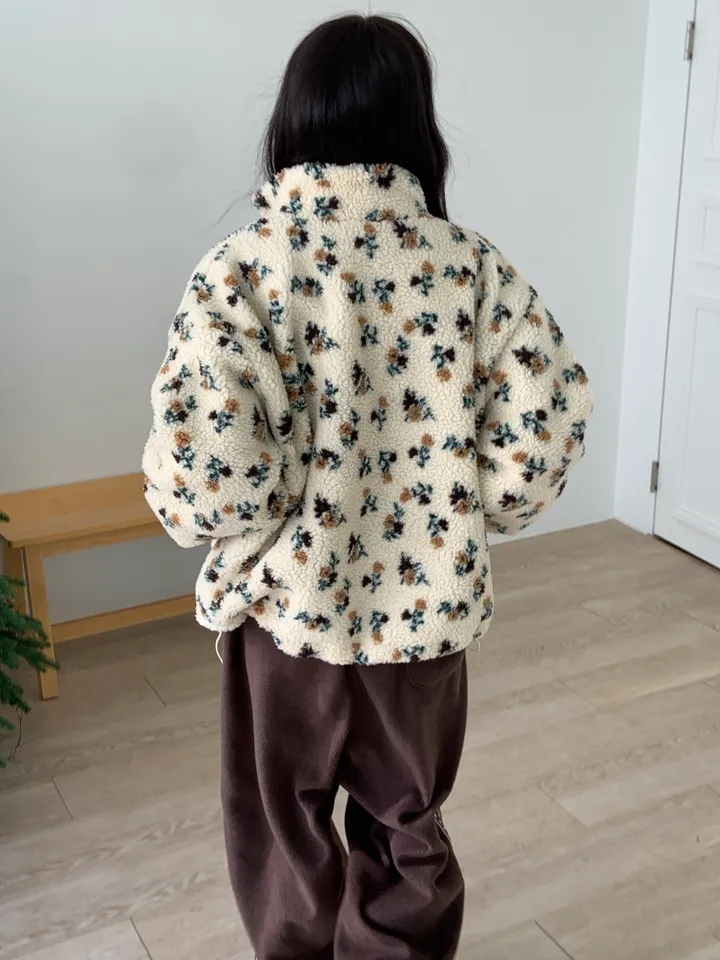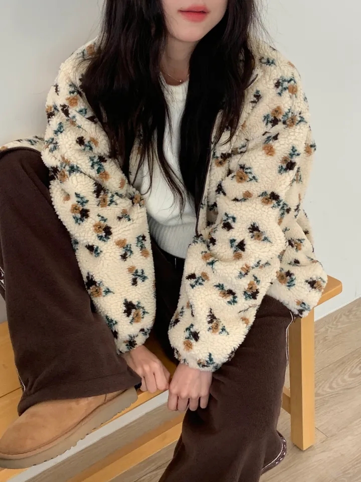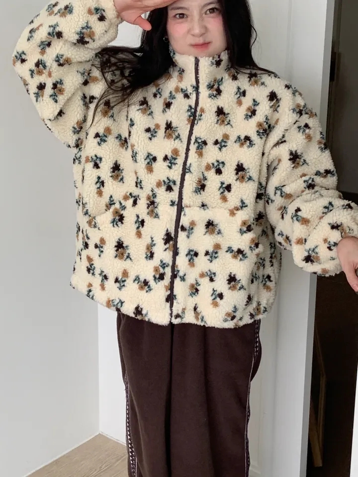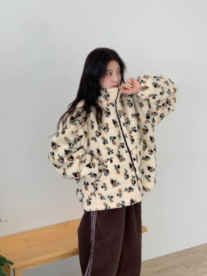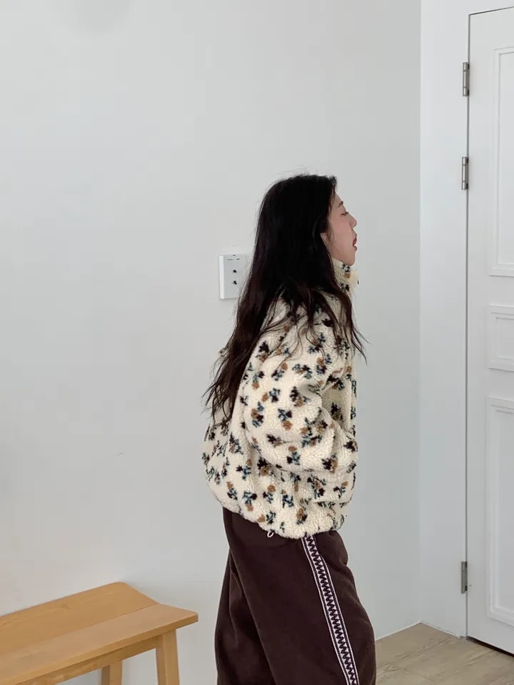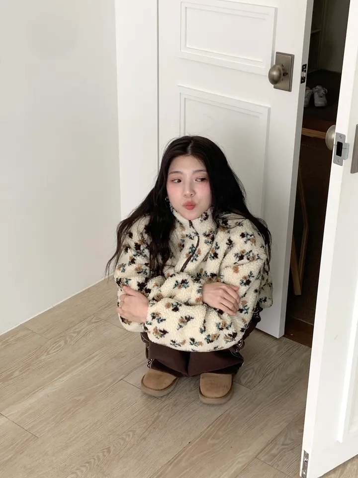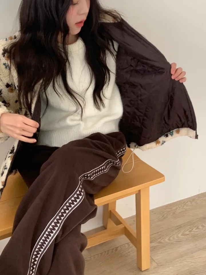 復古慵懶風撞色提花羊羔毛衛衣外套女2025冬季新款半拉鍊寬松上衣