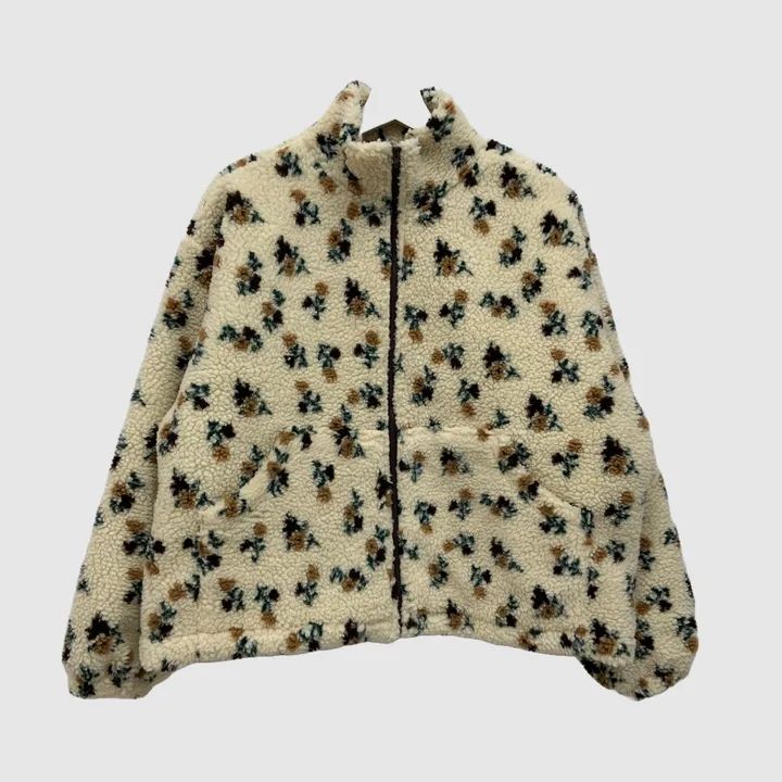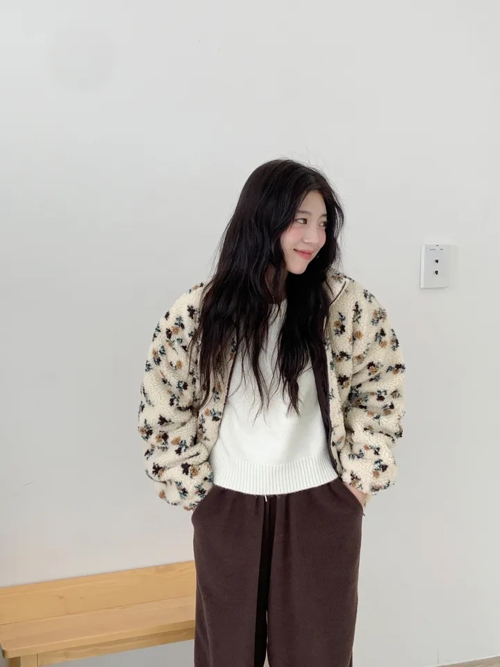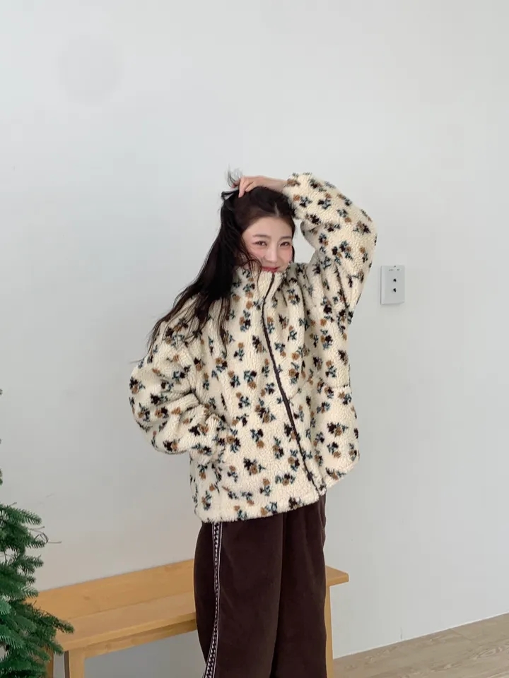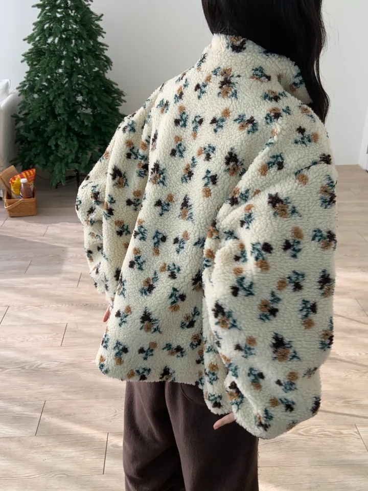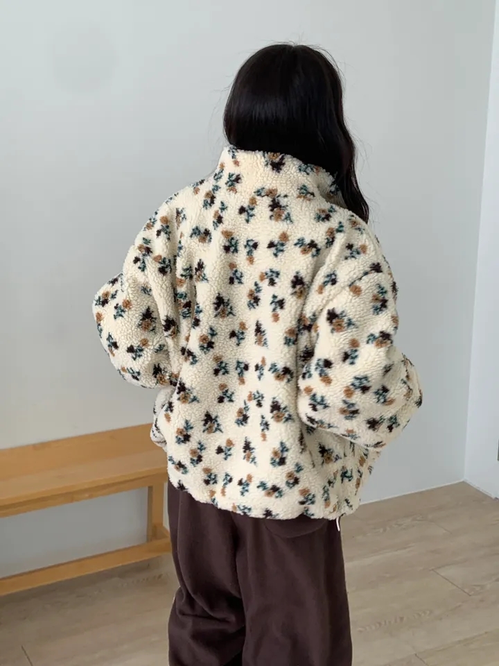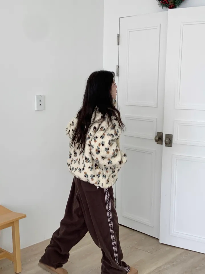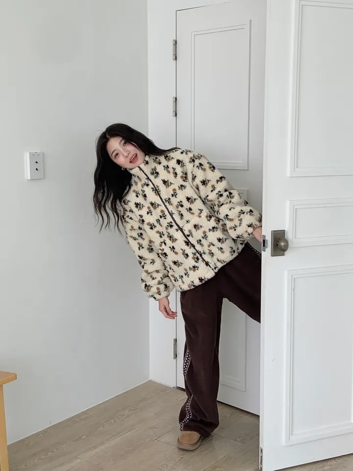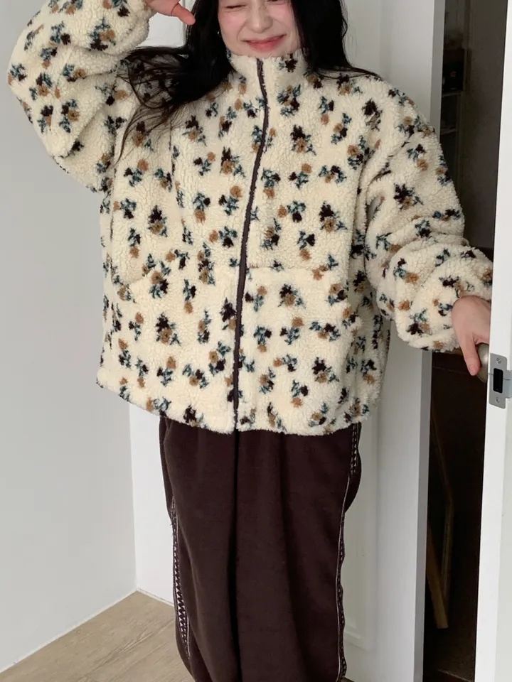 復古慵懶風撞色提花羊羔毛衛衣外套女2025冬季新款半拉鍊寬松上衣