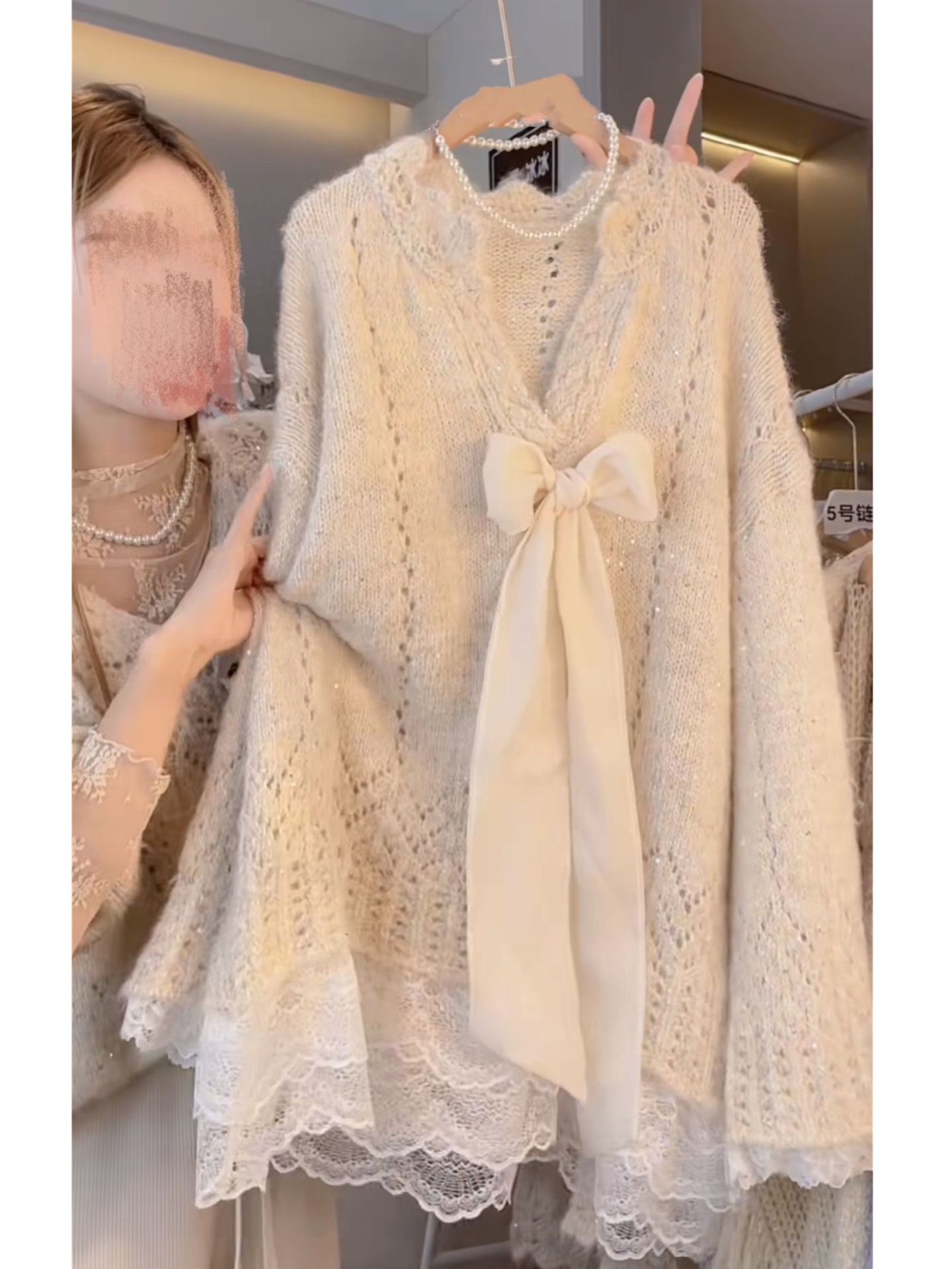女秋冬季甜美外穿毛衣法式高級設計感蕾絲拼接公主風小衫軟糯上衣
