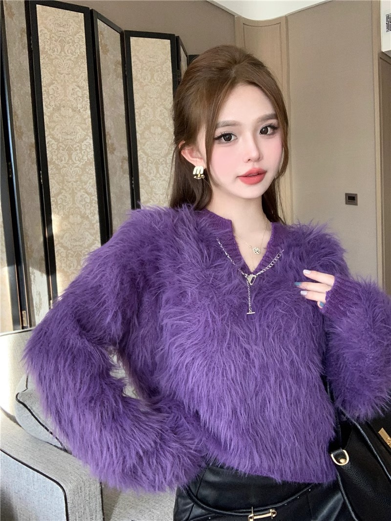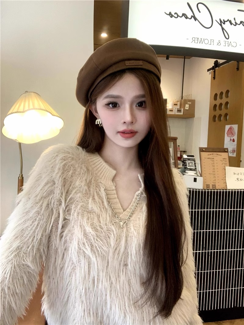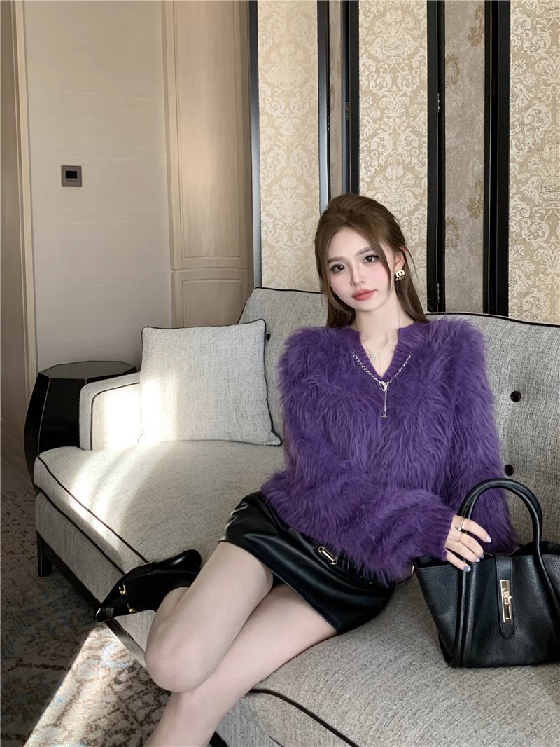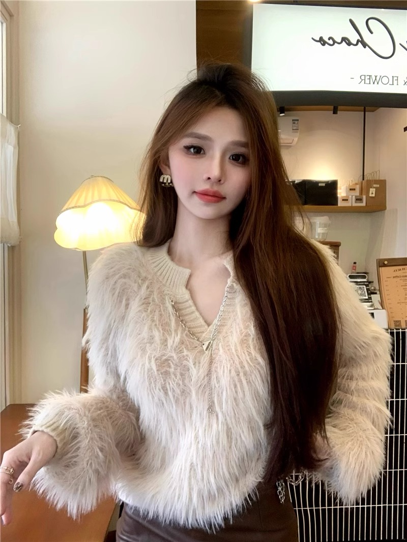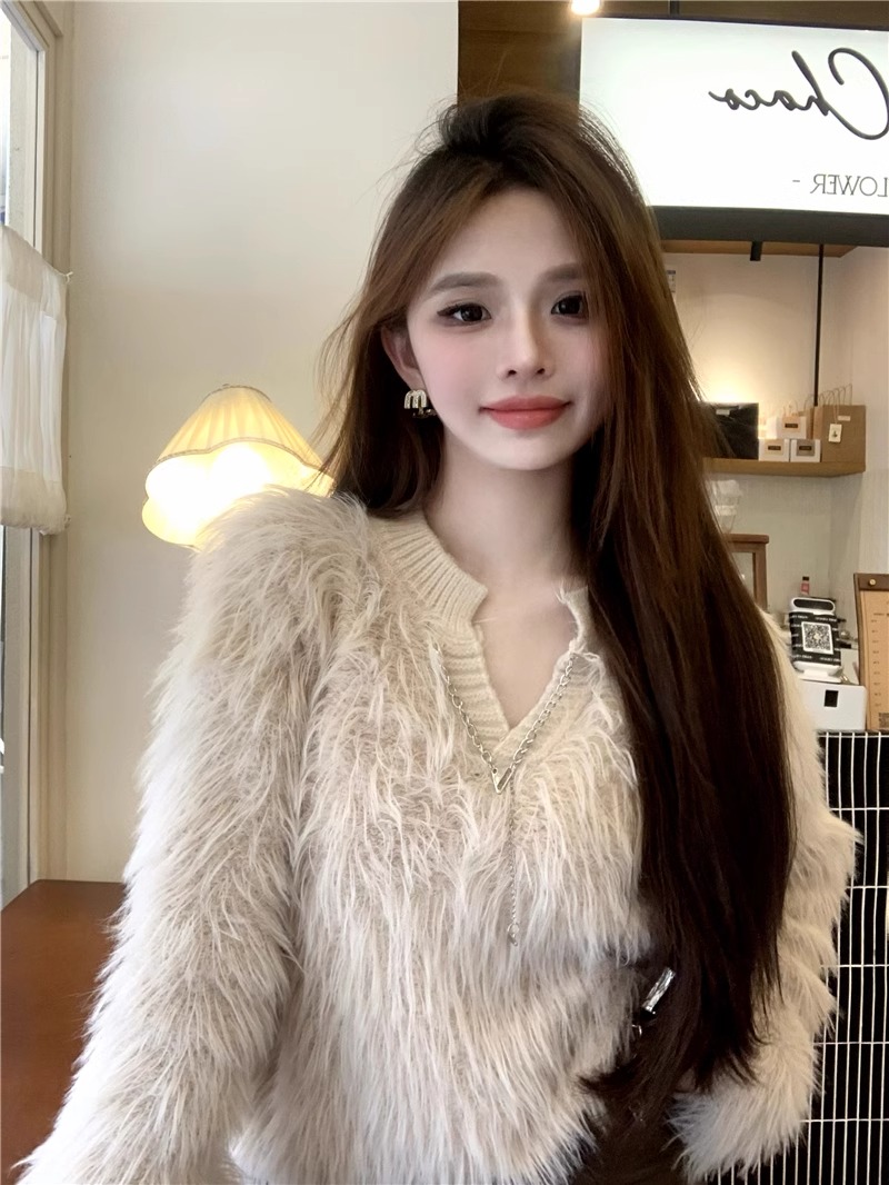 設計感仿水貂毛毛衣寬松慵懶風長袖v領女秋冬短款套頭針織衫上衣
