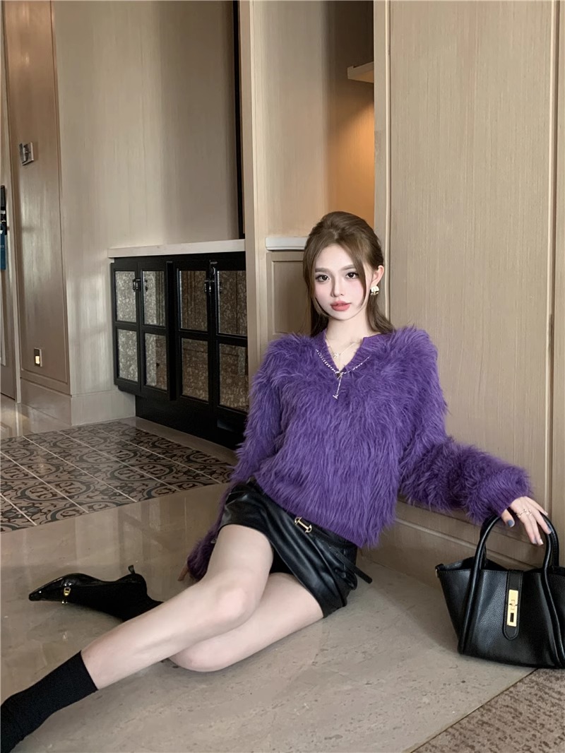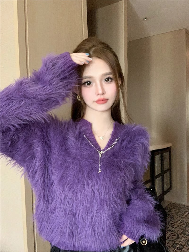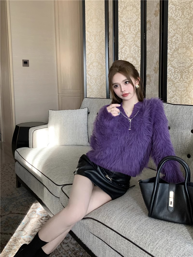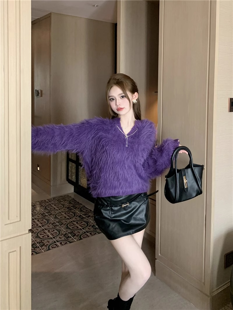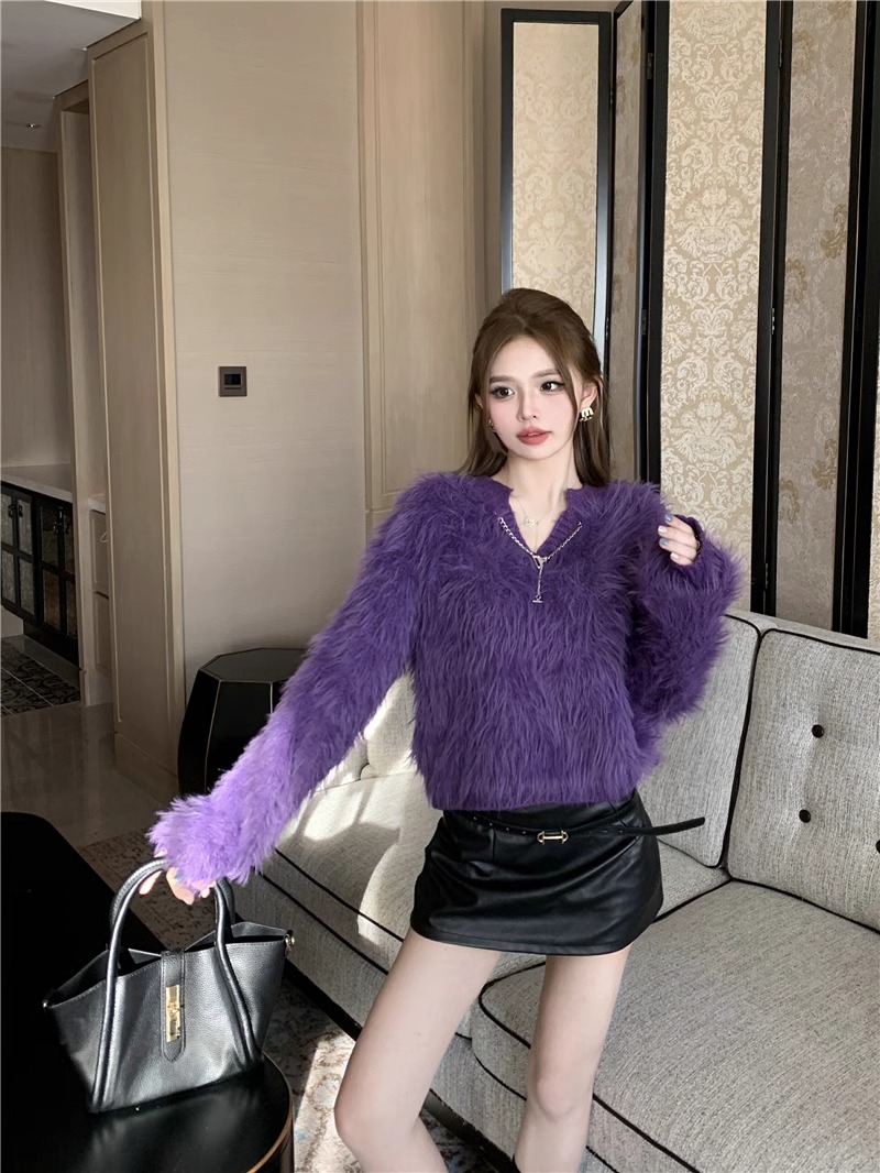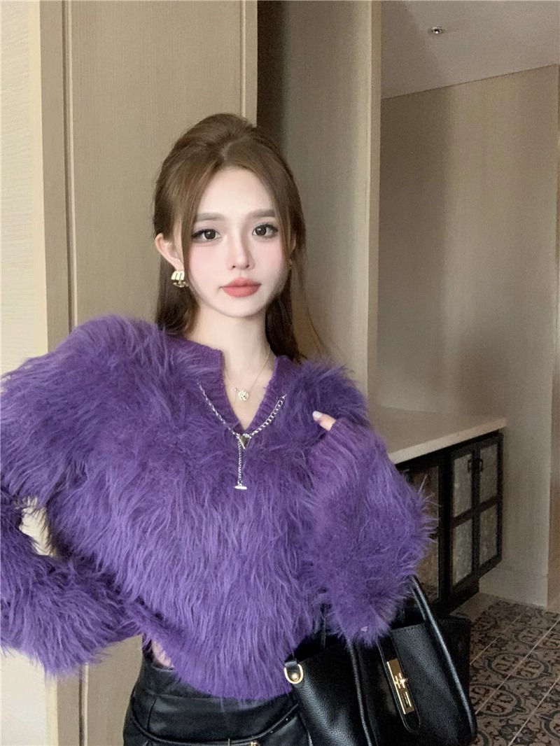 設計感仿水貂毛毛衣寬松慵懶風長袖v領女秋冬短款套頭針織衫上衣