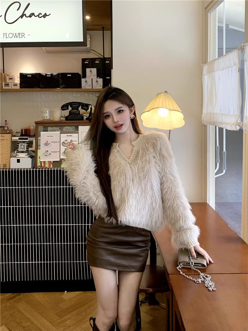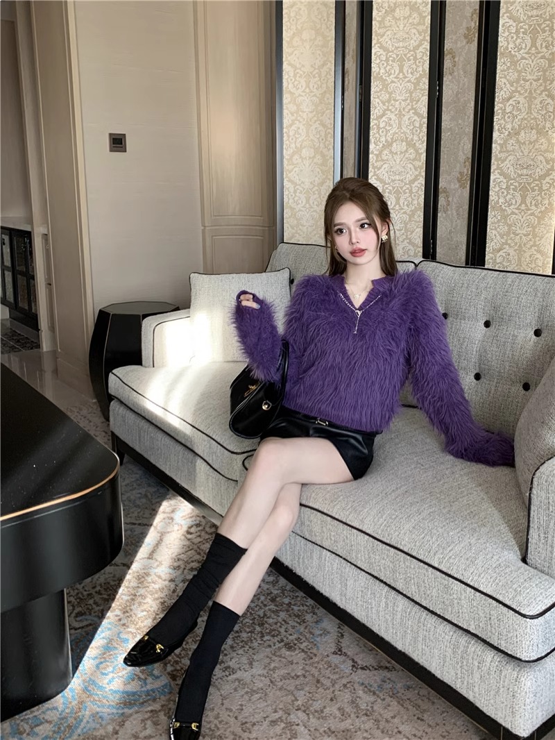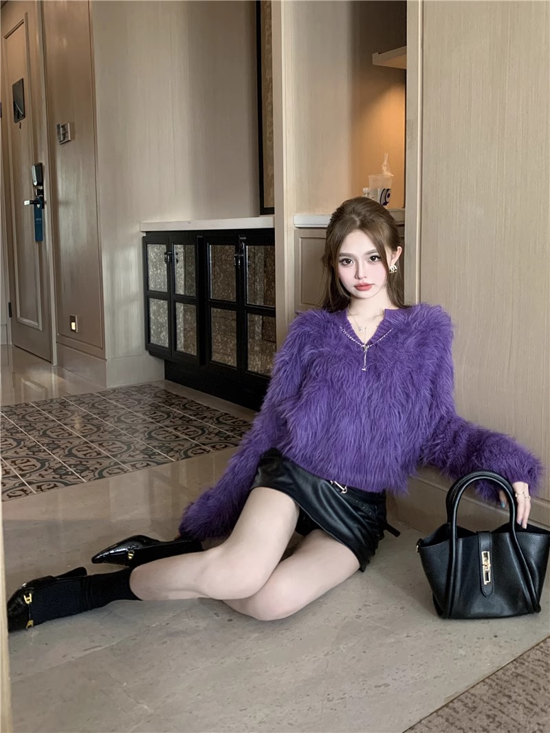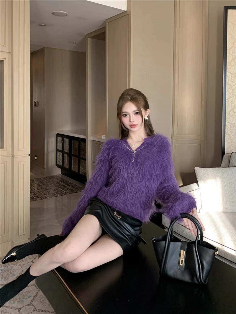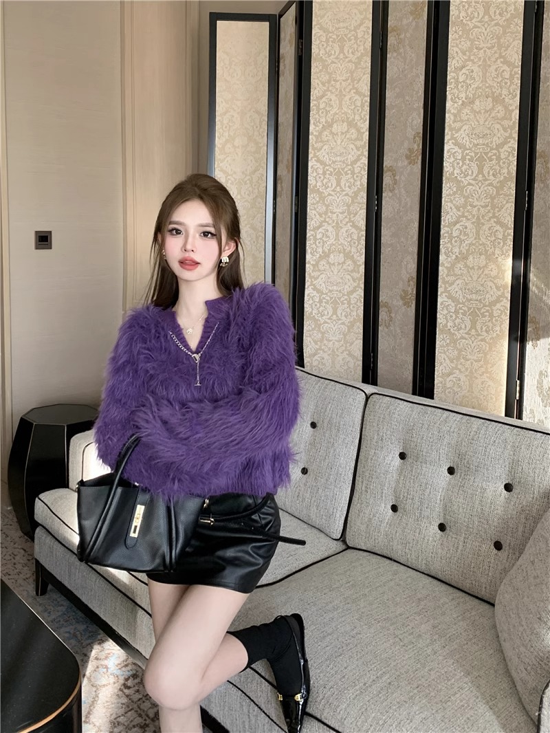 設計感仿水貂毛毛衣寬松慵懶風長袖v領女秋冬短款套頭針織衫上衣