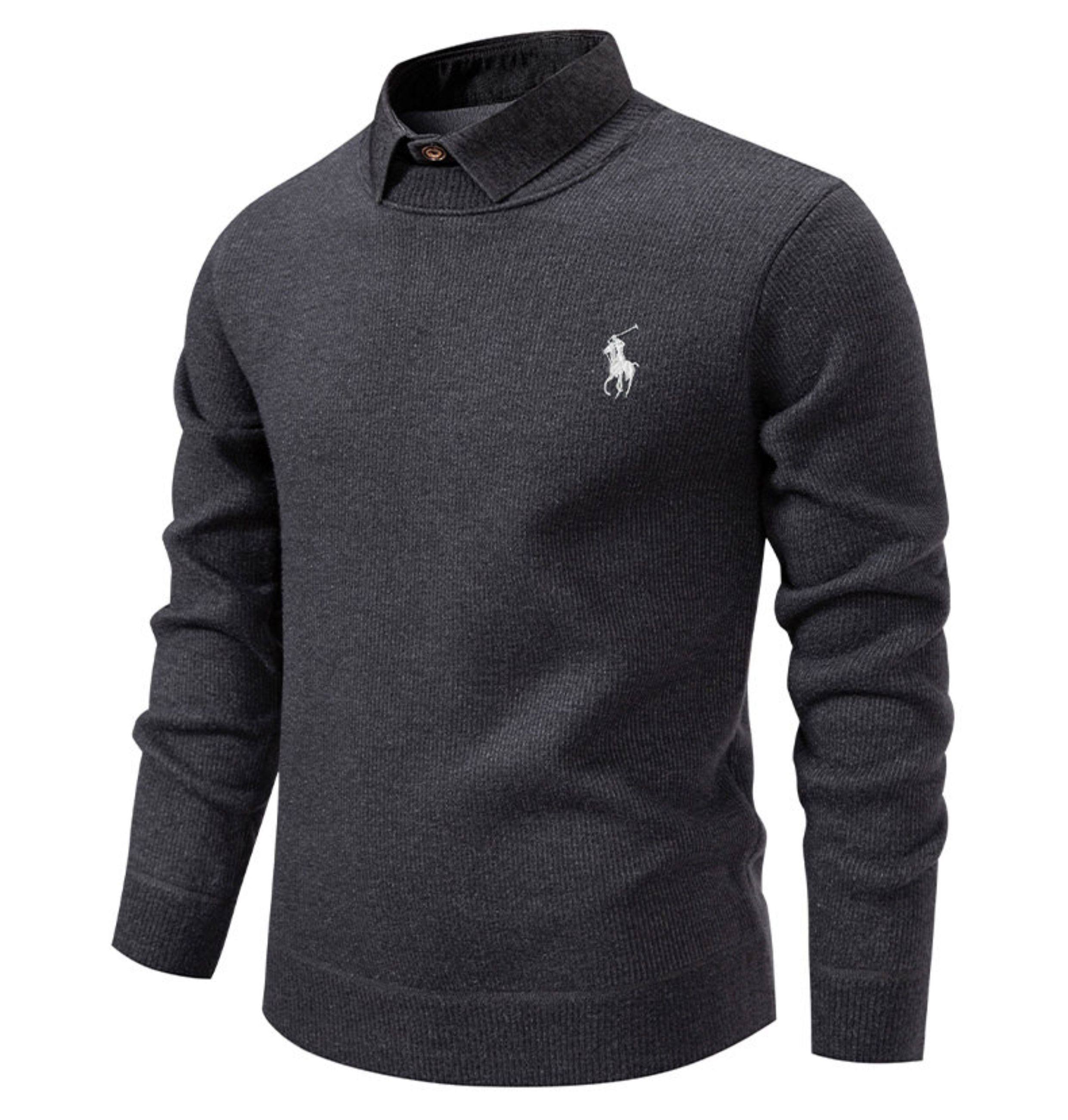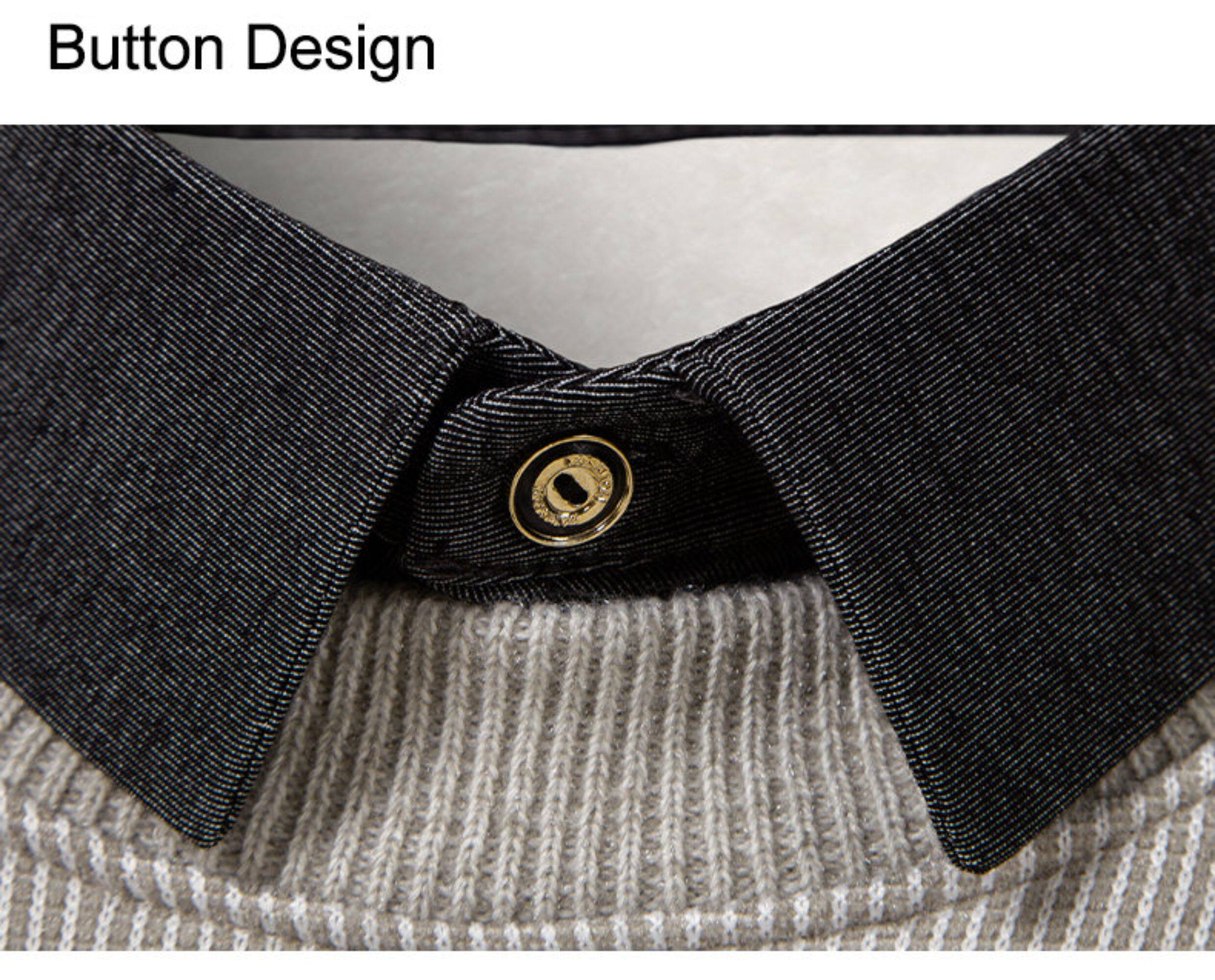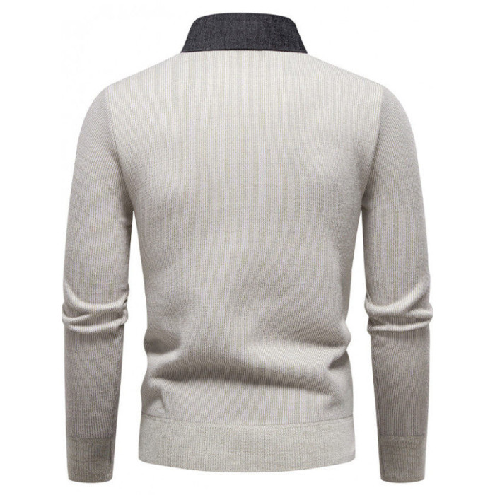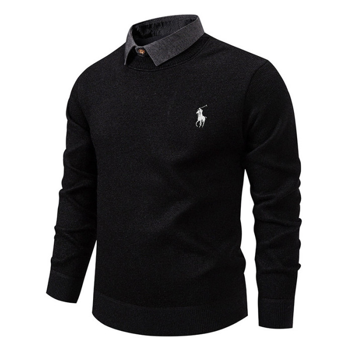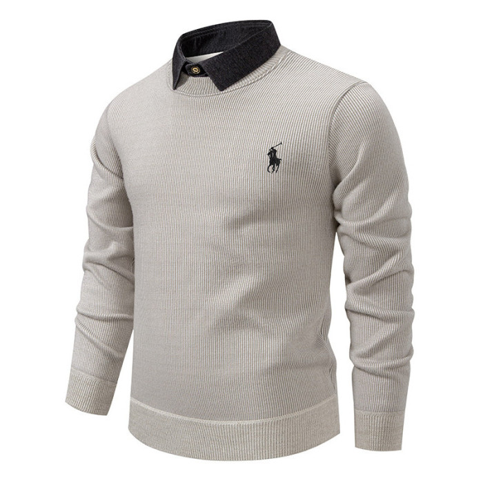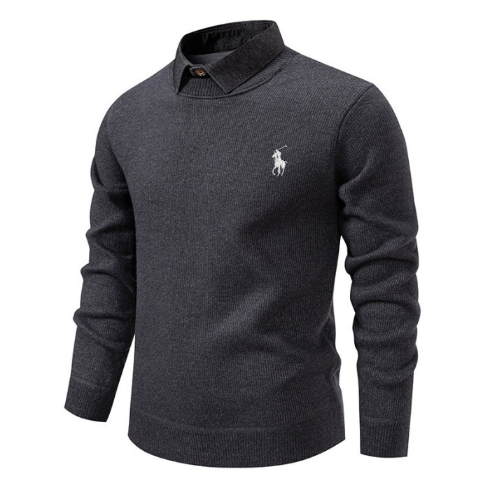 秋冬新款假兩件加絨針織衫男時尚休閒修身繙領套頭刺綉學生毛線衣