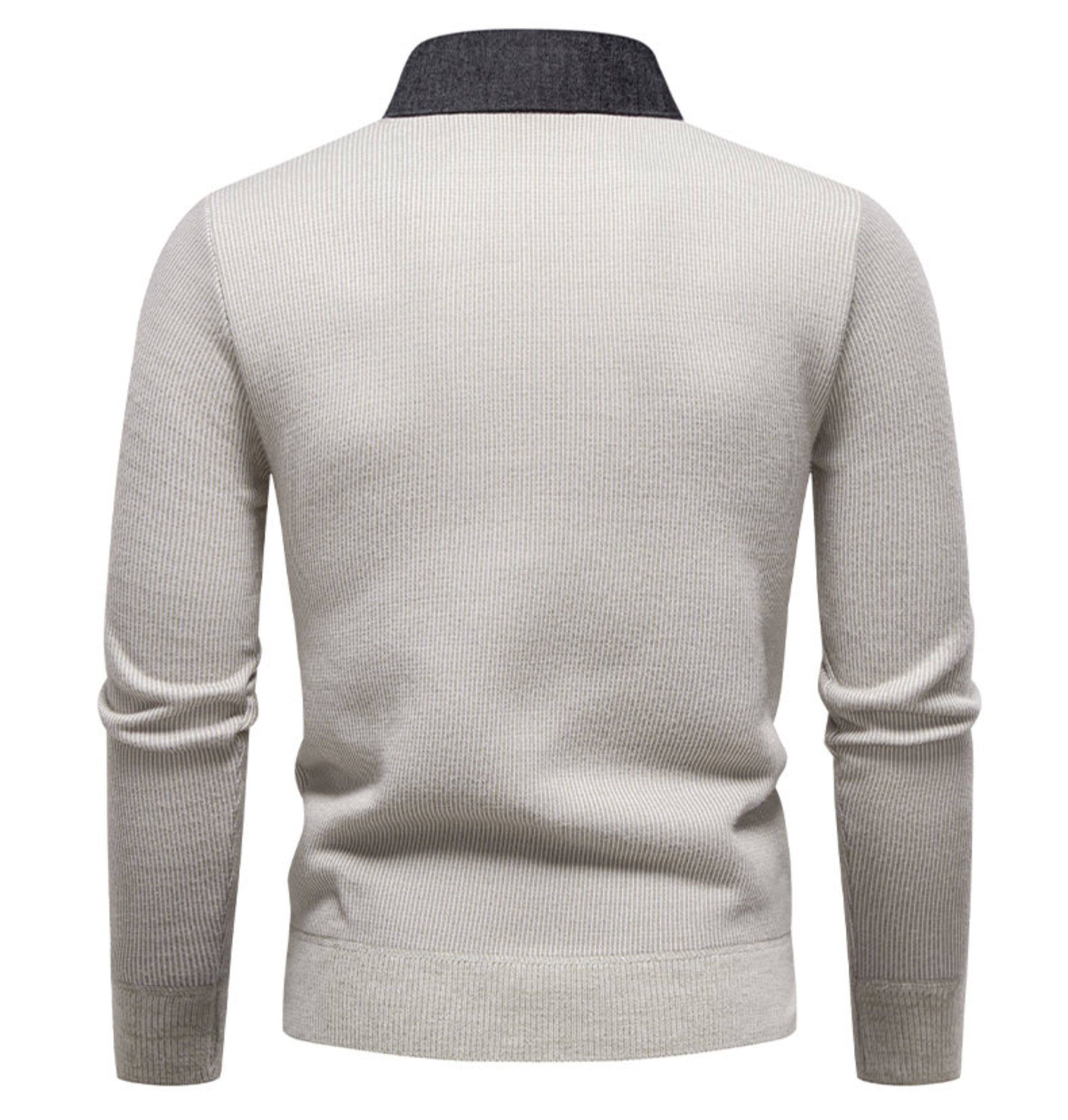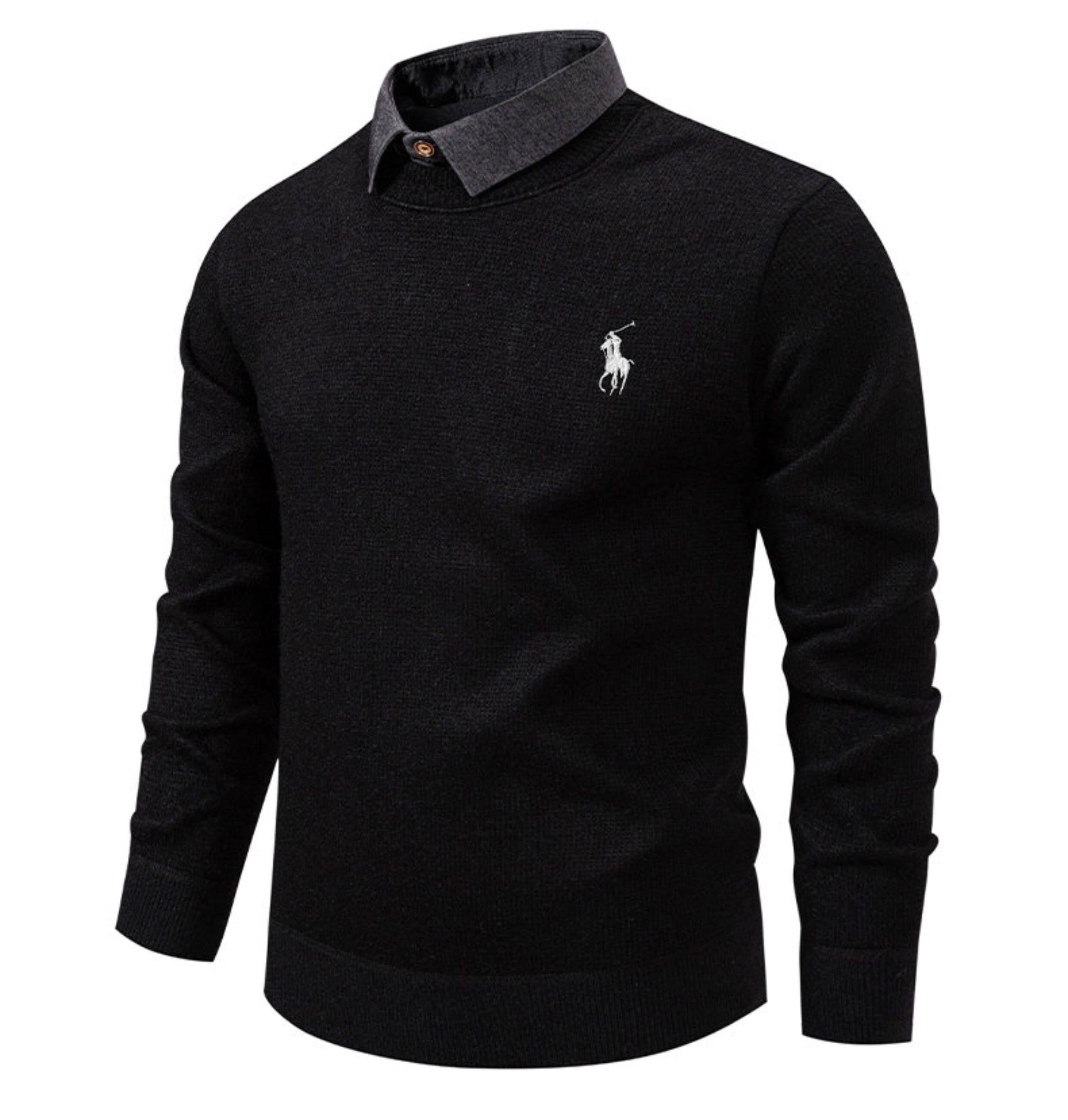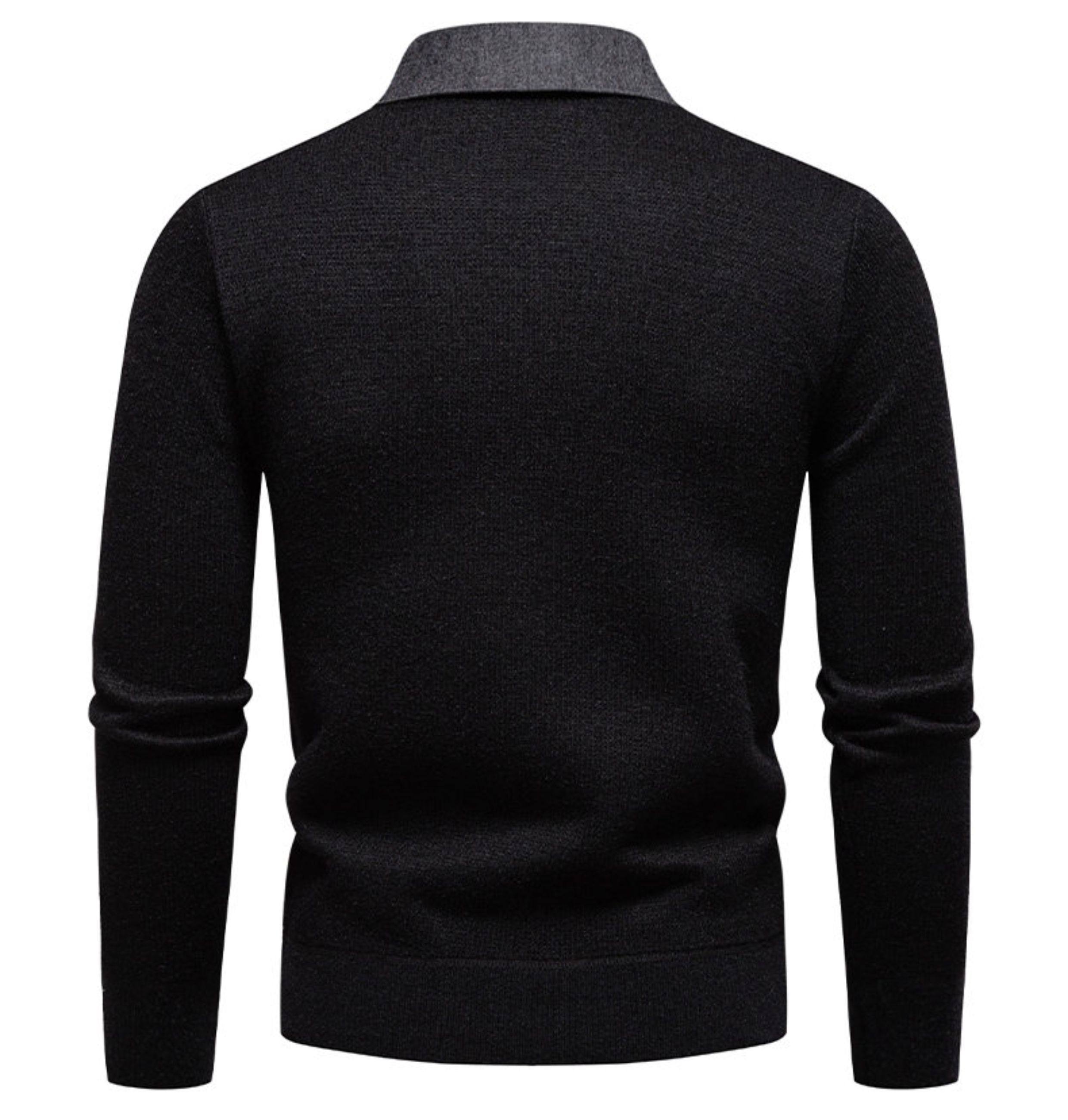 秋冬新款假兩件加絨針織衫男時尚休閒修身繙領套頭刺綉學生毛線衣