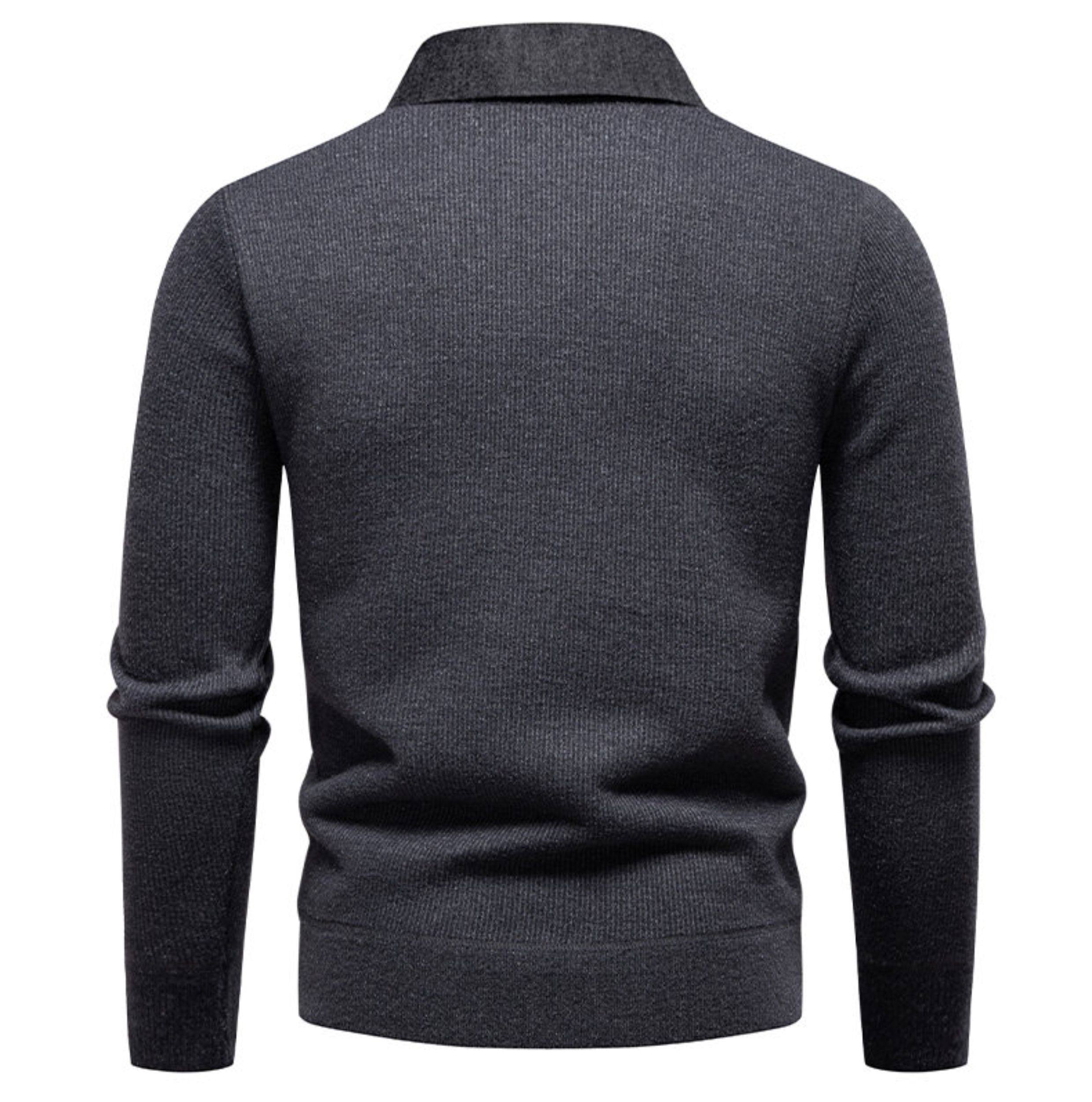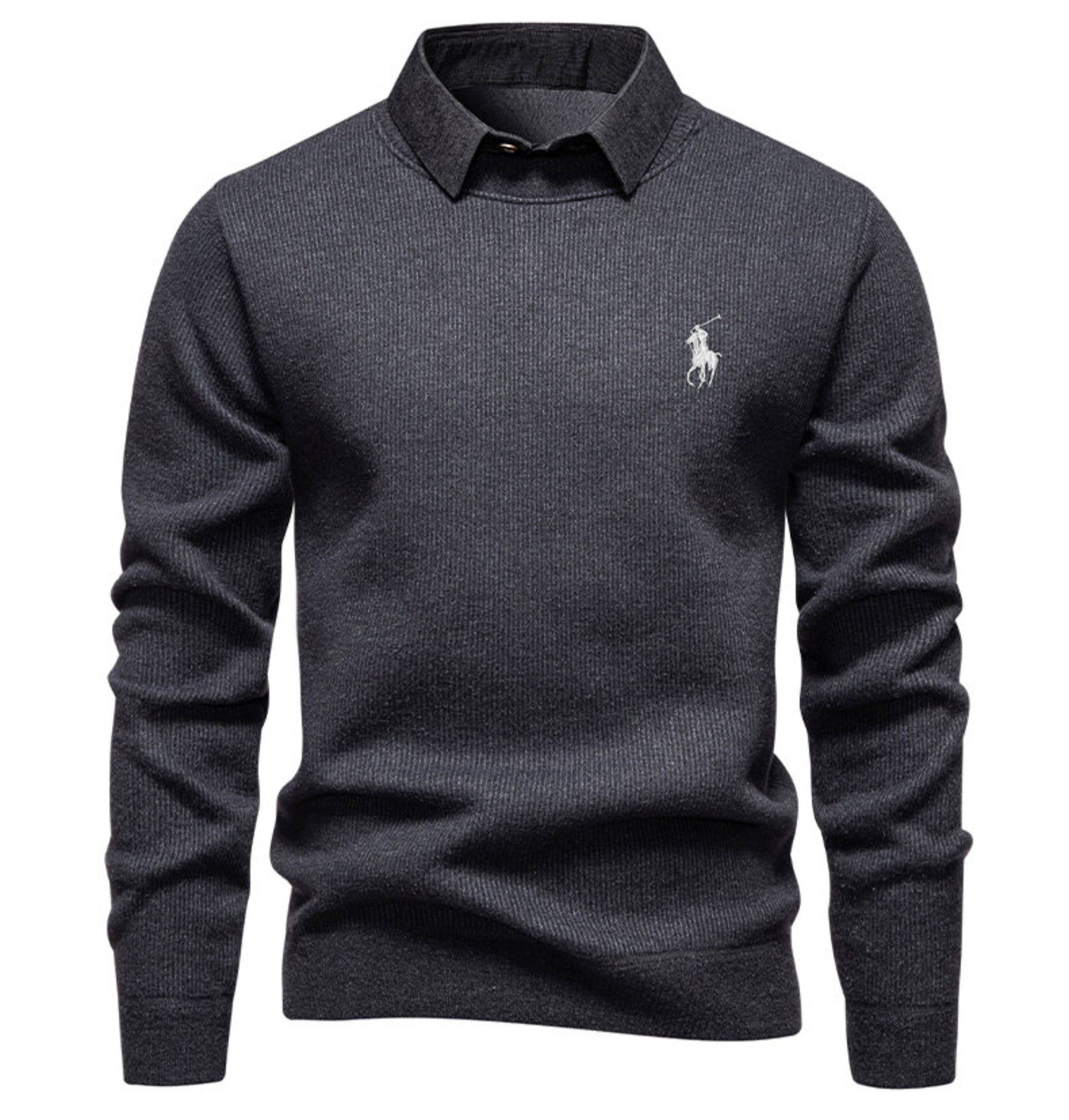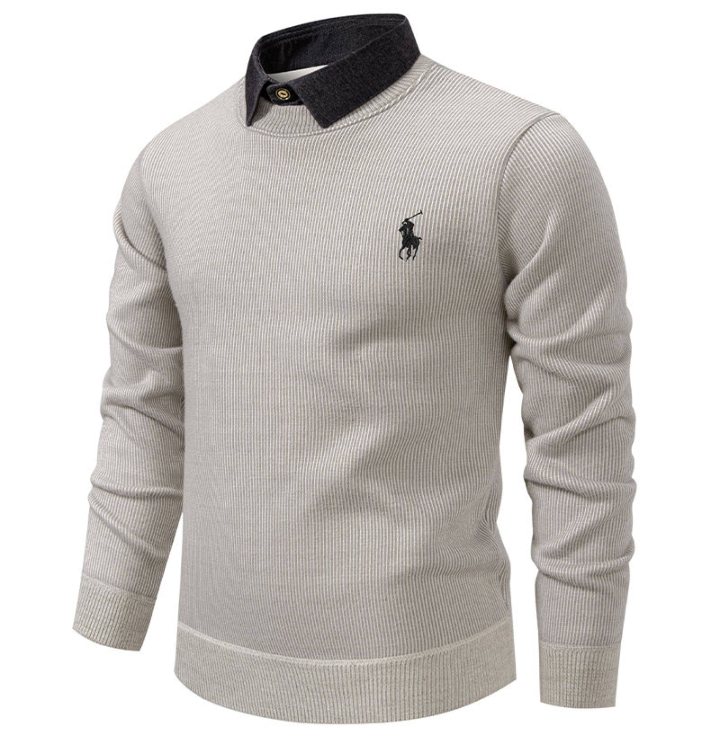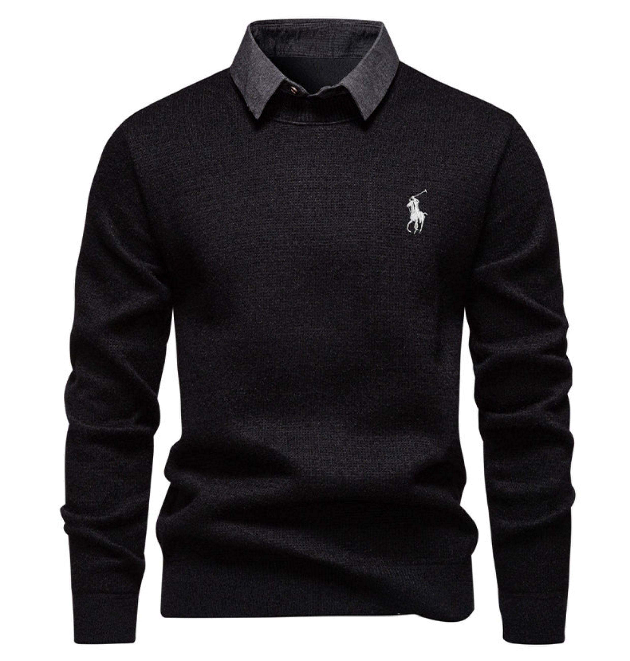 秋冬新款假兩件加絨針織衫男時尚休閒修身繙領套頭刺綉學生毛線衣
