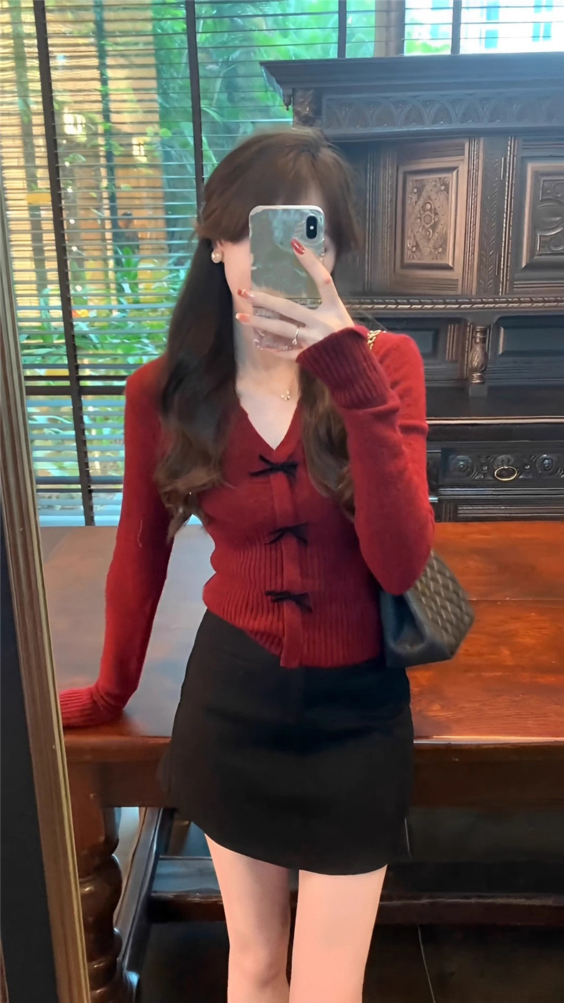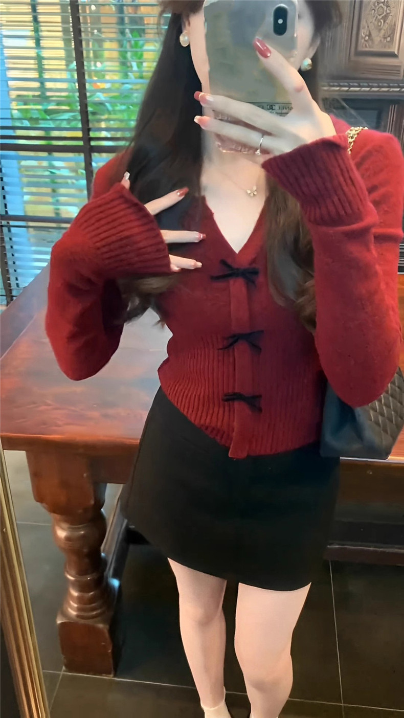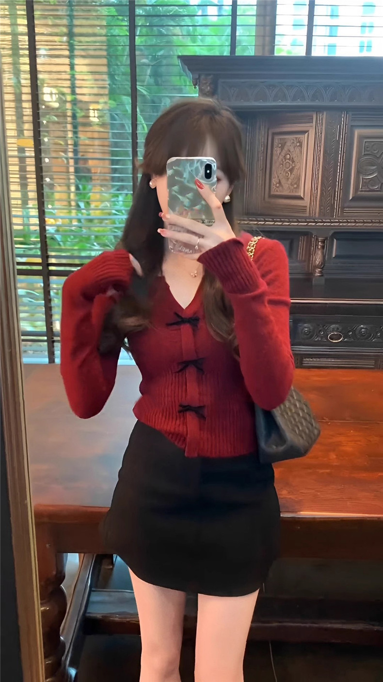 早秋穿搭蝴蝶結紅色毛衣女秋冬季2025慵嬾高級感內搭打底針織上衣