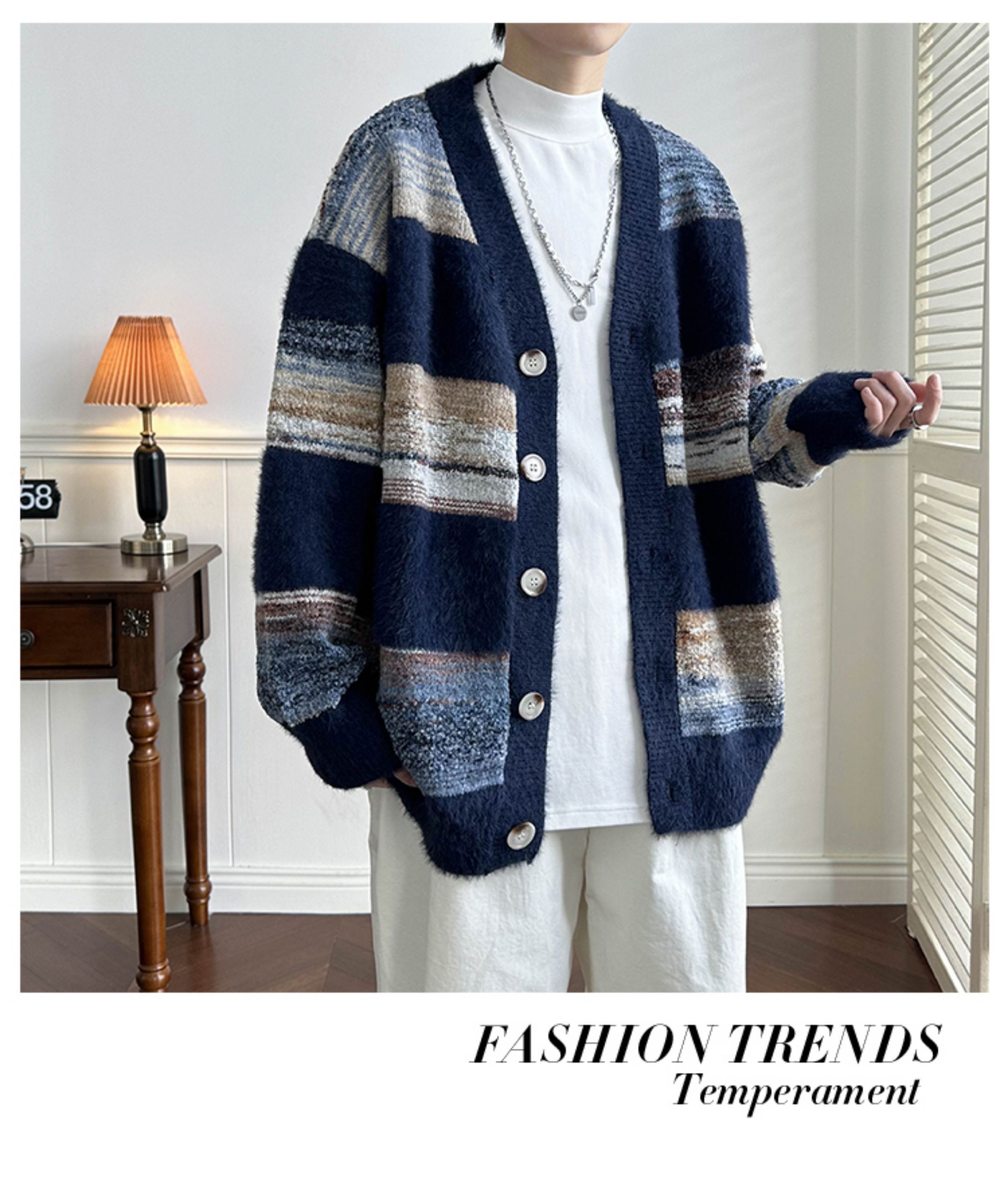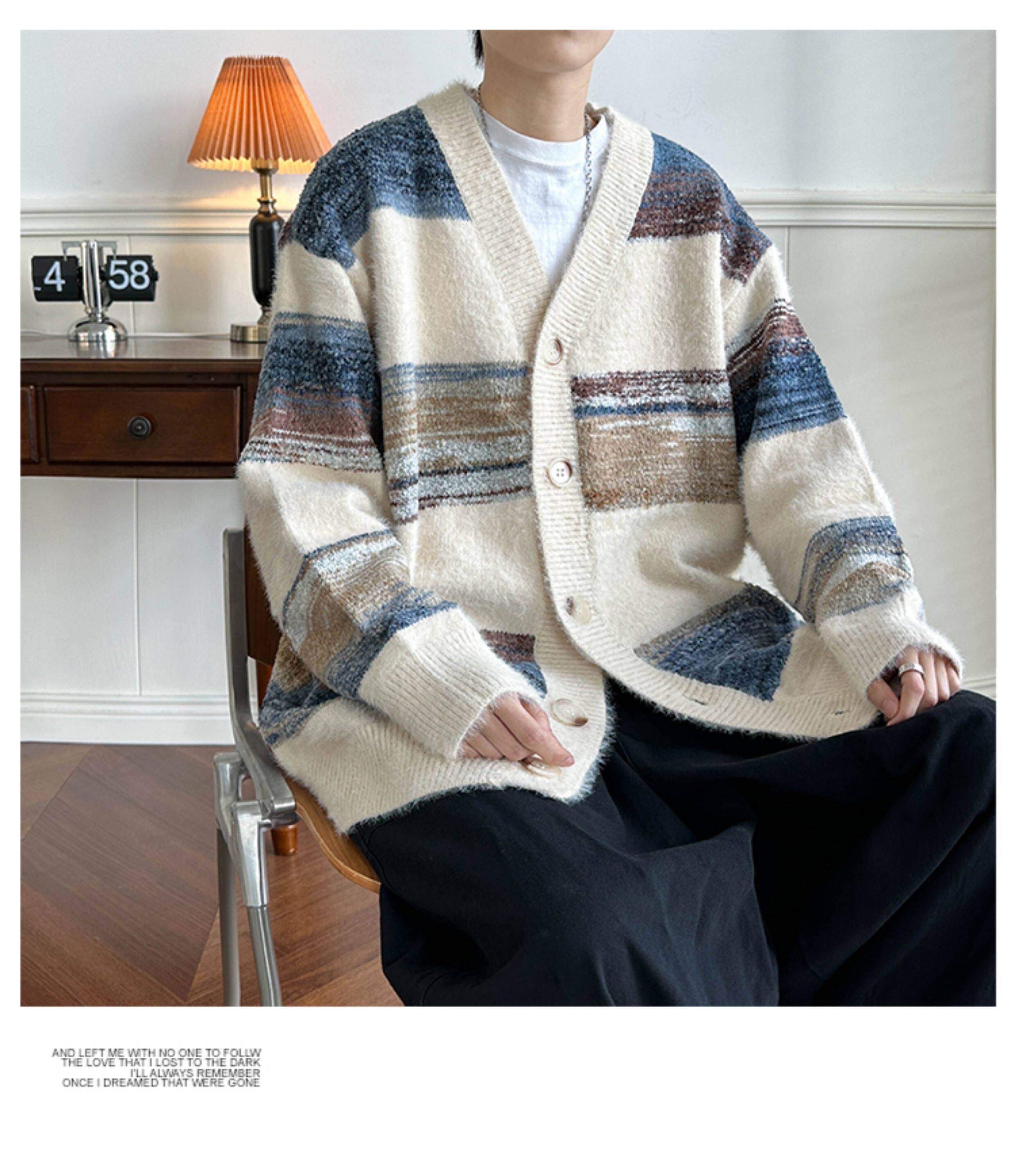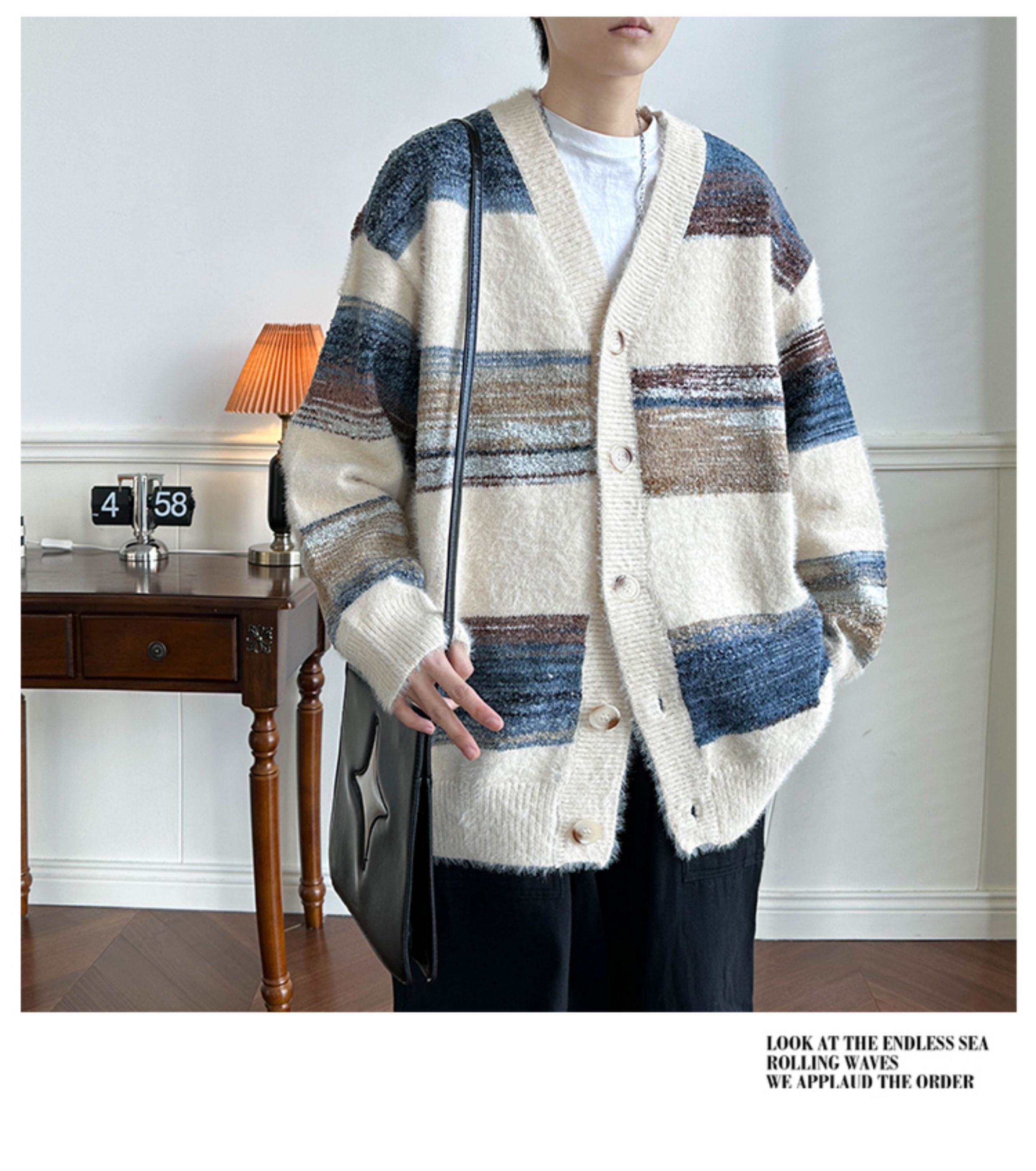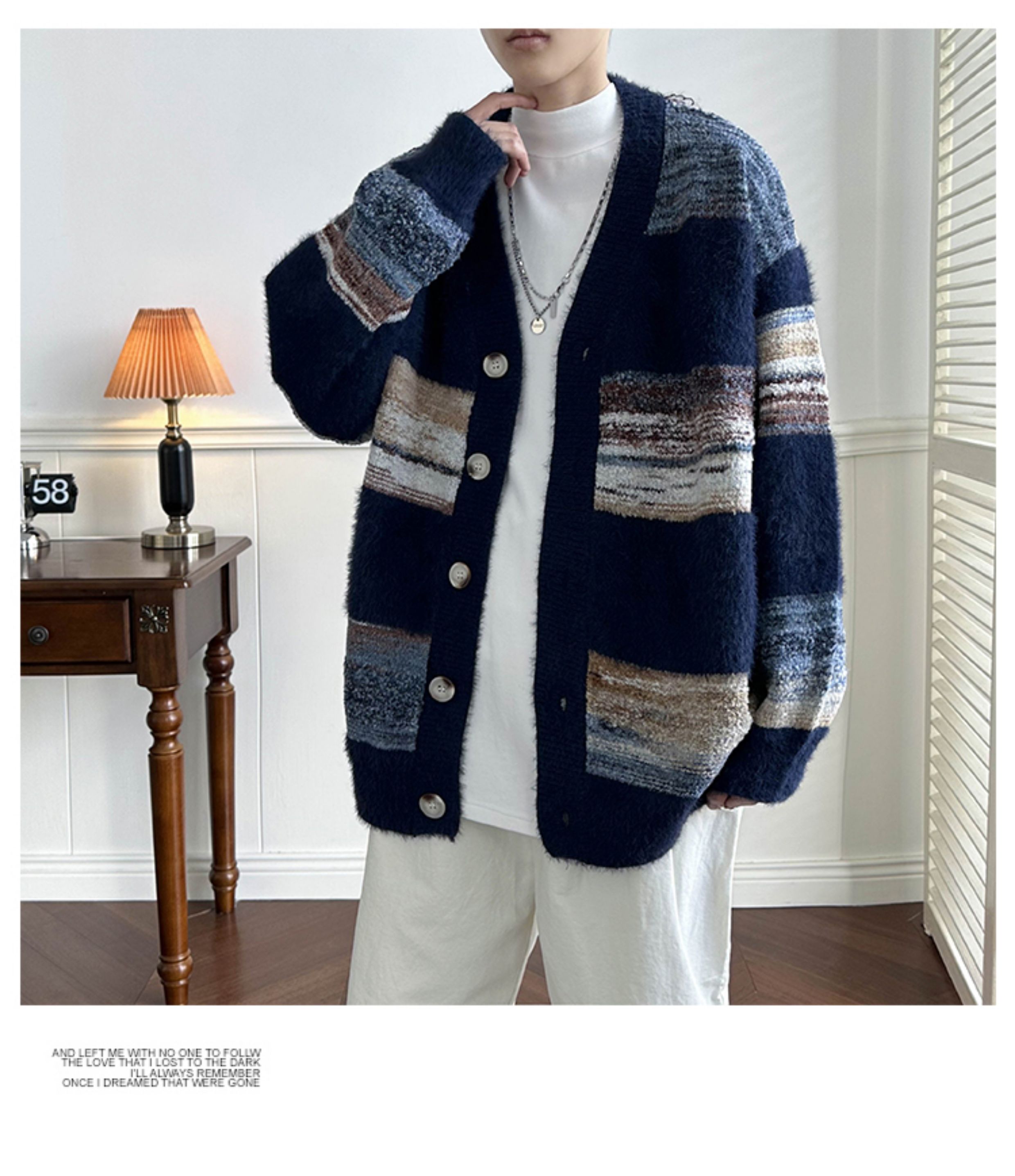秋冬季拼色開衫毛衣美式復古情侶男針織衫潮牌ins寬松慵懶風外套